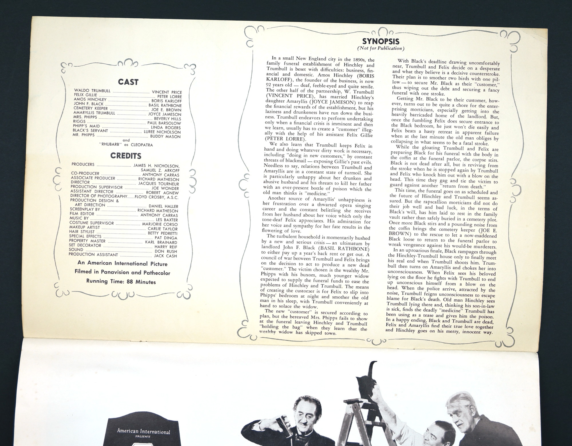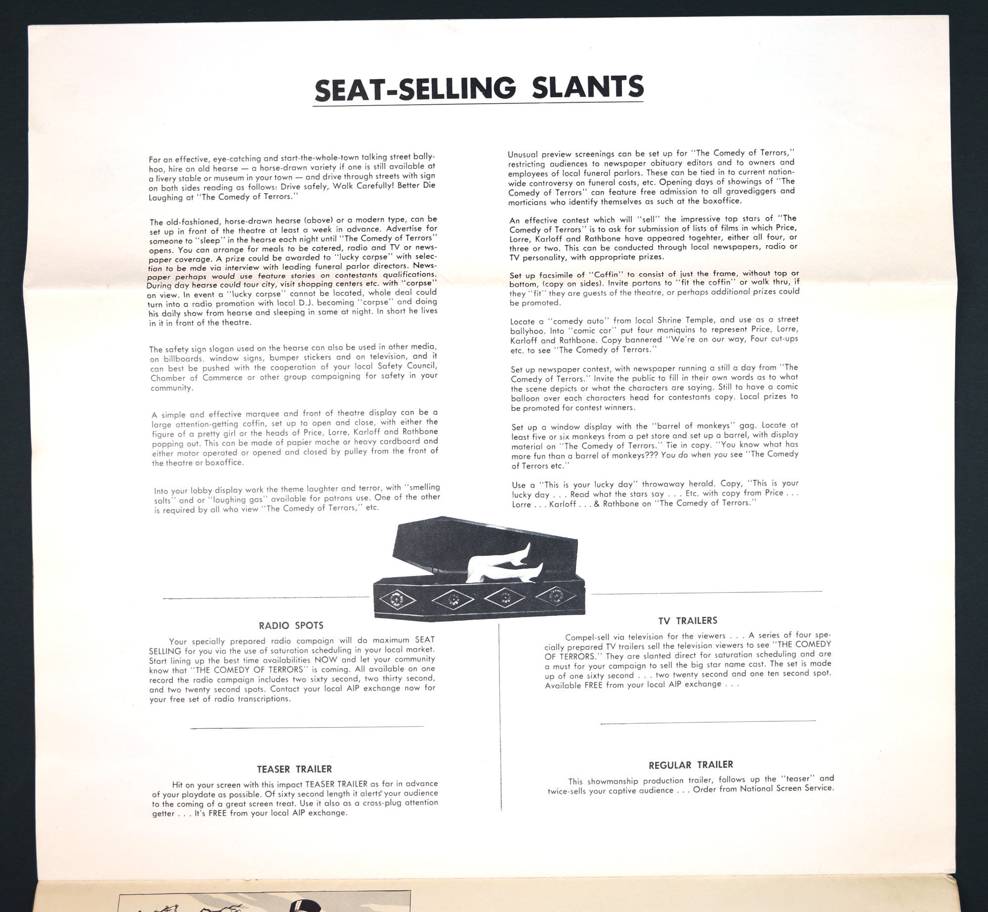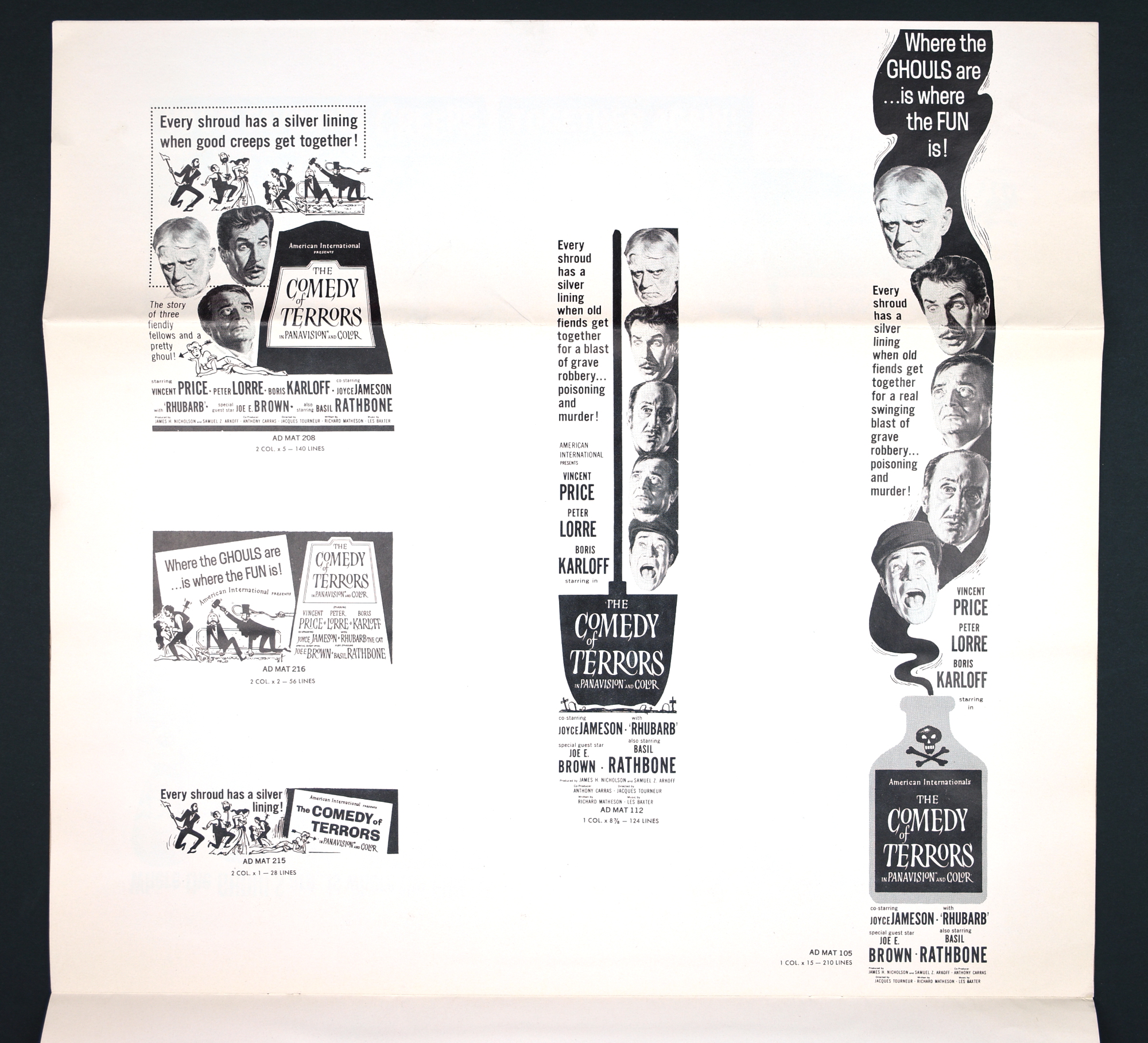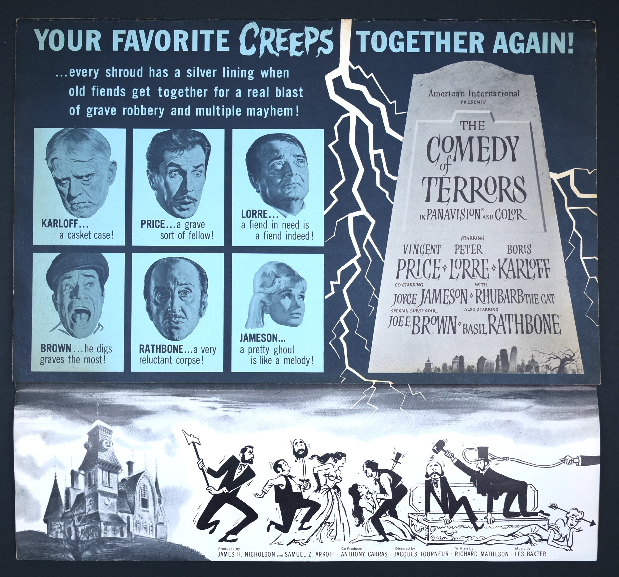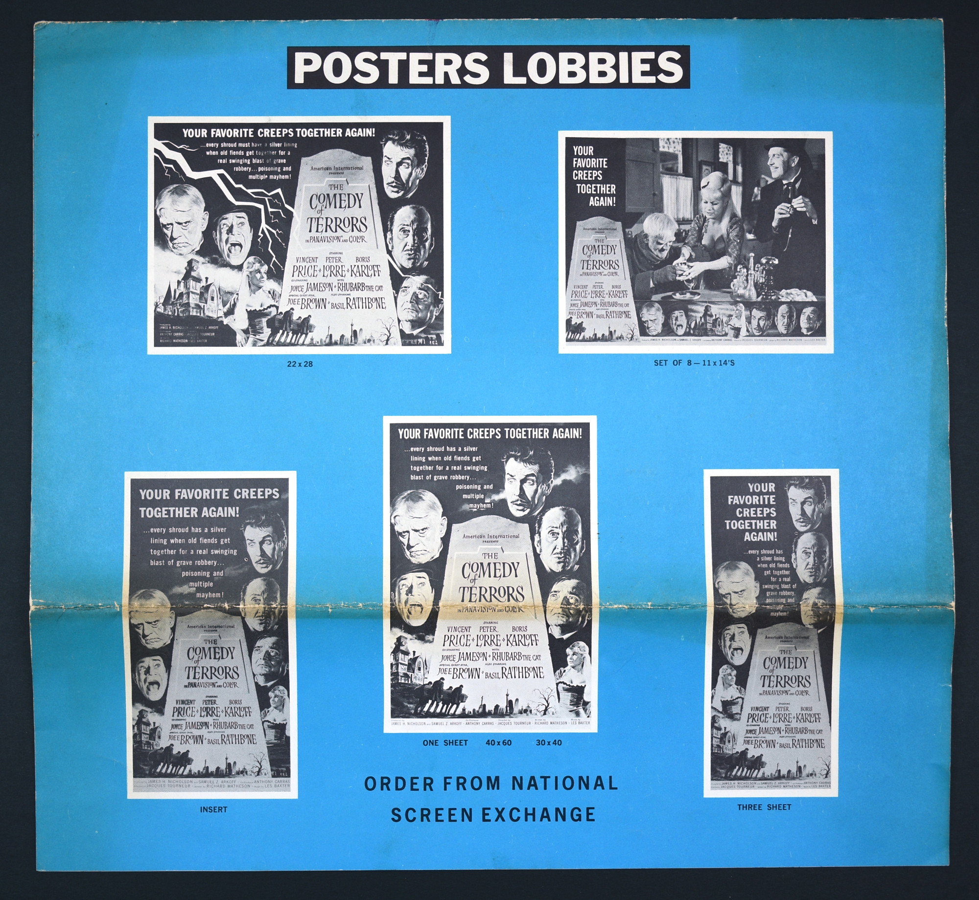 The Comedy of Terrors pressbook is filled with promotion: articles on the notable cast, lots of ballyhoo, and suitably black-humored illustrations. There's even an exclusive caricature and an interview record to hype the movie. Here's the comic book reader version: Download Comedy of Terrors Pressbook