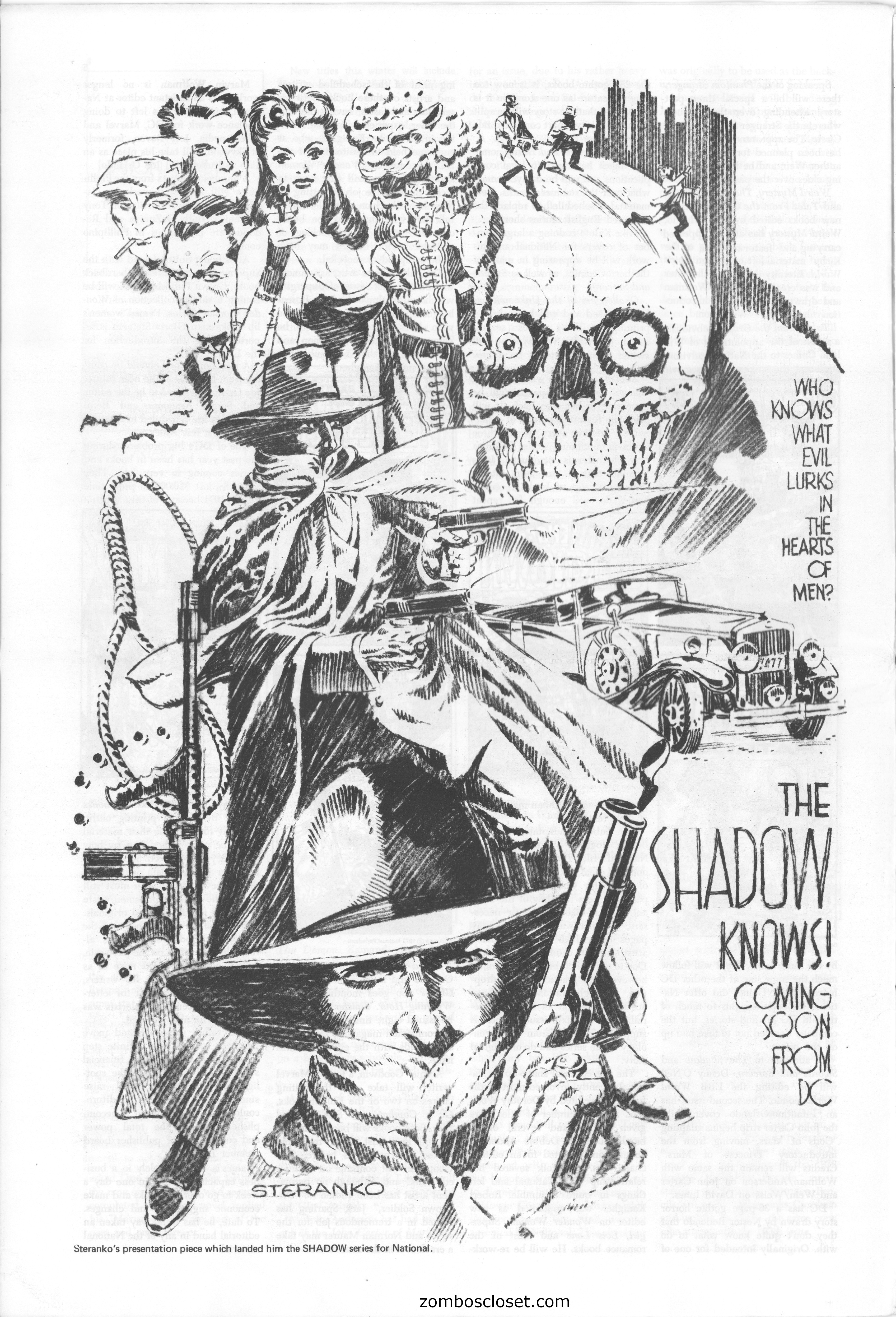 From the first issue of Comixscene (1972), Jim Steranko's news and history newspaper for comics art, come this Doc Savage centerfold and The Shadow splash page. The centerfold has Steranko's Doc surrounded by images from other notable artists. The splash page is the image that netted Steranko's work for The Shadow with DC. Both are awesome. Comixscene was very much like The Monster Times, although with less graphics and more text for each article. In his comics work, Steranko brought a new, adult intensity to his layouts, characters, and action sequences, melding pop art elements within the comic page that were mind-bending and ground-breaking for young guys like me reading his Nick Fury Agent of S.H.I.E.L.D. My favorite memory of him is when I saw him during an early Phil Seuling-organized comic convention, behind his table, with two femme fatales at his sides. He was smartly dressed to the nines, and completely not conforming to the usual decorum for comic artists back then. I still don't know if he was doing a put on or he was serious, but man, he could draw like no one else so why not act like it? As I recall, he was also around my height (that would be…not tall), and he dabbled in escapology (which I was also doing at the time), so he reminded me of Houdini. He had the that tough, secure attitude too.