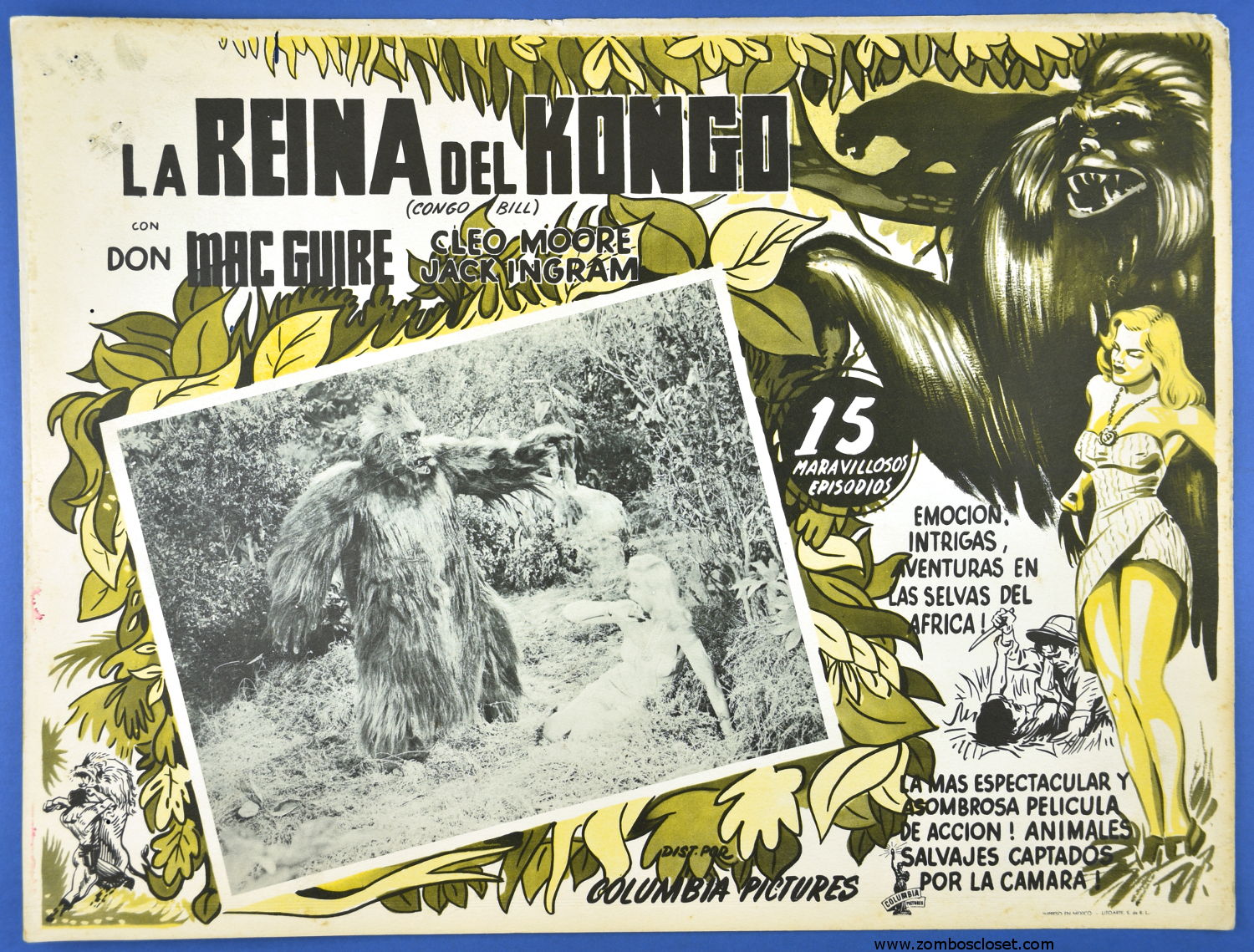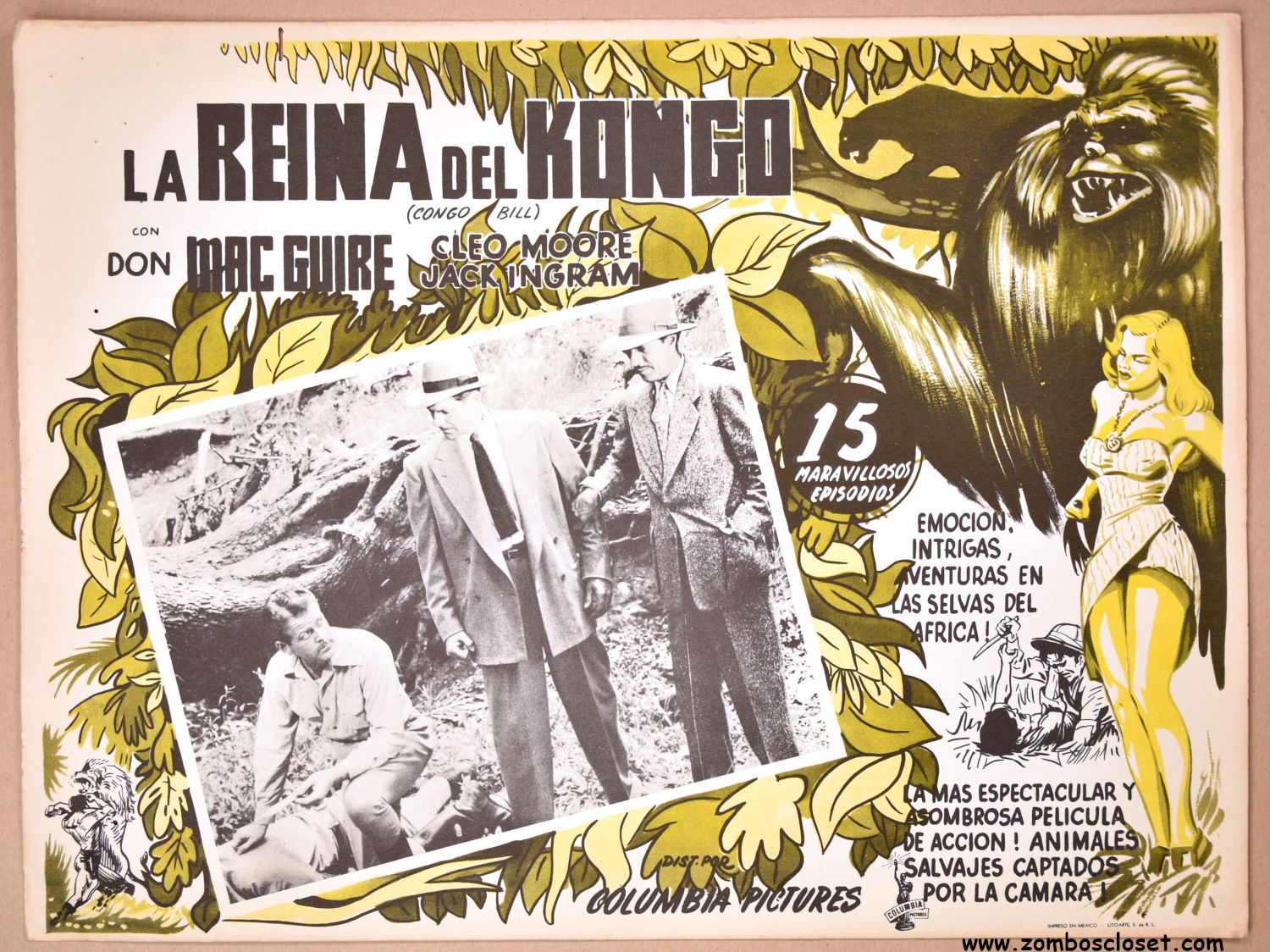 There's something fascinating about the girls and gorillas thematic that was a Hollywood bad habit that hit its zenith in the 1940s, along with mad scientists and gorillas. Of course, the most notable is King Kong (1933), but there were many movies plotting along this theme. Here's the Mexican lobby card for the Congo Bill Columbia Pictures 15 chapter serial. While it may all appear rather silly now to watch an actor in a gorilla suit carrying an unconscious woman in his arms, try to imagine as if you were sitting in a grand, single screen, theater in the 1940s. (Here's the Congo Bill pressbook.)