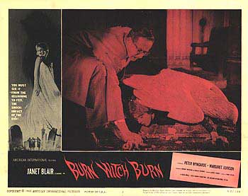 As part of the initial research for this article (in the early 1990s) an excellent 16mm print of Burn Witch, Burn (the title reads Burn, Witch, Burn) was borrowed from the personal collection of Film Scholar William K Everson. He mentioned that it was, in fact, an American TV print. It contained the opening incantation but not a credit for George Baxt. An on-screen credit reads "from the story by Fritz Leiber." Presumably, for most TV screenings of this film, the opening section was fast forwarded to the opening credits. In the few times I had caught a TV screening I had never seen the opening section.