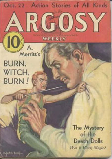 Burnwitchburn02Mystery and horror author Abraham Merritt published a novelette titled Burn, Witch, Burn in the Oct 22, 1932 issue of Argosy, subtitled The Mystery of the Death Dolls – Was it Black Magic? It soon appeared as a book and by 1936 was used as a basis for the 1936 film The Devil Doll, directed by Tod Browning. Merritt (1884-1943), who was a contemporary of H. P. Lovecraft, also penned bizarre tales such as The Moon Pool, The Metal Monster, Seven Footprints to Satan, and Creep Shadow! and was credited in the titles.