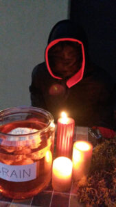 I always greeted them with a friendly cackle and a warm smile, and escorted them to the table where my assistant, Creepy, gave them their candy treats and a spooky pencil or some such. Next, if they dared, they got to touch Uncle Edgar’s brain, floating in a big jar of formaldehyde. Few turned down that opportunity! Before they left, I always offered them a bug or spider, caught at the back of the house, and, to the female trick-or-treaters, a mouse, caught in the cellar. Oh, I’d keep the mice in a box and if they wanted one, I’d reach in, catch one by the tail, and try to put it in their loot bag while the little critter squirmed and twisted. Sometimes it was hard to hit the loot bag and the mouse would squirm up their arms or hands. It was fun to hear them squeal.