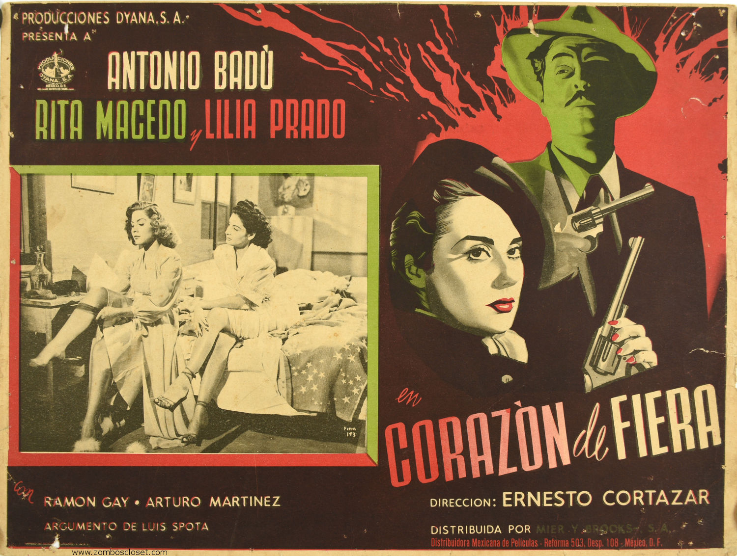The strong illustration on this Mexican lobby card for Corazon De Fiera hooked me. The cool as ice expressions on the gun-toting characters, the splatter of blood in the background, and the color choices carry a strong impact to entice the potential moviegoer.