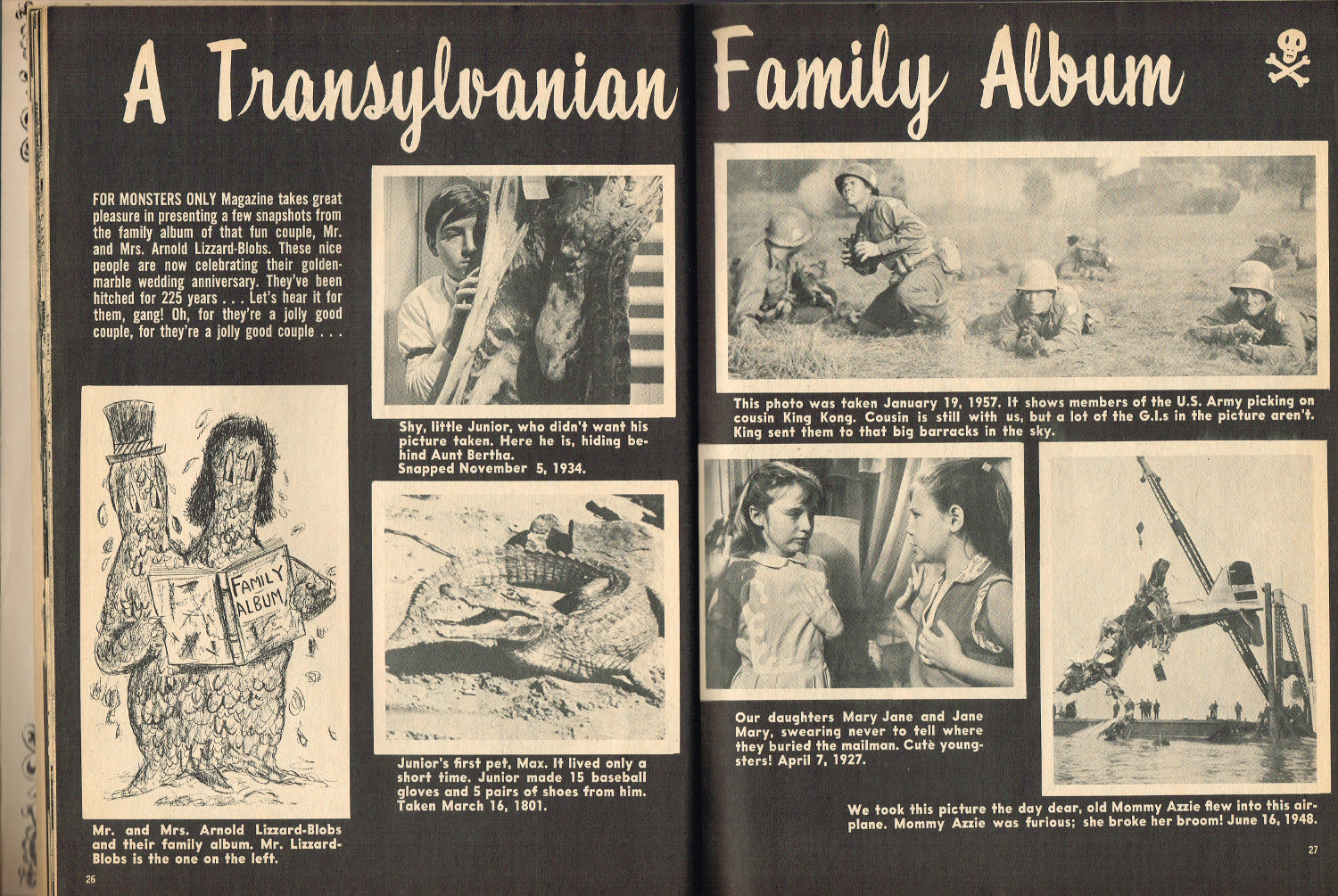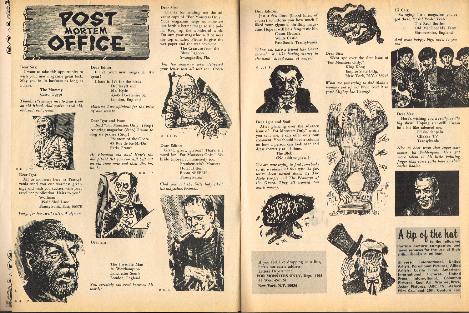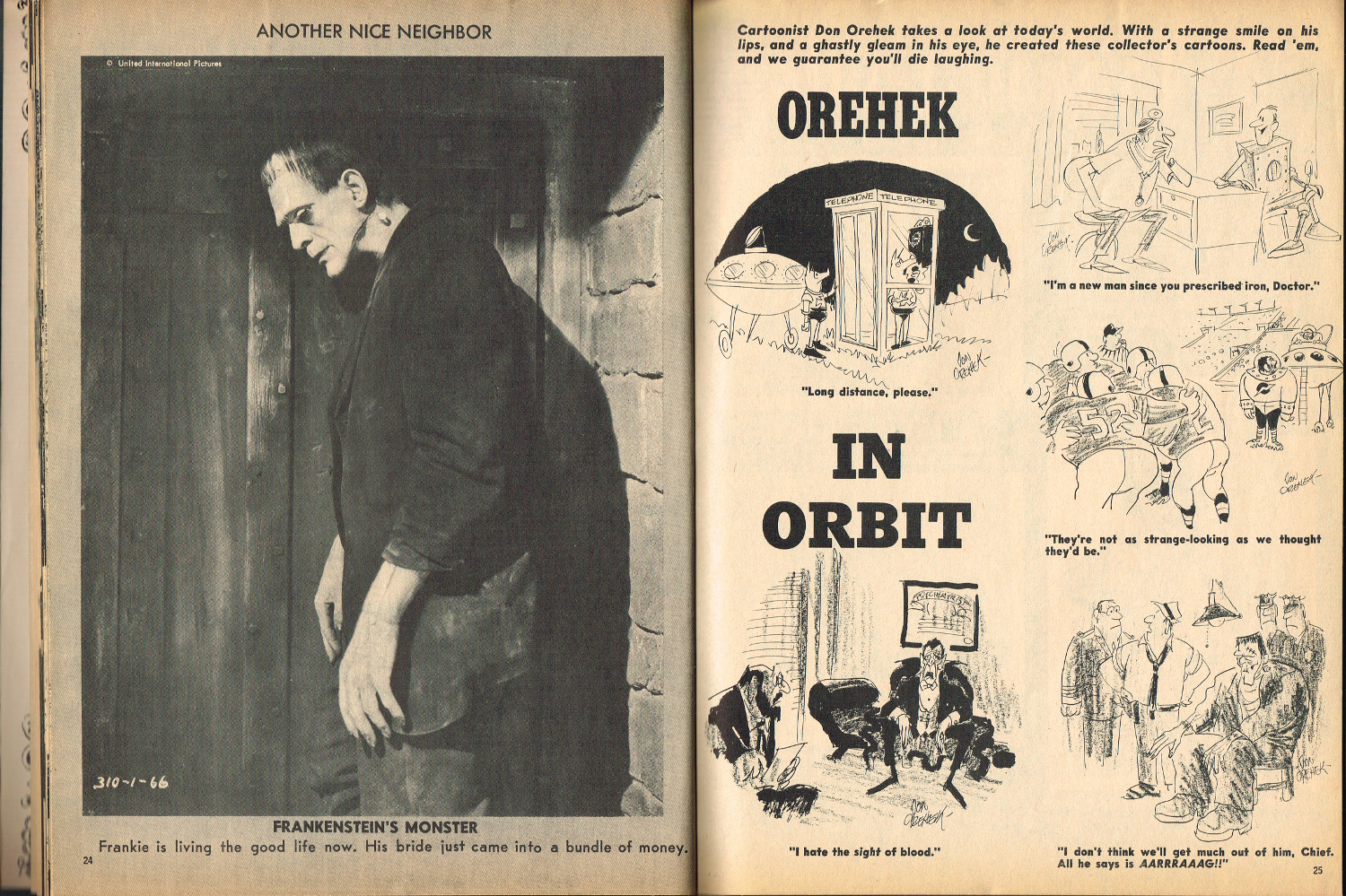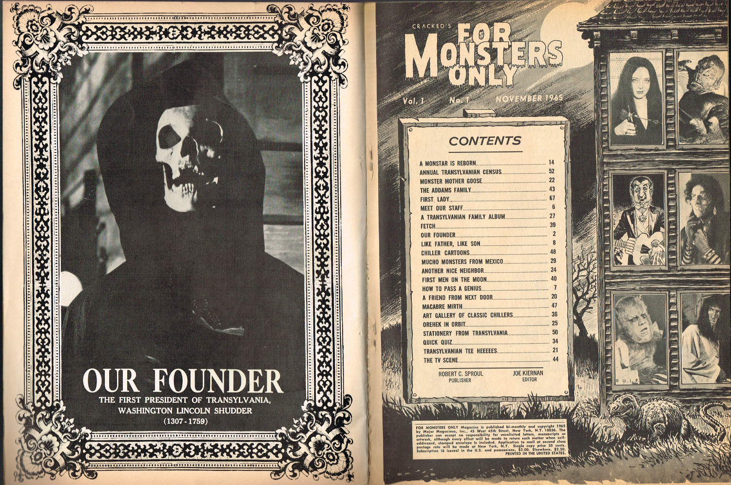 In 1965, the corner store's magazine rack was filled with monster magazines and young monsterkids reaching up to grab them. Gorged on the zany, horror host, hosted Shock! television packages of classic (and spastic) horror and science fiction movies, monsterish humor was all the rage by the middle 1960s. It would take the 1970s and maturing monsterkids to clamor for more sophisticated reading, but until then, blame Forrest J. Ackerman's Famous Monsters of Filmland for making horror movies fun and cool by poking a little fun and a lot of puns their way. Carrying the humor to the extreme was Cracked's For Monsters Only. Cartoons, wacky John Severin drawn comics, and photo-captioned mutants, aliens, monsters, and other assorted nasties went for the readers funny bone instead of his or her jugular vein. Here's issue 1.