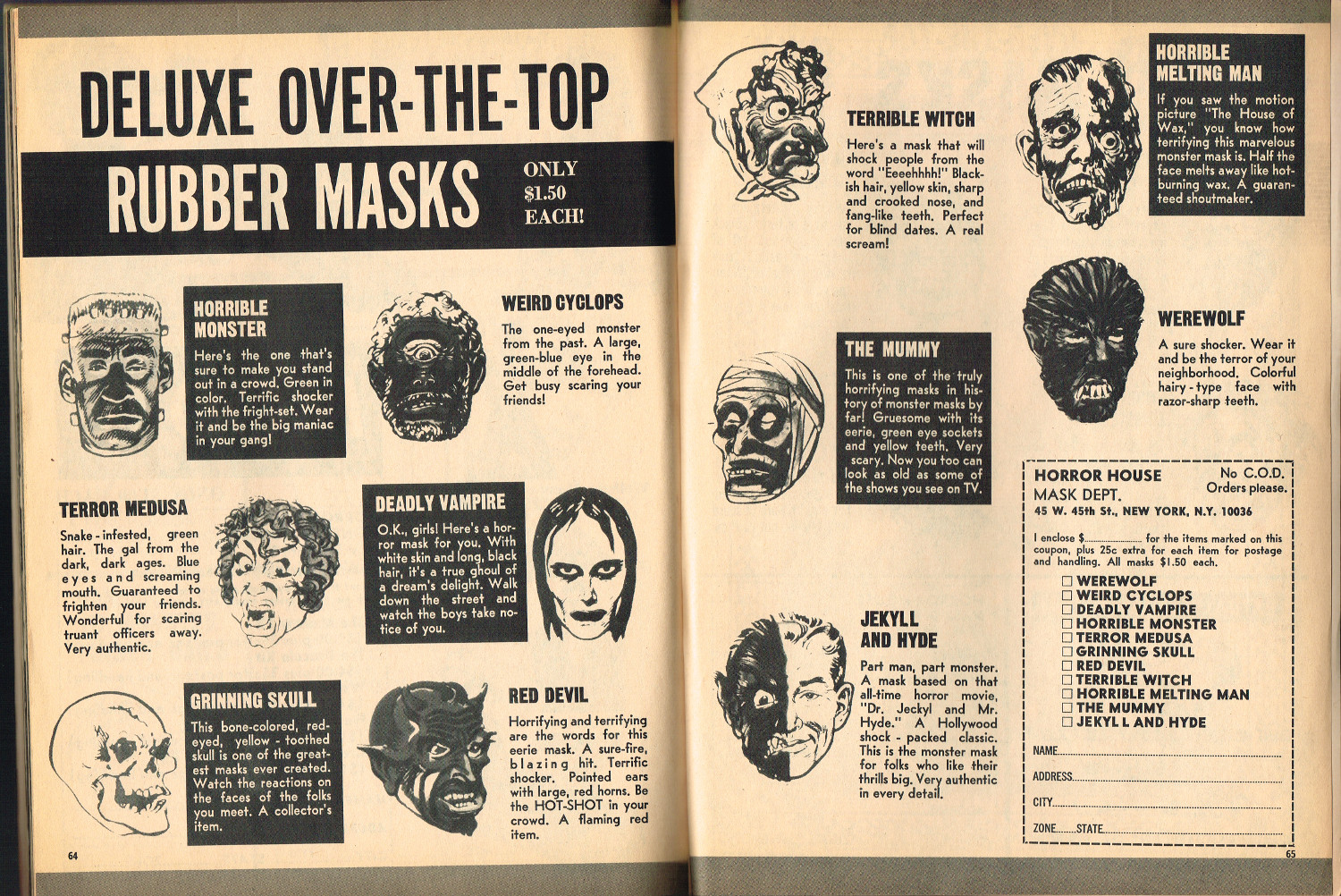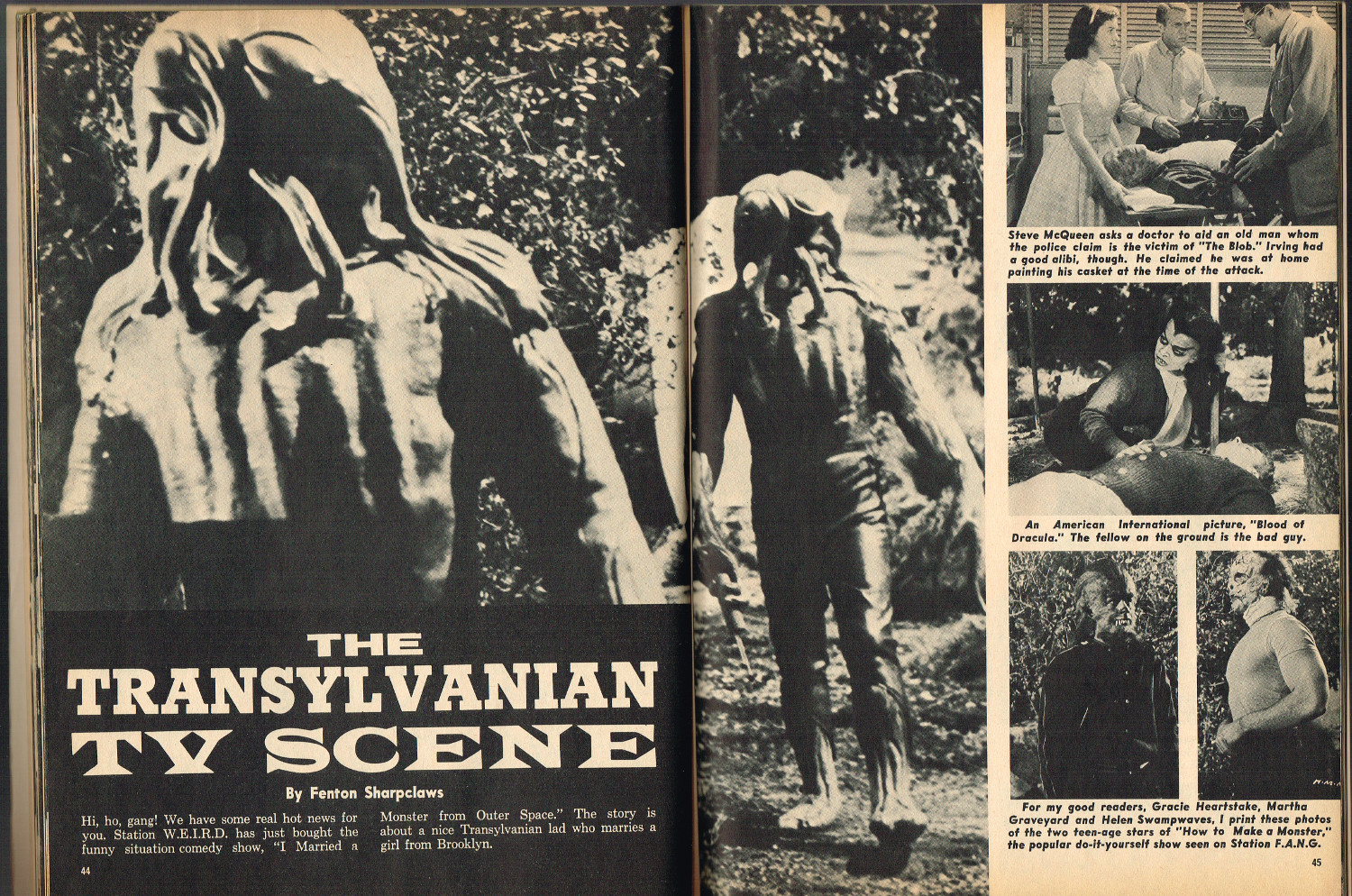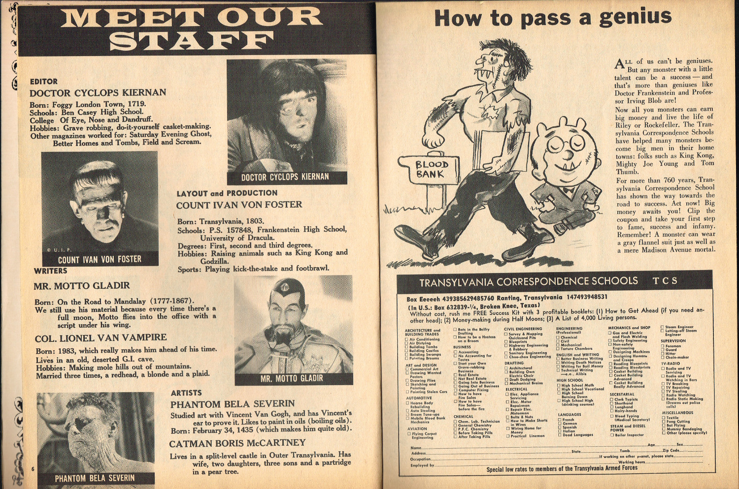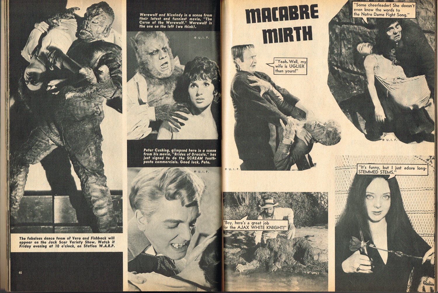 In 1965, the corner store's magazine rack was filled with monster magazines and young monsterkids reaching up to grab them. Gorged on the zany, horror host, hosted Shock! television packages of classic (and spastic) horror and science fiction movies, monsterish humor was all the rage by the middle 1960s. It would take the 1970s and maturing monsterkids to clamor for more sophisticated reading, but until then, blame Forrest J. Ackerman's Famous Monsters of Filmland for making horror movies fun and cool by poking a little fun and a lot of puns their way. Carrying the humor to the extreme was Cracked's For Monsters Only. Cartoons, wacky John Severin drawn comics, and photo-captioned mutants, aliens, monsters, and other assorted nasties went for the readers funny bone instead of his or her jugular vein. Here's issue 1.