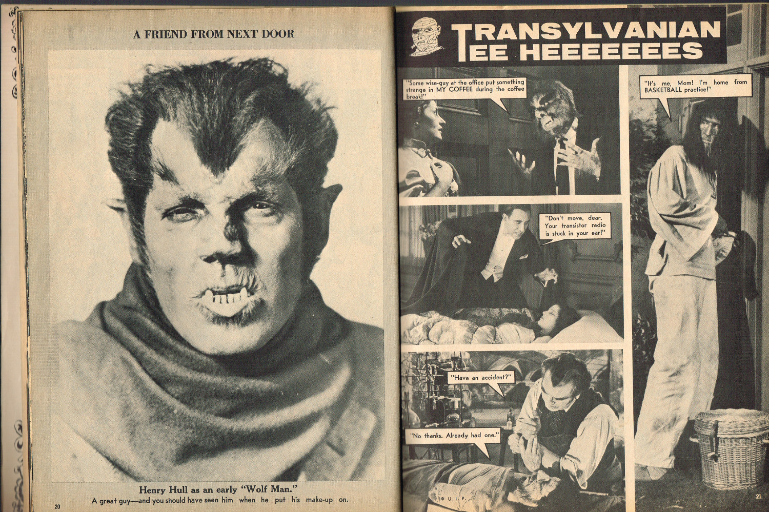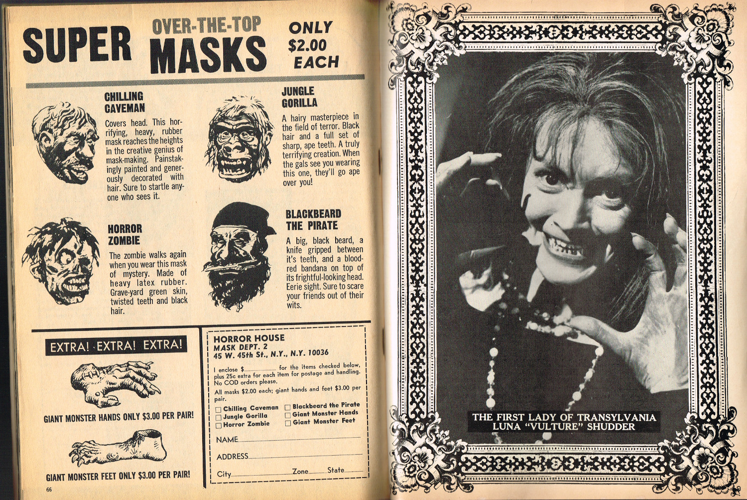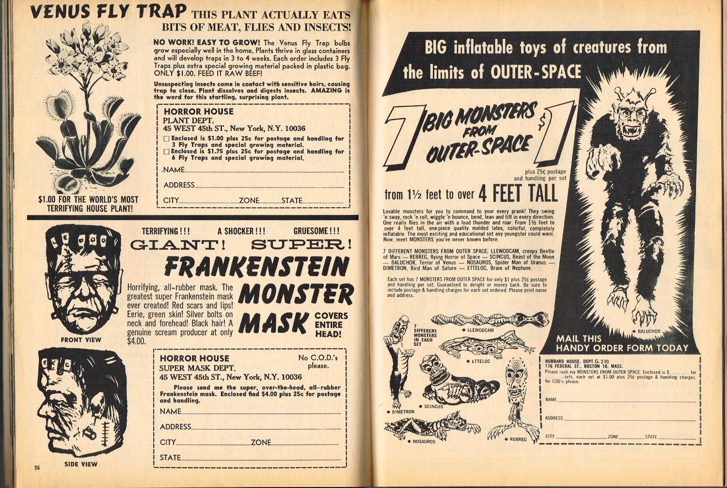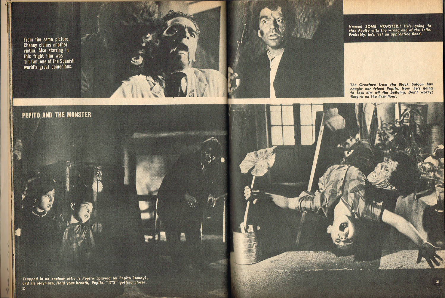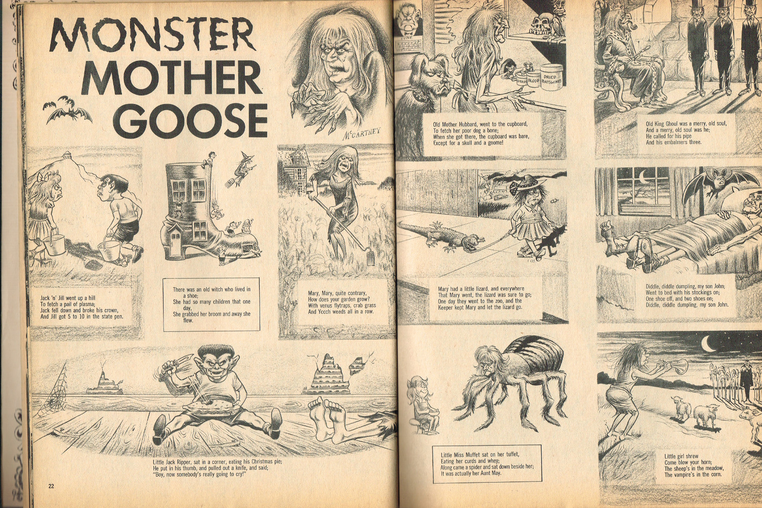 In 1965, the corner store's magazine rack was filled with monster magazines and young monsterkids reaching up to grab them. Gorged on the zany, horror host, hosted Shock! television packages of classic (and spastic) horror and science fiction movies, monsterish humor was all the rage by the middle 1960s. It would take the 1970s and maturing monsterkids to clamor for more sophisticated reading, but until then, blame Forrest J. Ackerman's Famous Monsters of Filmland for making horror movies fun and cool by poking a little fun and a lot of puns their way. Carrying the humor to the extreme was Cracked's For Monsters Only. Cartoons, wacky John Severin drawn comics, and photo-captioned mutants, aliens, monsters, and other assorted nasties went for the readers funny bone instead of his or her jugular vein. Here's issue 1.