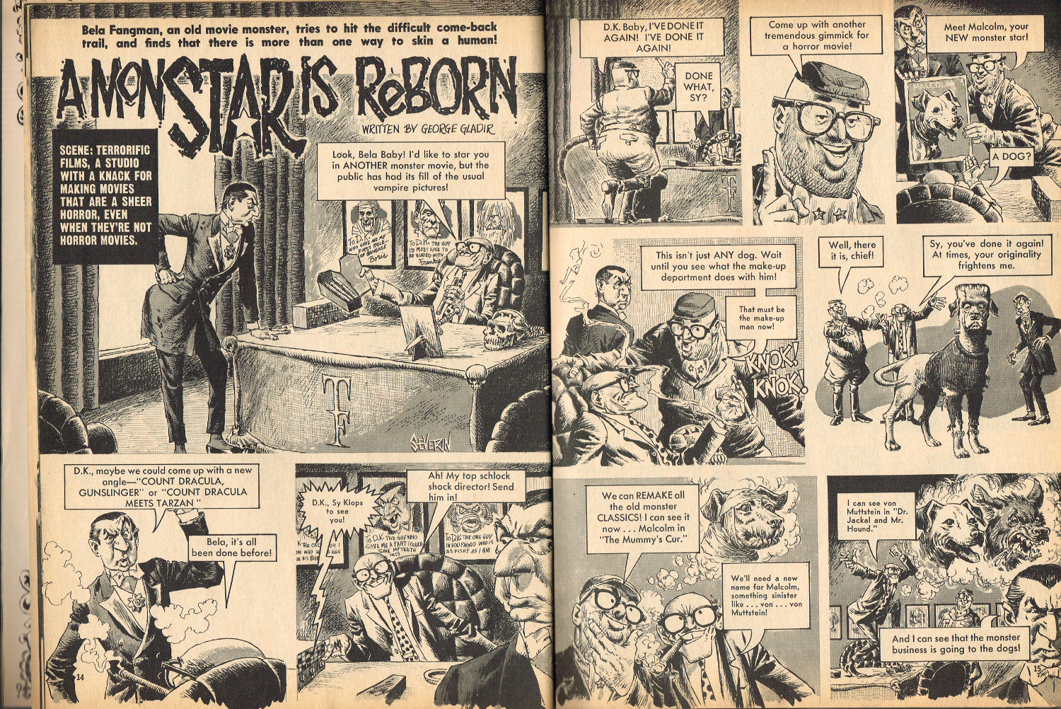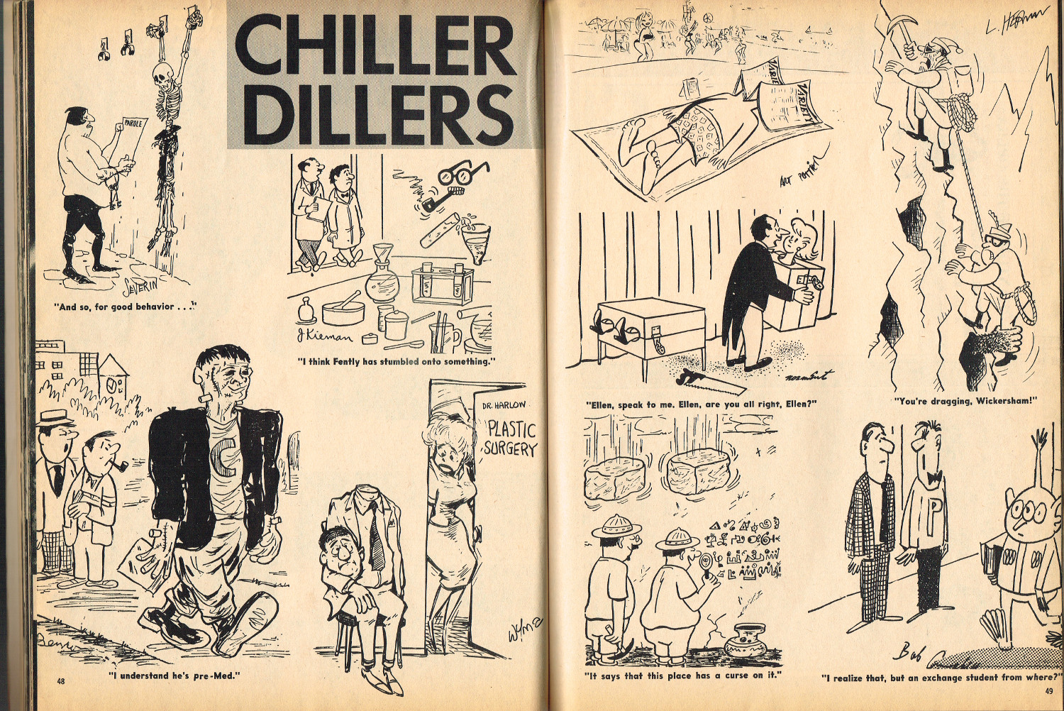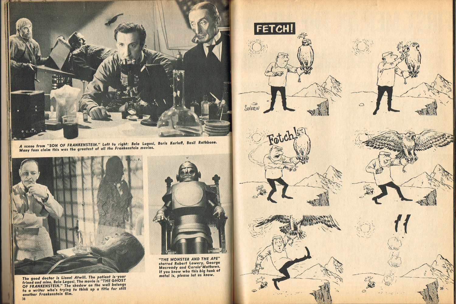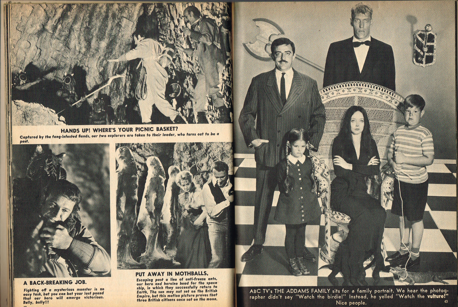 In 1965, the corner store's magazine rack was filled with monster magazines and young monsterkids reaching up to grab them. Gorged on the zany, horror host, hosted Shock! television packages of classic (and spastic) horror and science fiction movies, monsterish humor was all the rage by the middle 1960s. It would take the 1970s and maturing monsterkids to clamor for more sophisticated reading, but until then, blame Forrest J. Ackerman's Famous Monsters of Filmland for making horror movies fun and cool by poking a little fun and a lot of puns their way. Carrying the humor to the extreme was Cracked's For Monsters Only. Cartoons, wacky John Severin drawn comics, and photo-captioned mutants, aliens, monsters, and other assorted nasties went for the readers funny bone instead of his or her jugular vein. Here's issue 1.