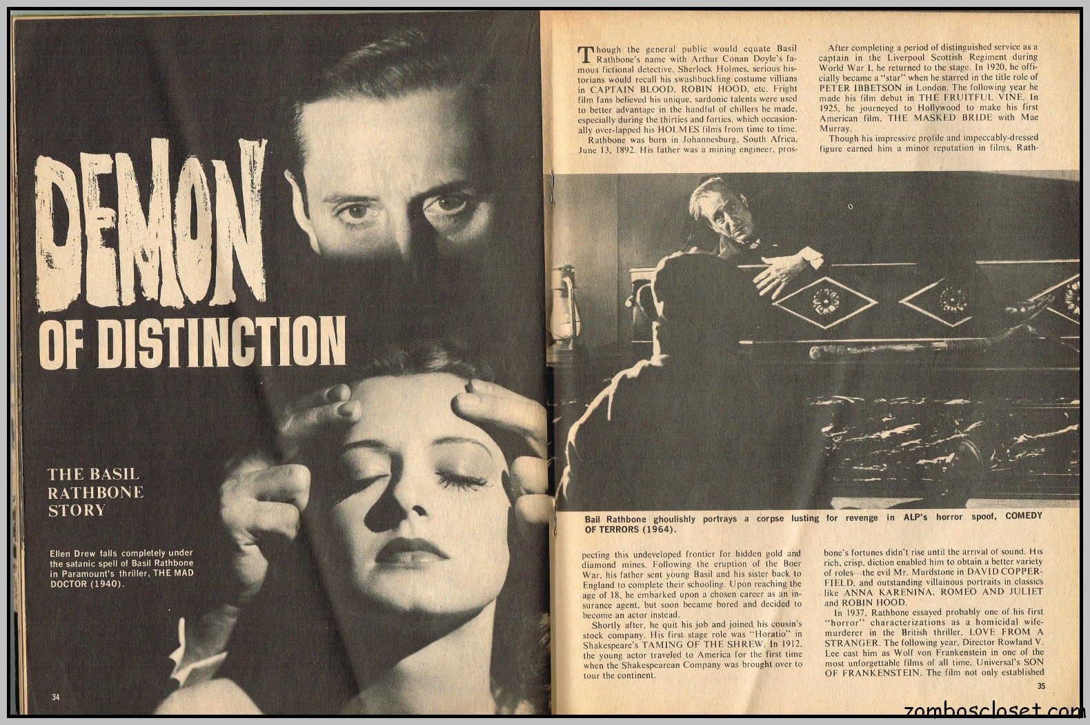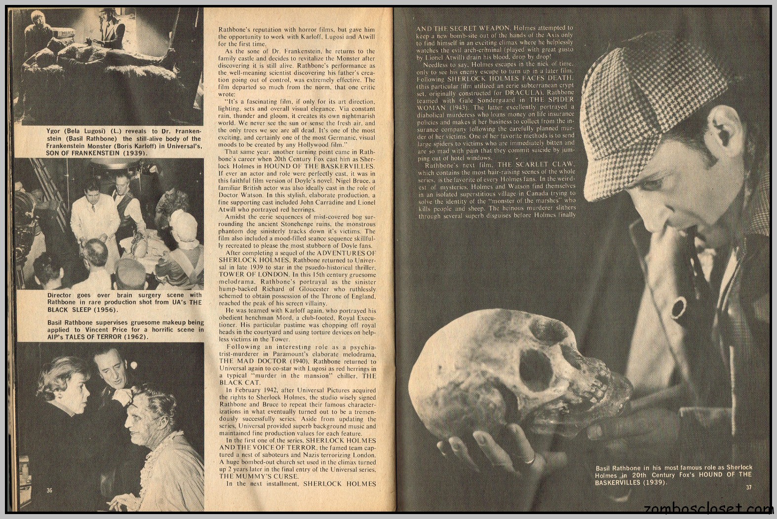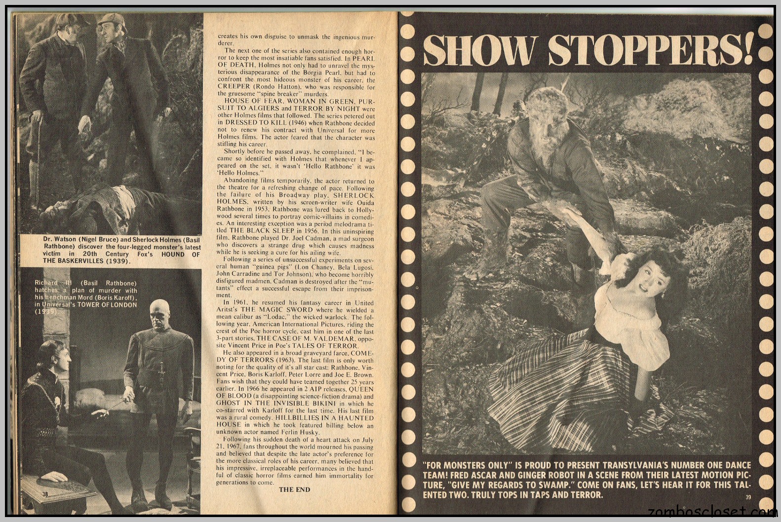 By the time this last issue of Cracked’s For Monsters Only magazine appeared on the shelves, more earnest coverage of classic and contemporary horror, along with the usual joking (or attempts at joking) photographs, filled the magazine, replacing the cartoons and humorous illustrations that overran earlier issues. With issue 9, “Cracked’s” was dropped from the title, perhaps in an attempt to attract the more serious horror fan. It didn’t work. But among the many cartoons, illustrations, and abundance of cheeky photographs in this magazine’s run, some articles, which focused on the classic horror stars, do stand out. In this last issue, Basil Rathbone is so honored.