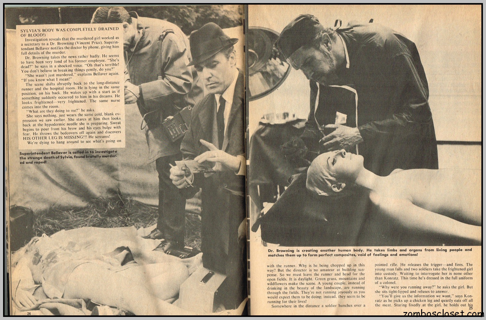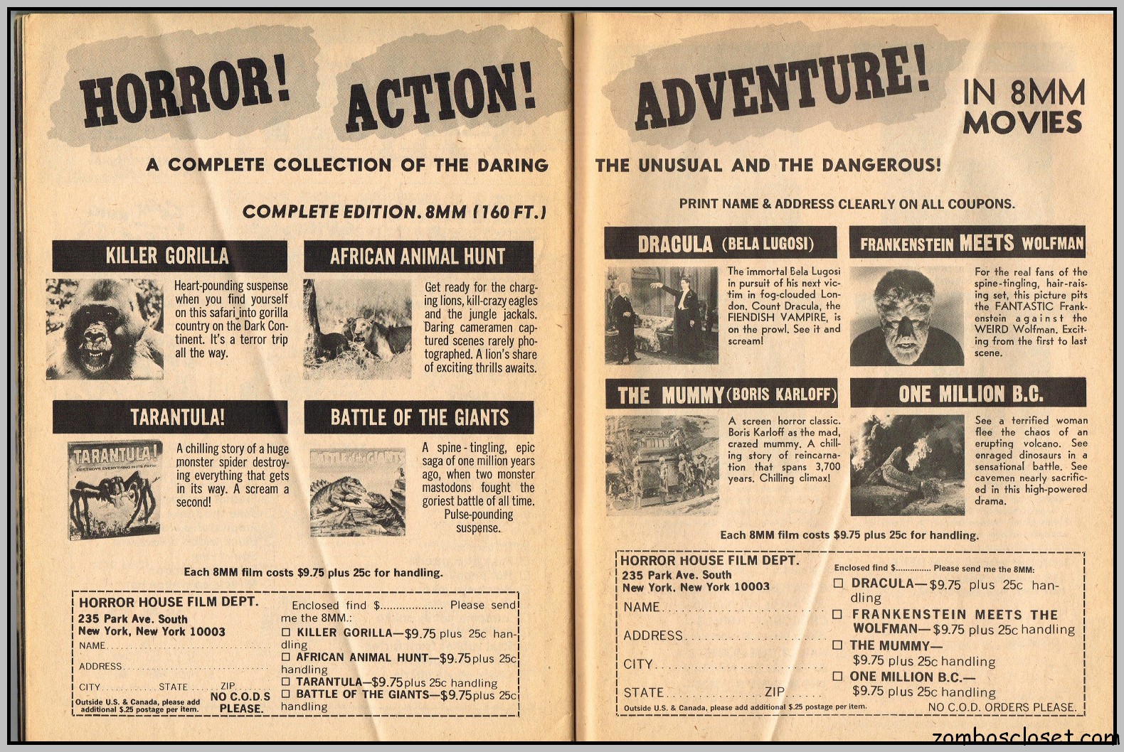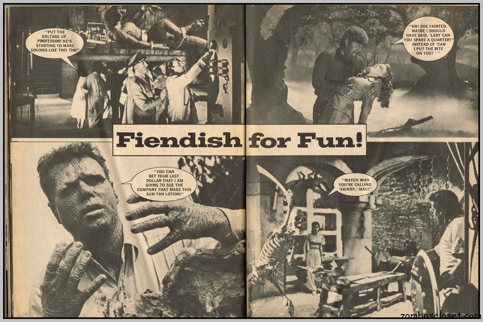 By the time this last issue of Cracked’s For Monsters Only magazine appeared on the shelves, more earnest coverage of classic and contemporary horror, along with the usual joking (or attempts at joking) photographs, filled the magazine, replacing the cartoons and humorous illustrations that overran earlier issues. With issue 9, “Cracked’s” was dropped from the title, perhaps in an attempt to attract the more serious horror fan. It didn’t work. But among the many cartoons, illustrations, and abundance of cheeky photographs in this magazine’s run, some articles, which focused on the classic horror stars, do stand out. In this last issue, Basil Rathbone is so honored.