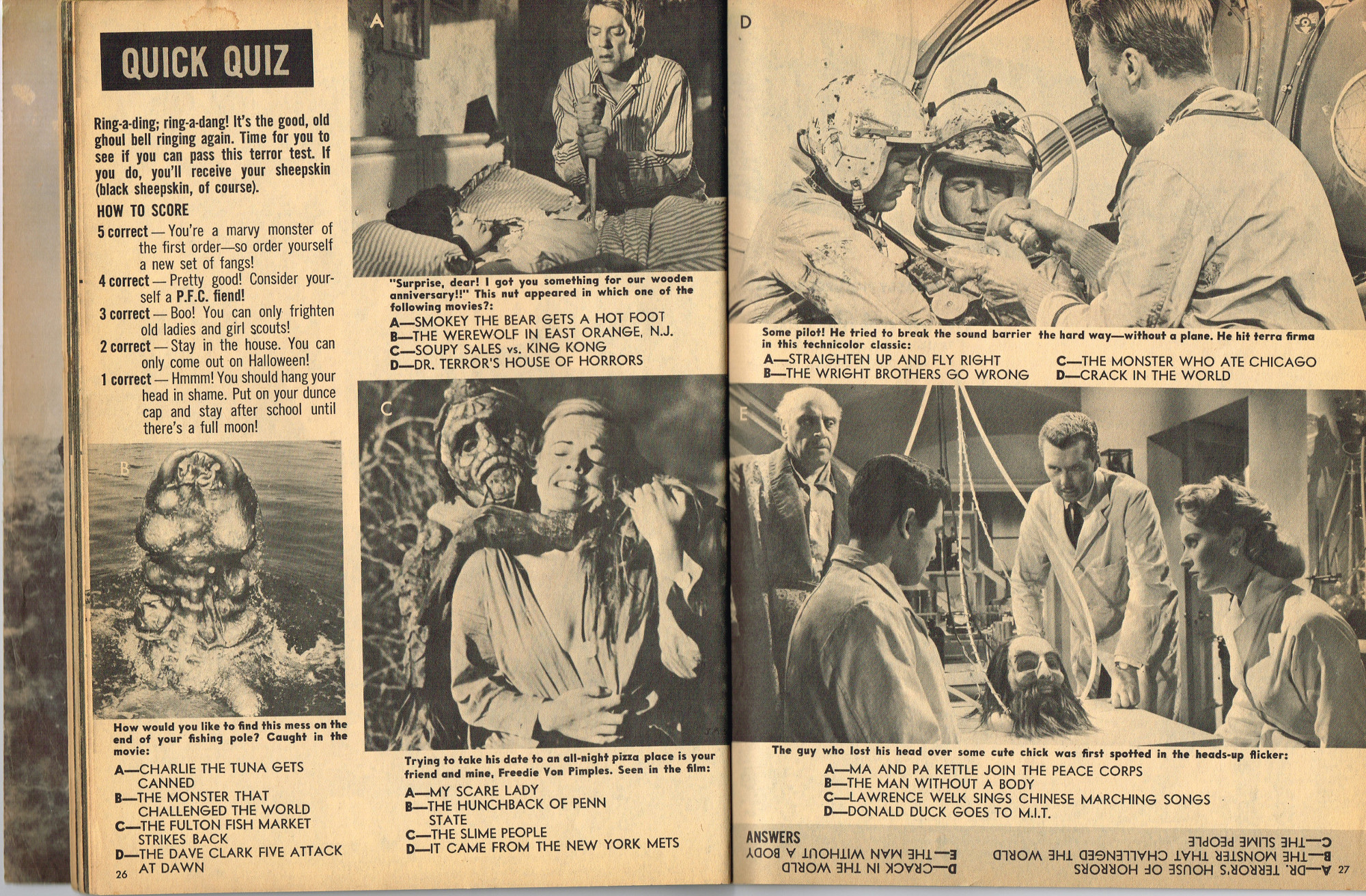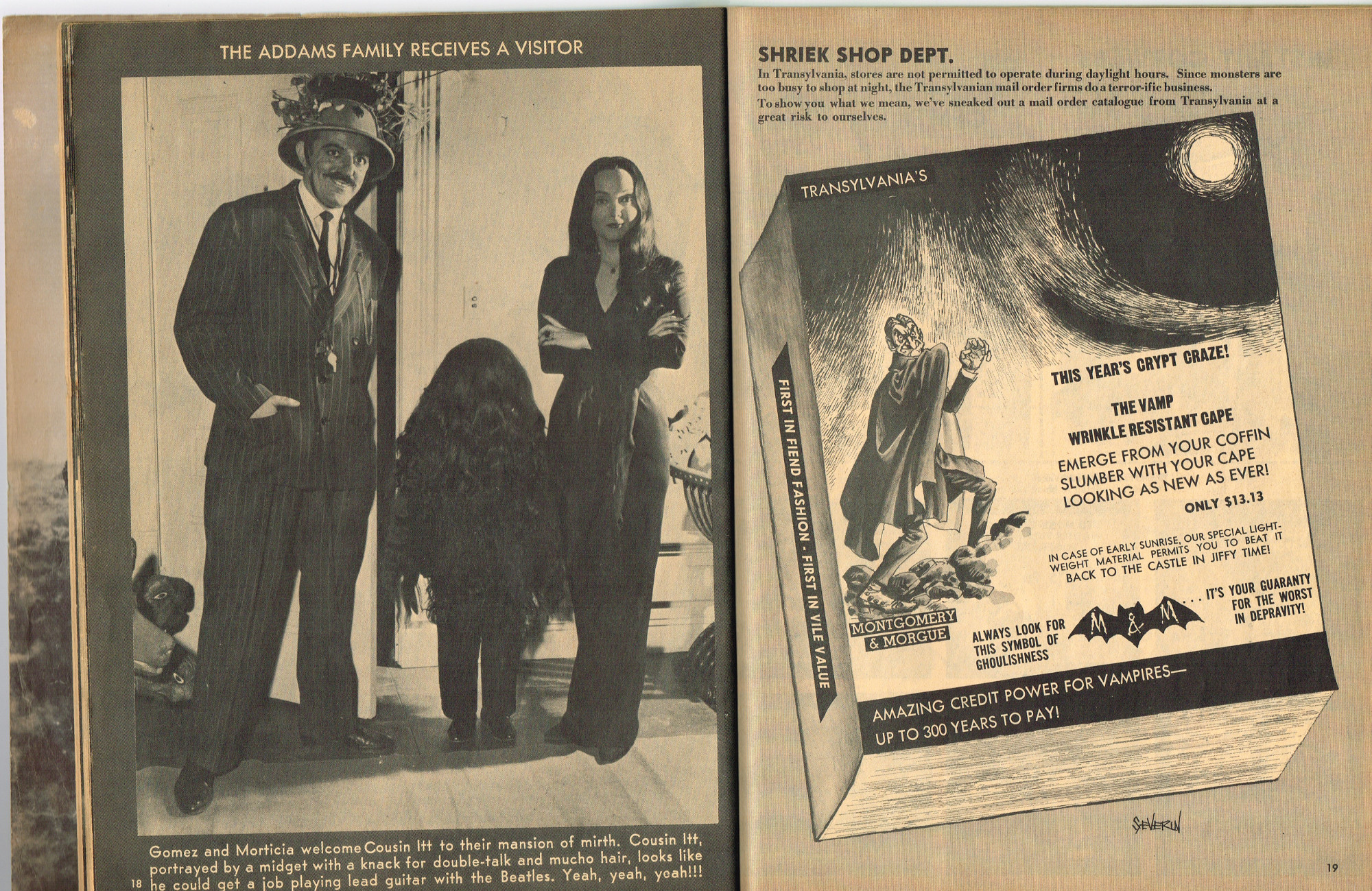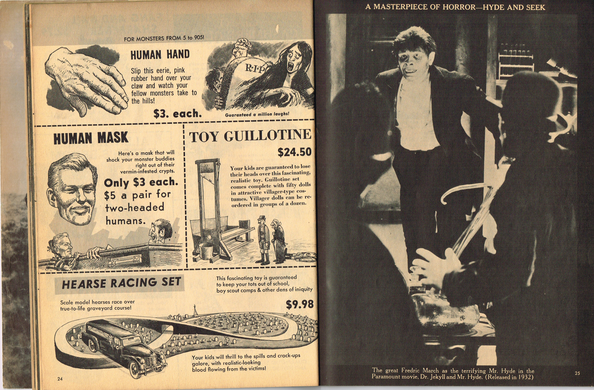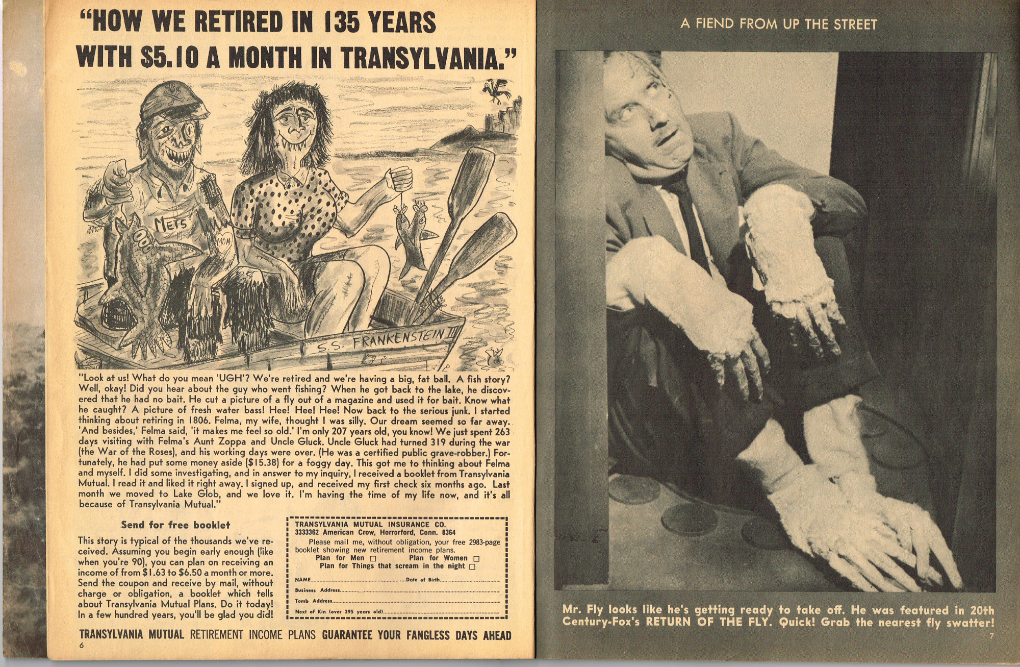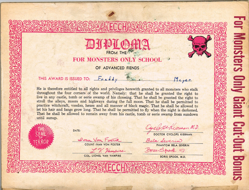 The previous owner of this copy of Cracked's For Monsters Only magazine must have treated it monstrously. I bet he read it, over and over again, in the wee hours of Saturday morning, with a flimsy flashlight held precariously in one hand as he flipped through the pages with the other. And when the pages started tearing away from the spine, due to so many page turnings, he taped them back in place. Maybe his name was Freddy Meyer, the person who wrote the same on the back cover's ECCH certificate. Or maybe Freddy was just one owner among many along the way. Or maybe this issue was owned by a girl who knew Freddy, and she borrowed it from him–Monsterkids stick together like slime and muck, you know–and she taped it for posterity because she liked Freddy, a lot, not knowing that iPad's and ebook readers would eventually eliminate the need for taping worn pages, and holding flashlights precariously under bedsheets in the wee hours of the morning.