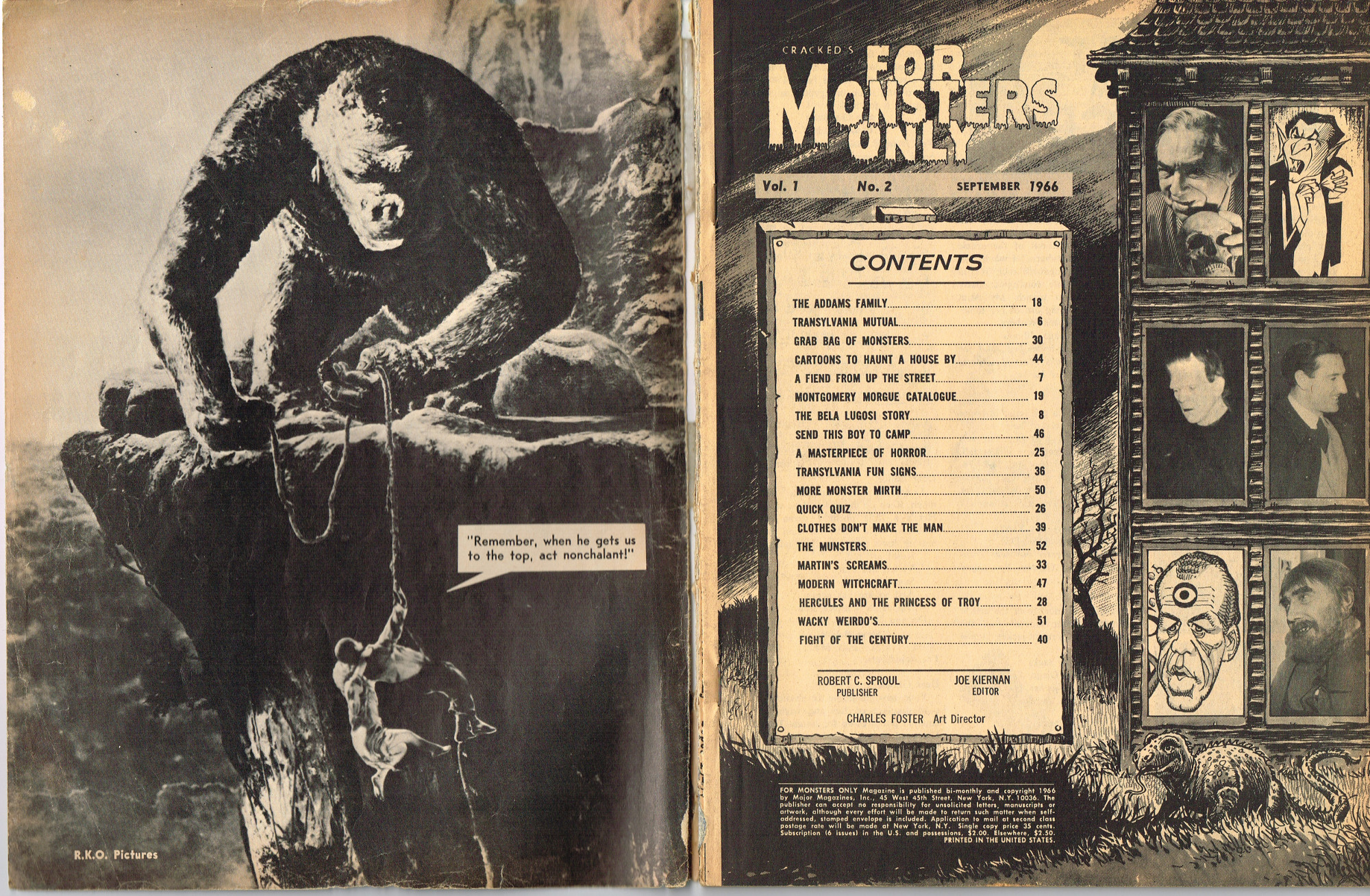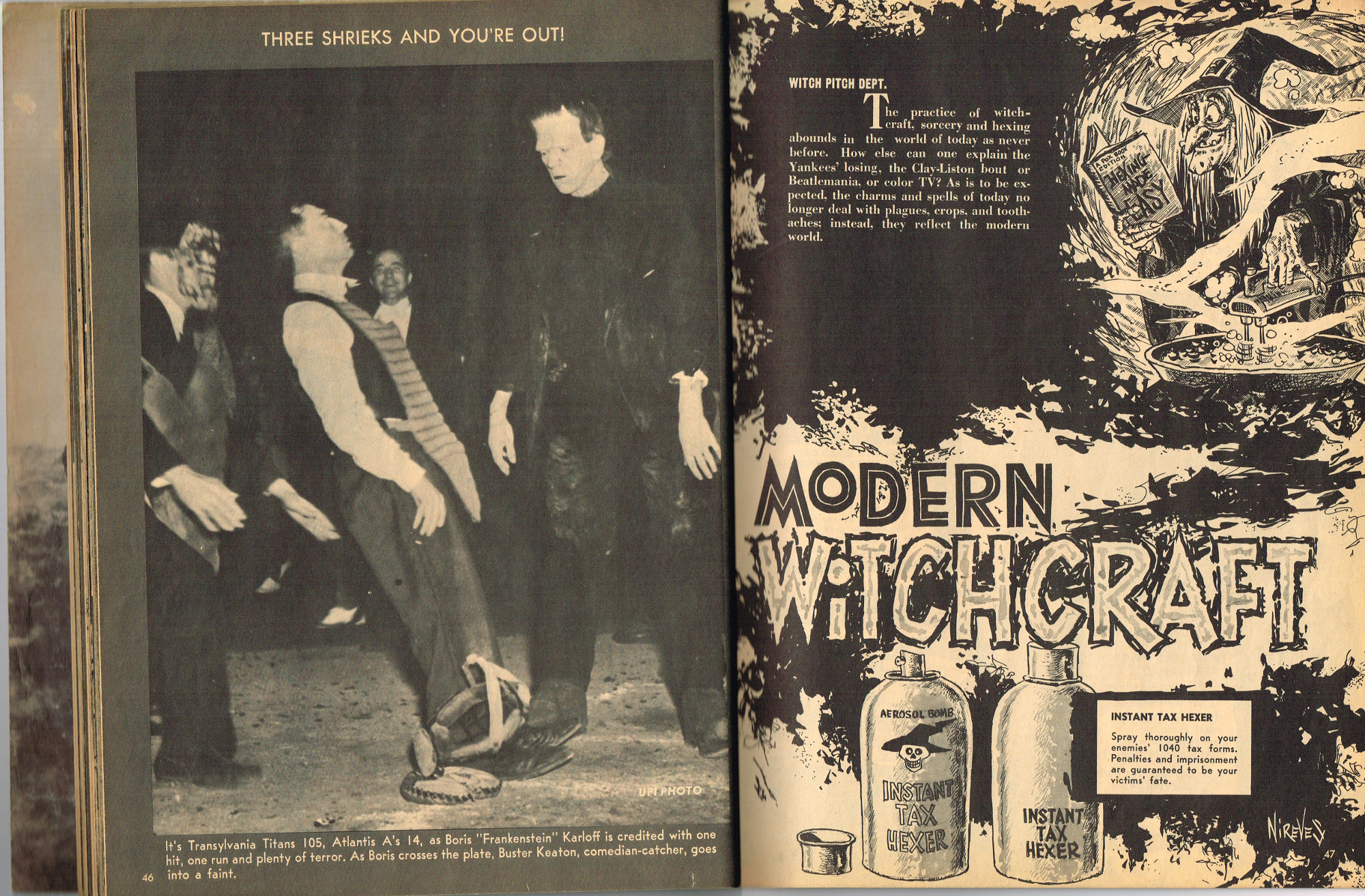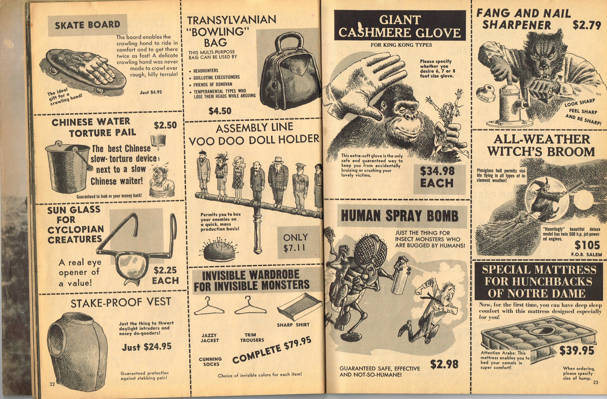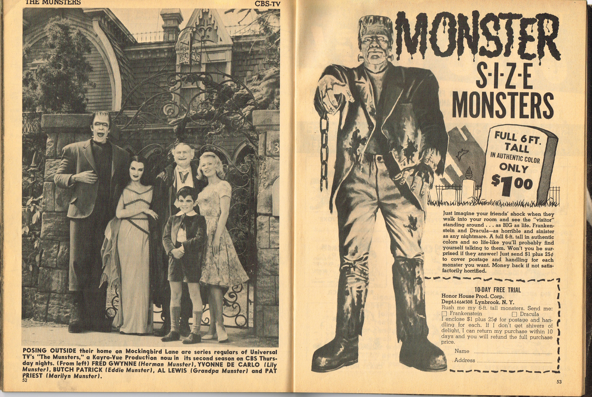 The previous owner of this copy of Cracked's For Monsters Only magazine must have treated it monstrously. I bet he read it, over and over again, in the wee hours of Saturday morning, with a flimsy flashlight held precariously in one hand as he flipped through the pages with the other. And when the pages started tearing away from the spine, due to so many page turnings, he taped them back in place. Maybe his name was Freddy Meyer, the person who wrote the same on the back cover's ECCH certificate. Or maybe Freddy was just one owner among many along the way. Or maybe this issue was owned by a girl who knew Freddy, and she borrowed it from him–Monsterkids stick together like slime and muck, you know–and she taped it for posterity because she liked Freddy, a lot, not knowing that iPad's and ebook readers would eventually eliminate the need for taping worn pages, and holding flashlights precariously under bedsheets in the wee hours of the morning.
