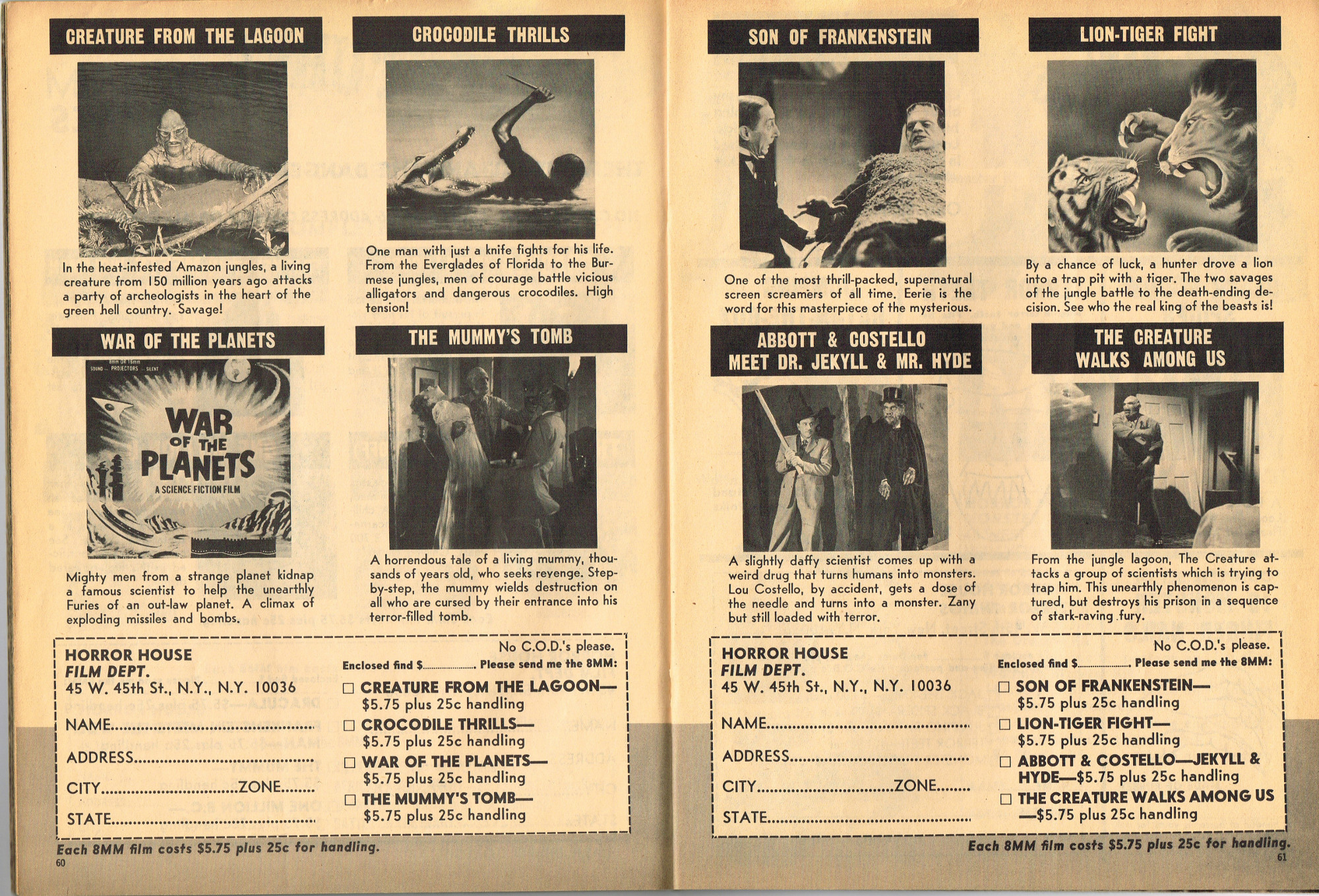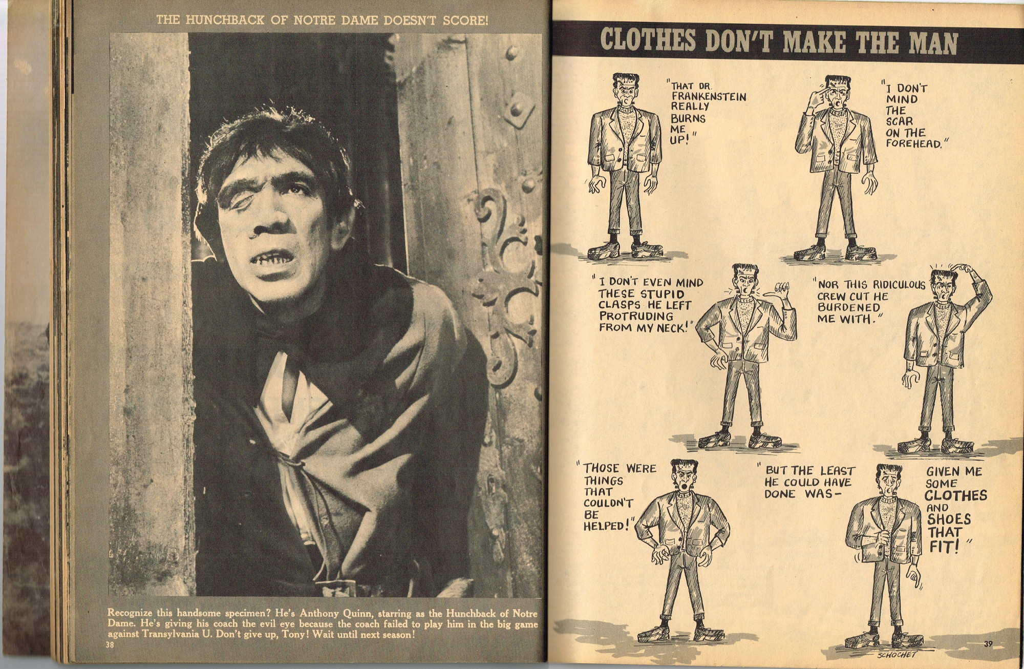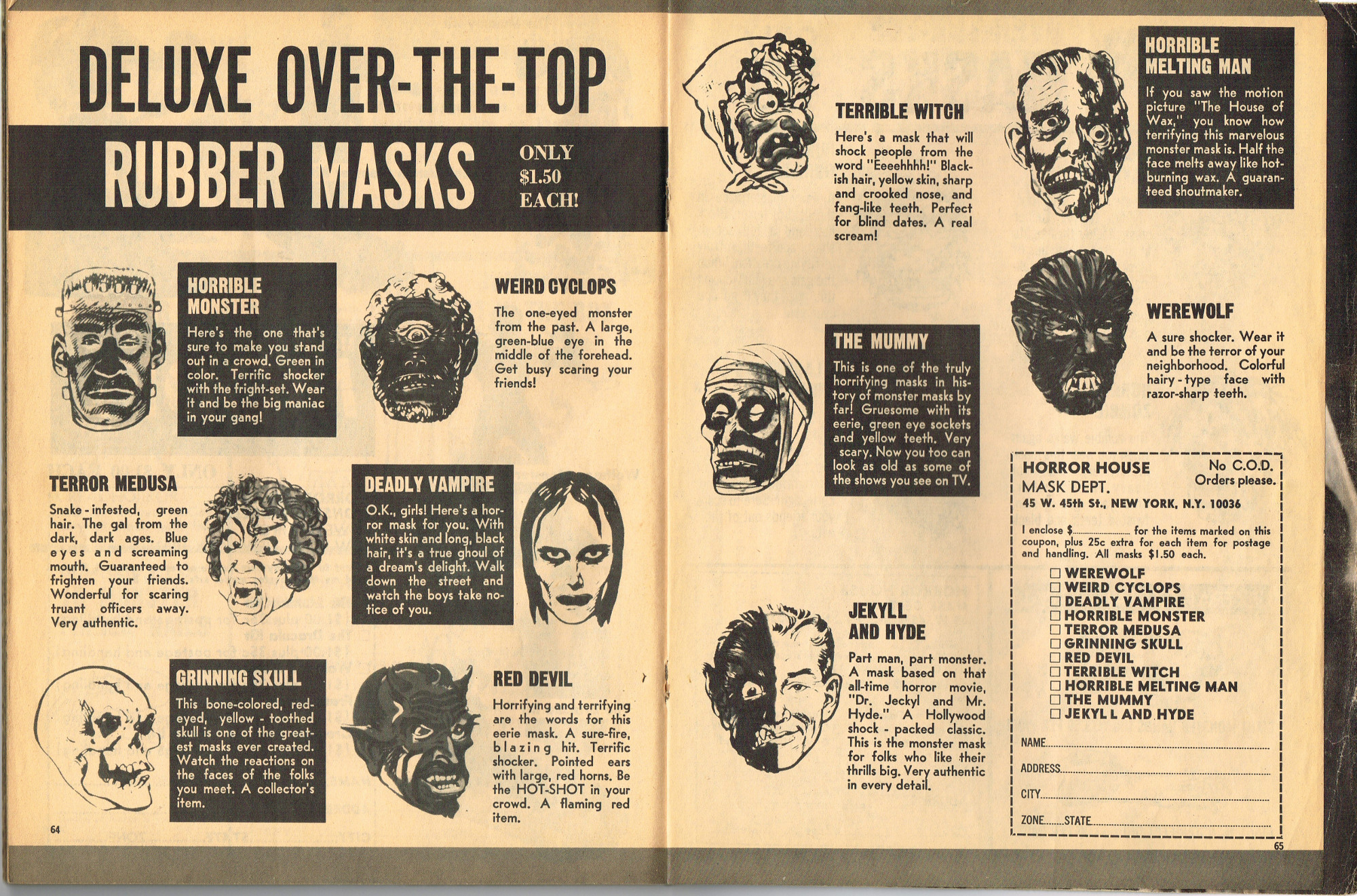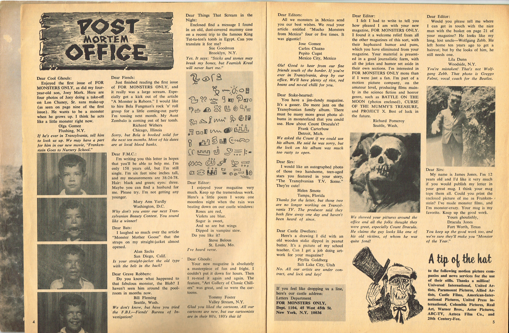 The previous owner of this copy of Cracked's For Monsters Only magazine must have treated it monstrously. I bet he read it, over and over again, in the wee hours of Saturday morning, with a flimsy flashlight held precariously in one hand as he flipped through the pages with the other. And when the pages started tearing away from the spine, due to so many page turnings, he taped them back in place. Maybe his name was Freddy Meyer, the person who wrote the same on the back cover's ECCH certificate. Or maybe Freddy was just one owner among many along the way. Or maybe this issue was owned by a girl who knew Freddy, and she borrowed it from him–Monsterkids stick together like slime and muck, you know–and she taped it for posterity because she liked Freddy, a lot, not knowing that iPad's and ebook readers would eventually eliminate the need for taping worn pages, and holding flashlights precariously under bedsheets in the wee hours of the morning.