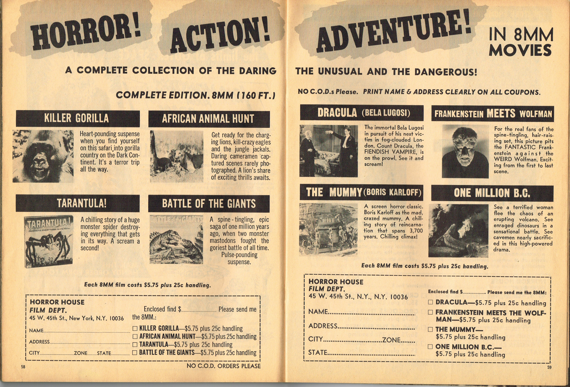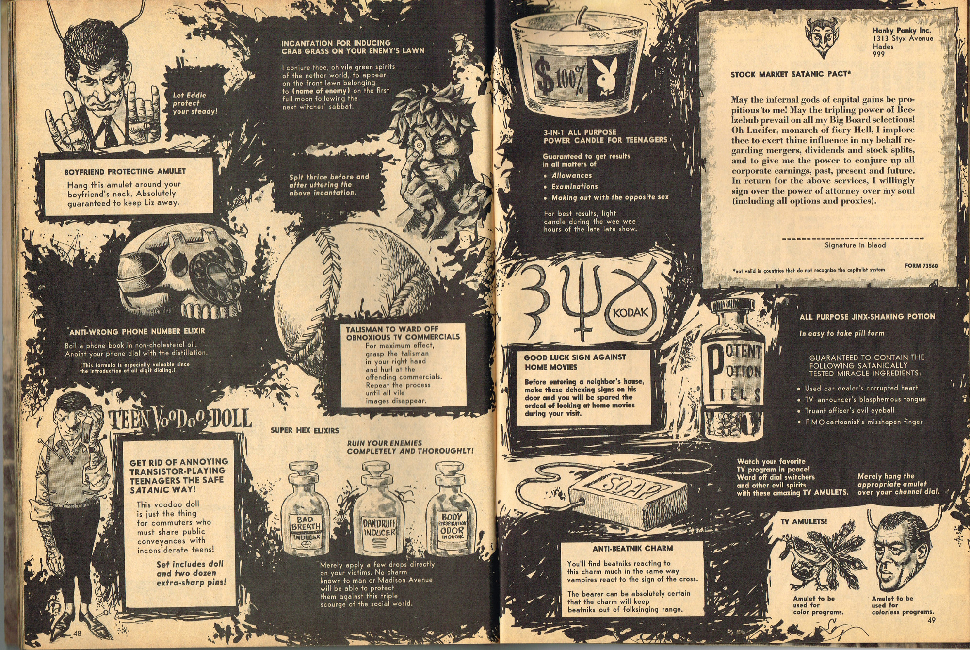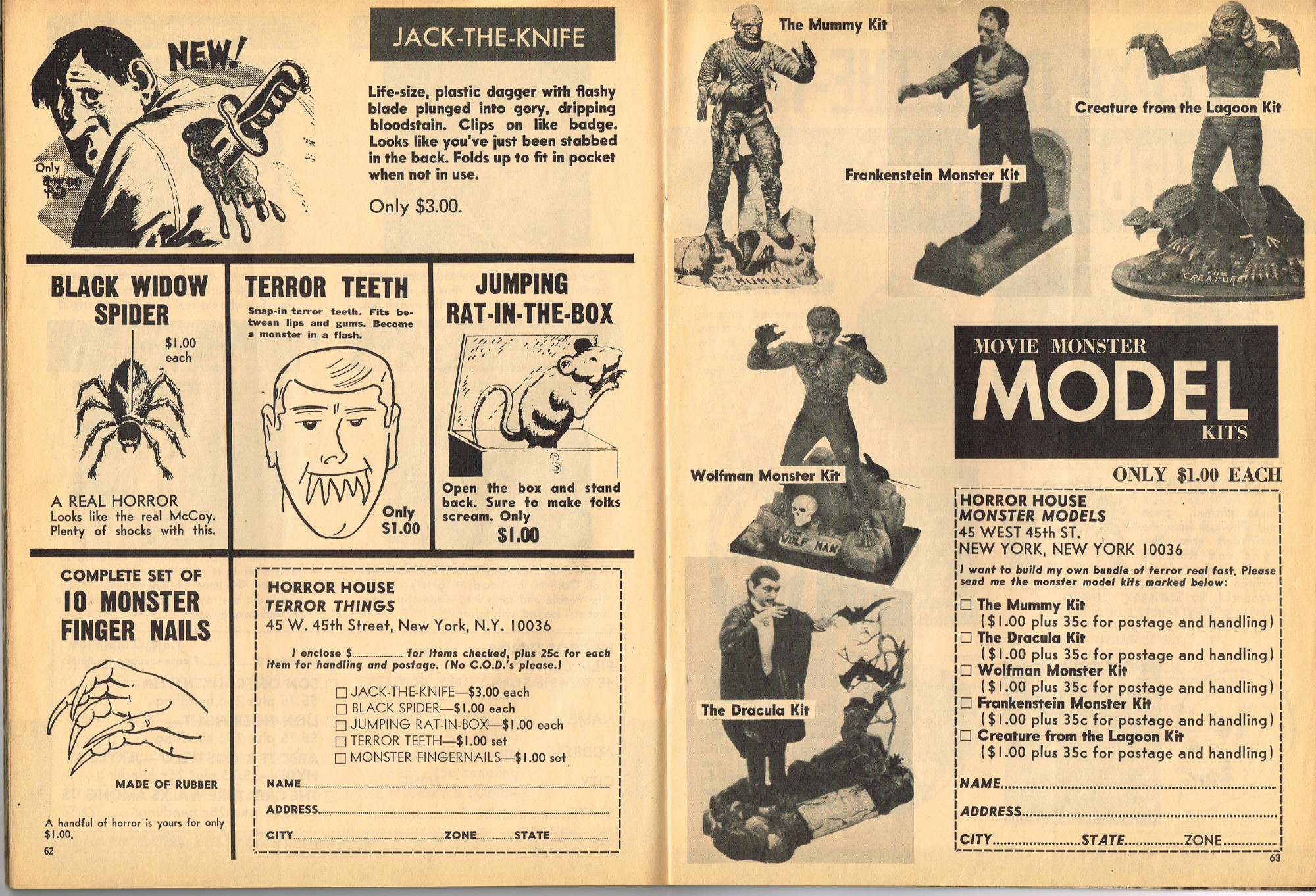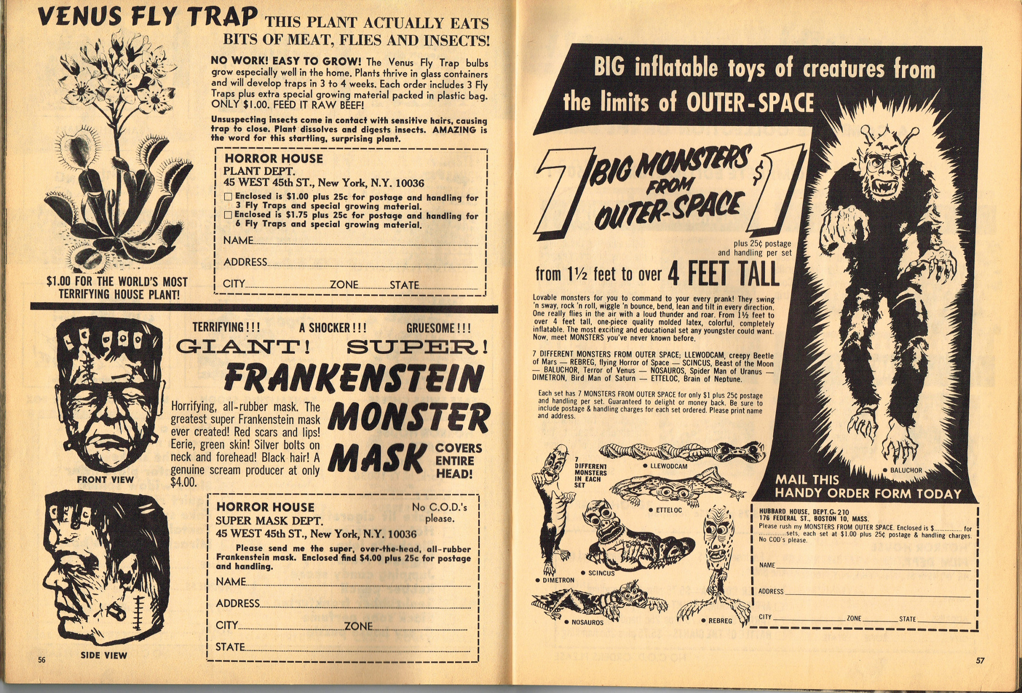 The previous owner of this copy of Cracked's For Monsters Only magazine must have treated it monstrously. I bet he read it, over and over again, in the wee hours of Saturday morning, with a flimsy flashlight held precariously in one hand as he flipped through the pages with the other. And when the pages started tearing away from the spine, due to so many page turnings, he taped them back in place. Maybe his name was Freddy Meyer, the person who wrote the same on the back cover's ECCH certificate. Or maybe Freddy was just one owner among many along the way. Or maybe this issue was owned by a girl who knew Freddy, and she borrowed it from him–Monsterkids stick together like slime and muck, you know–and she taped it for posterity because she liked Freddy, a lot, not knowing that iPad's and ebook readers would eventually eliminate the need for taping worn pages, and holding flashlights precariously under bedsheets in the wee hours of the morning.