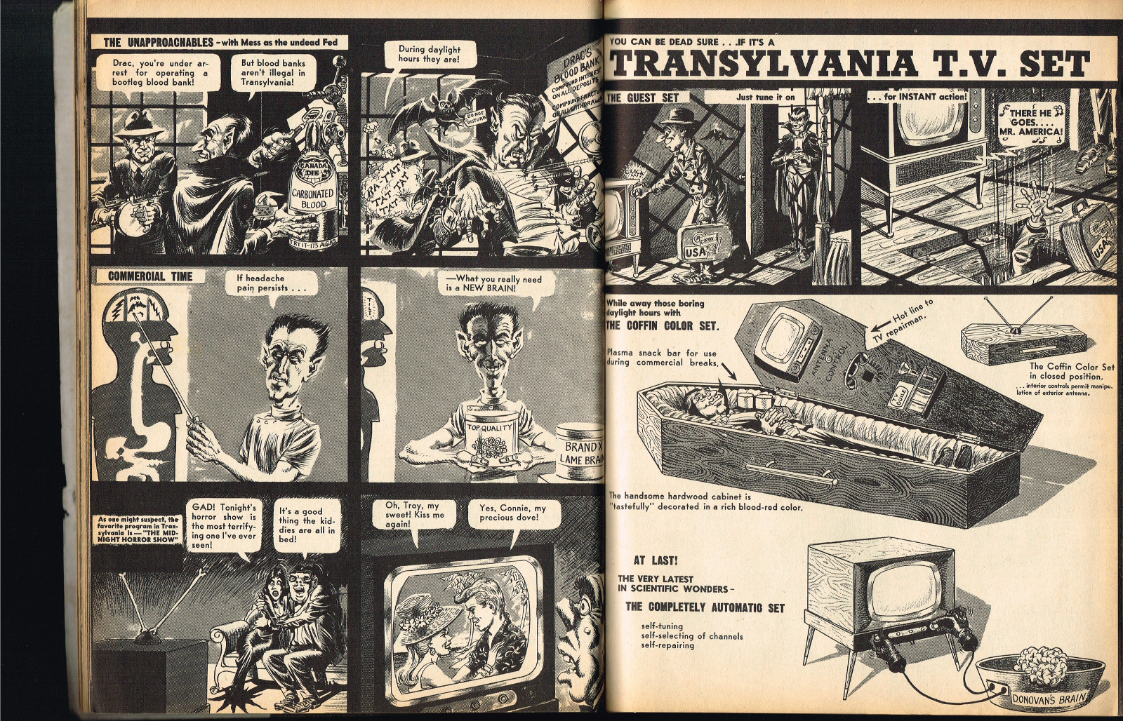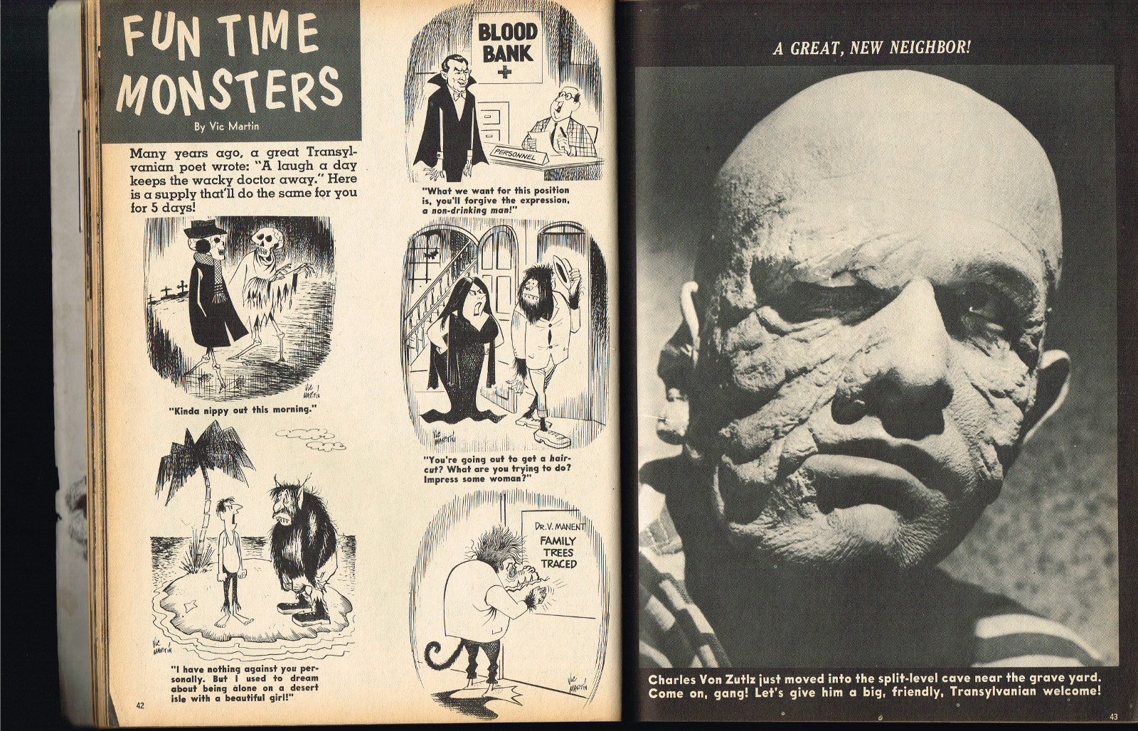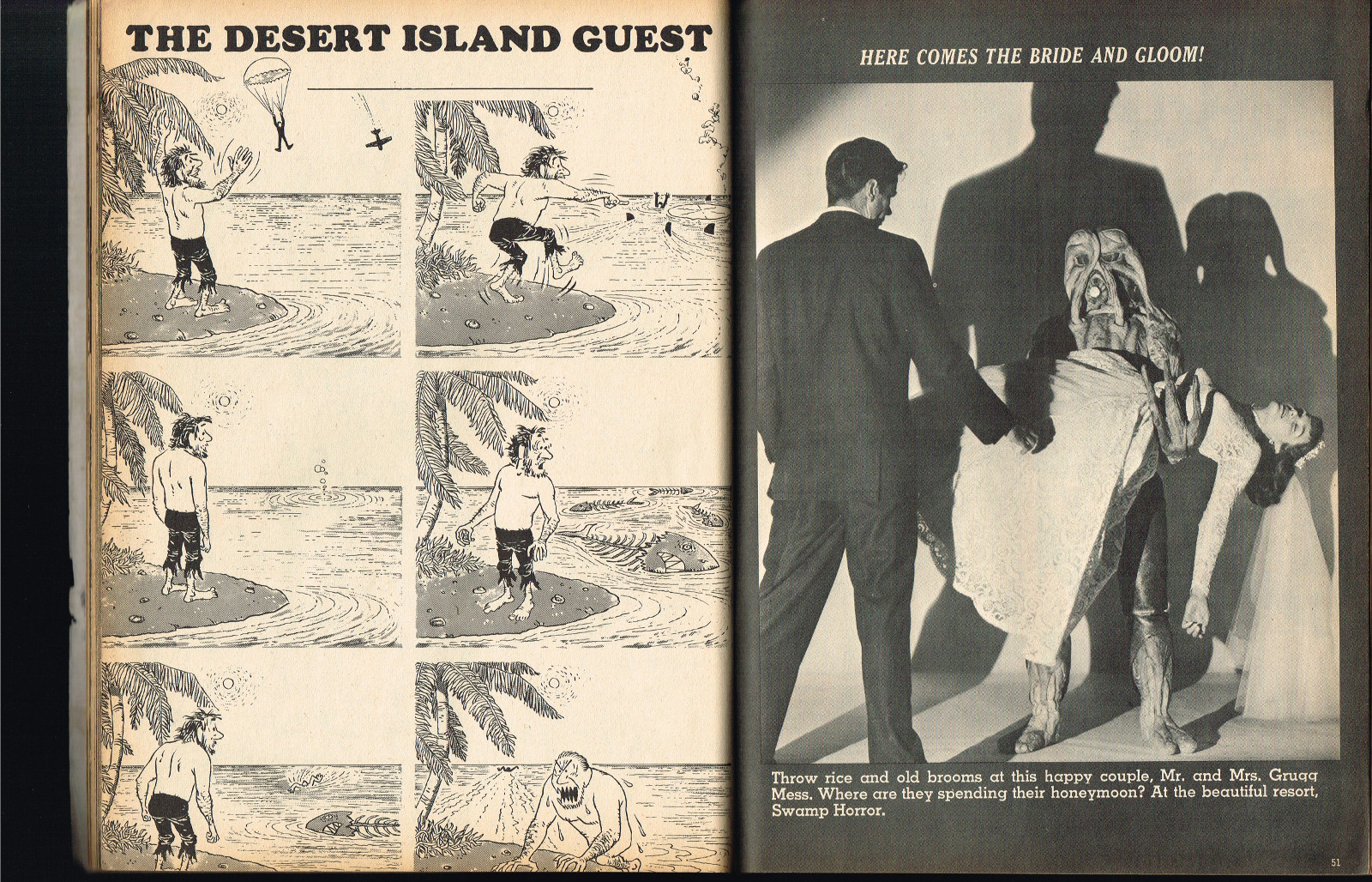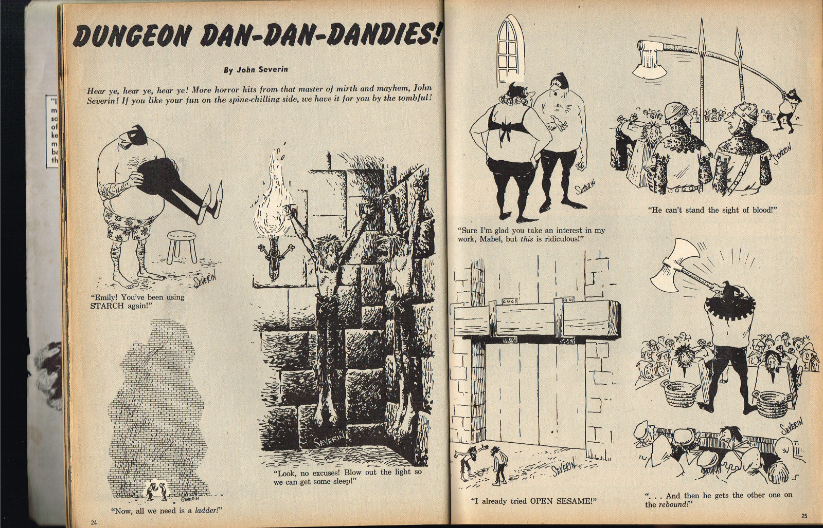 With issue 3 of Cracked’s For Monsters Only, the cartoons and comic stories, the photo-gags, and the horror coverage for both old and newer monsters packed its pages well. Even the John Severin cover was quite inviting as it stared back at you from the overcrowded magazine rack daring you to join the monster party. In this issue Richard Bojarski writes a lengthy, informative article in The Horror Worlds of Karloff (and remember kids, there wasn’t any Google or Wikipedia to refer to!), the School for Monsters shows us where all those monsters appearing everywhere in the 1960s were graduating from (note that horror host Zacherle headed the employment bureau), and John Severin provided some Dungeon Dan-Dan-Dandies to chew on.