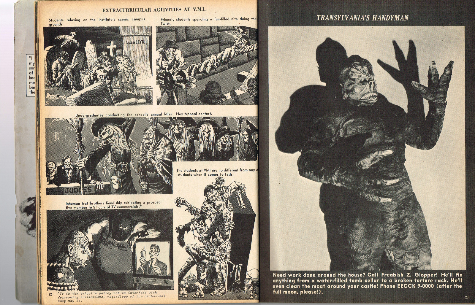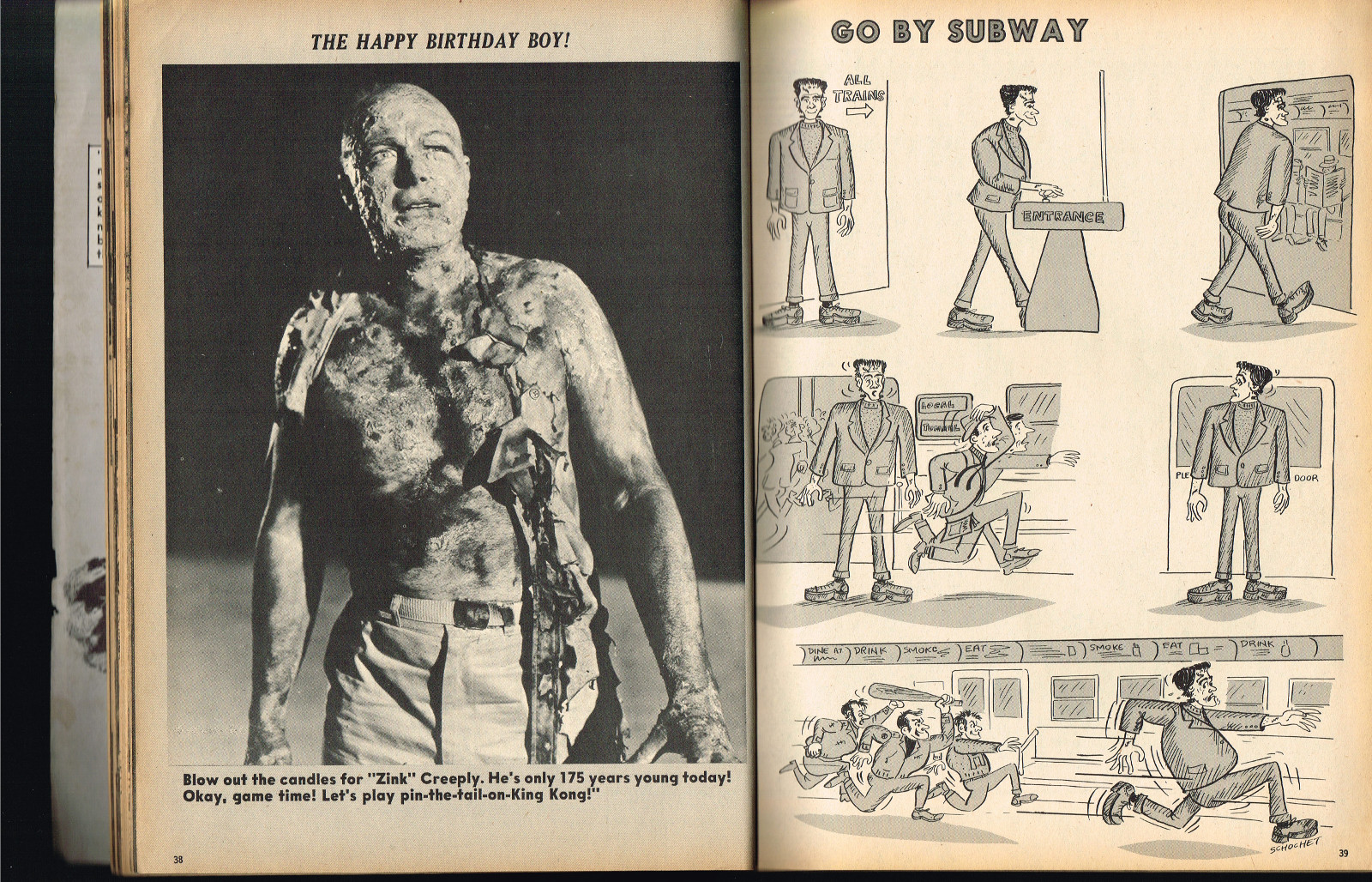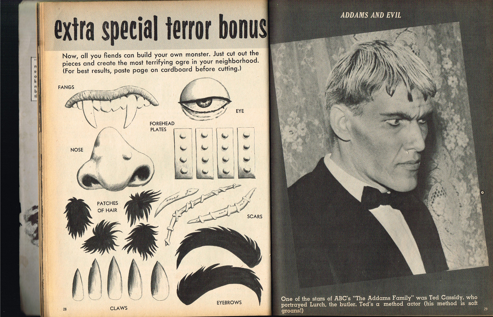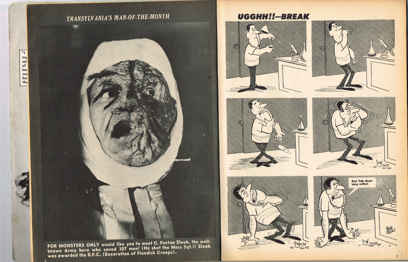 With issue 3 of Cracked’s For Monsters Only, the cartoons and comic stories, the photo-gags, and the horror coverage for both old and newer monsters packed its pages well. Even the John Severin cover was quite inviting as it stared back at you from the overcrowded magazine rack daring you to join the monster party. In this issue Richard Bojarski writes a lengthy, informative article in The Horror Worlds of Karloff (and remember kids, there wasn’t any Google or Wikipedia to refer to!), the School for Monsters shows us where all those monsters appearing everywhere in the 1960s were graduating from (note that horror host Zacherle headed the employment bureau), and John Severin provided some Dungeon Dan-Dan-Dandies to chew on.