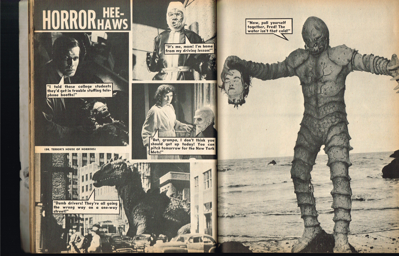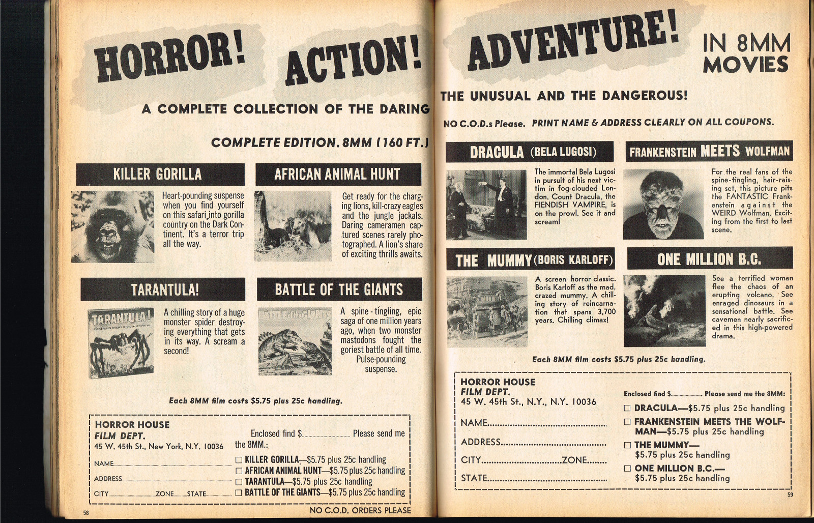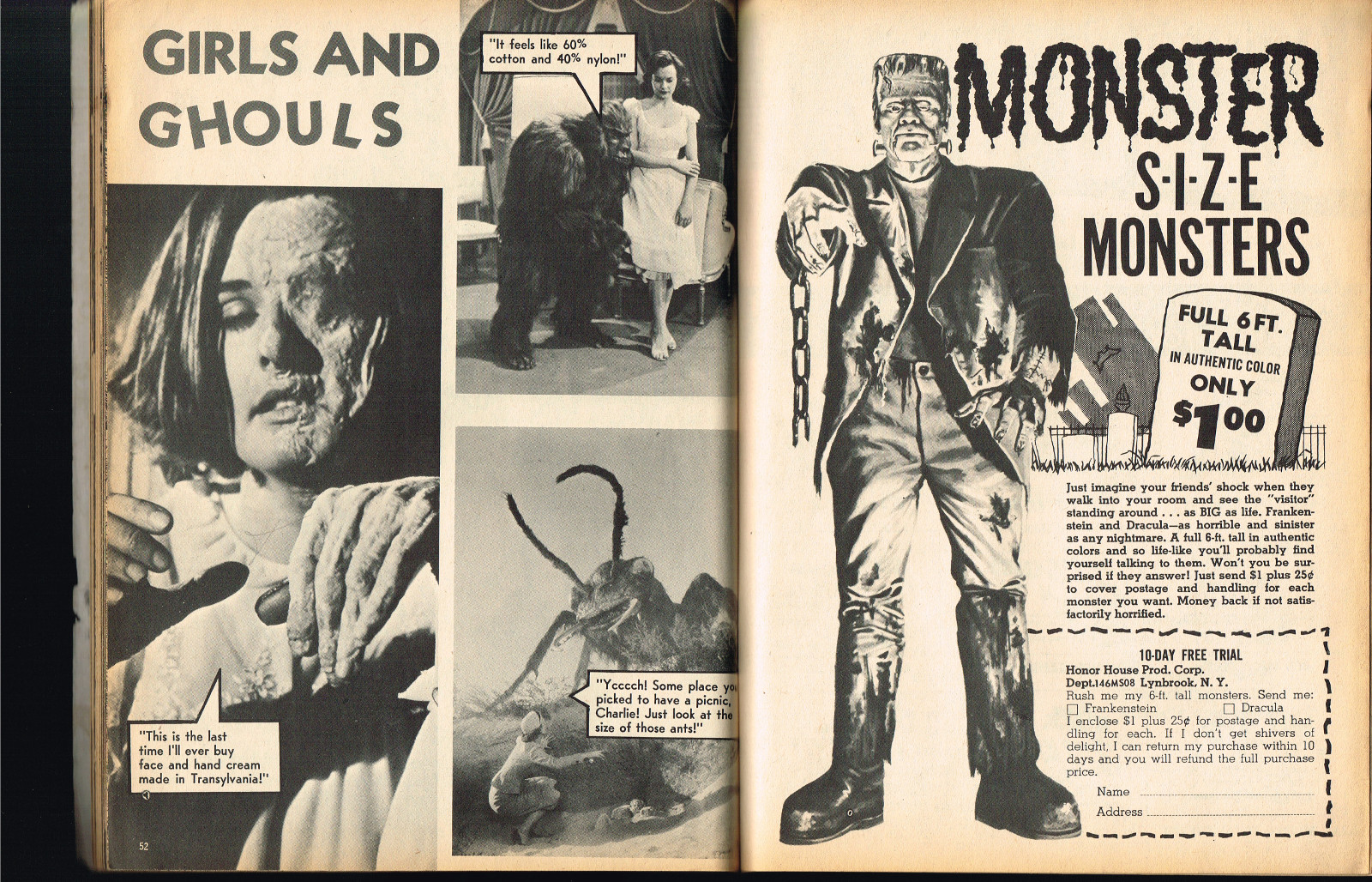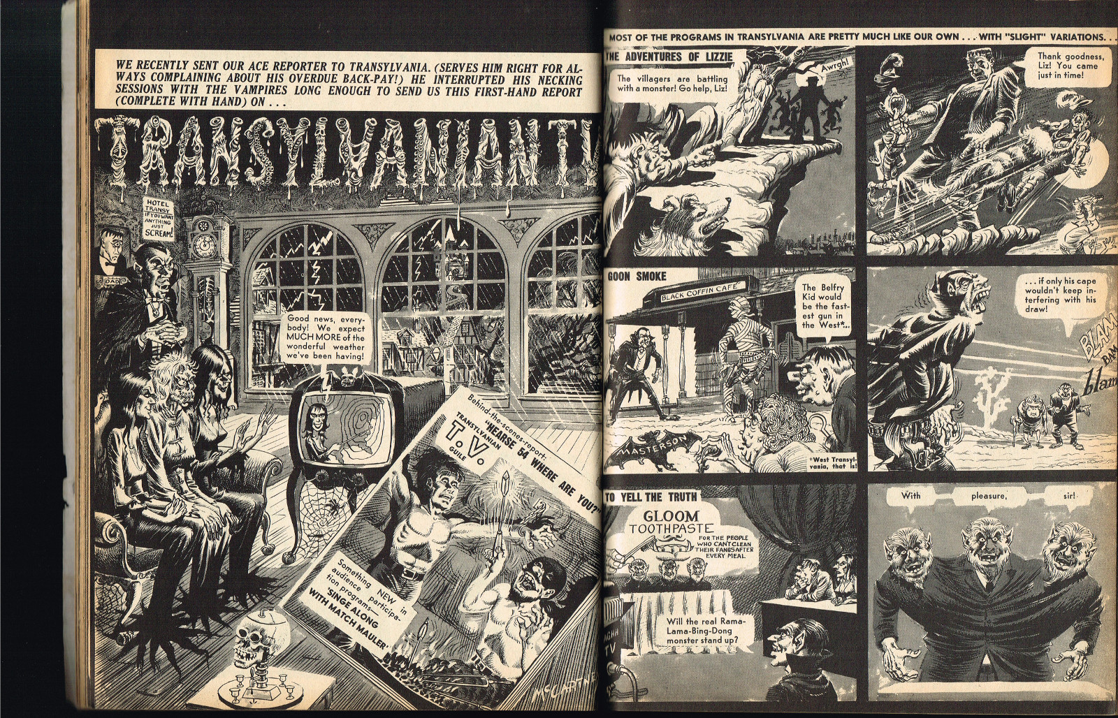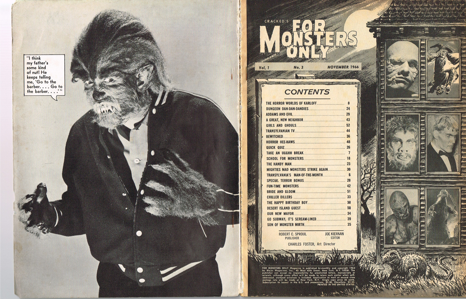 With issue 3 of Cracked’s For Monsters Only, the cartoons and comic stories, the photo-gags, and the horror coverage for both old and newer monsters packed its pages well. Even the John Severin cover was quite inviting as it stared back at you from the overcrowded magazine rack daring you to join the monster party. In this issue Richard Bojarski writes a lengthy, informative article in The Horror Worlds of Karloff (and remember kids, there wasn’t any Google or Wikipedia to refer to!), the School for Monsters shows us where all those monsters appearing everywhere in the 1960s were graduating from (note that horror host Zacherle headed the employment bureau), and John Severin provided some Dungeon Dan-Dan-Dandies to chew on.