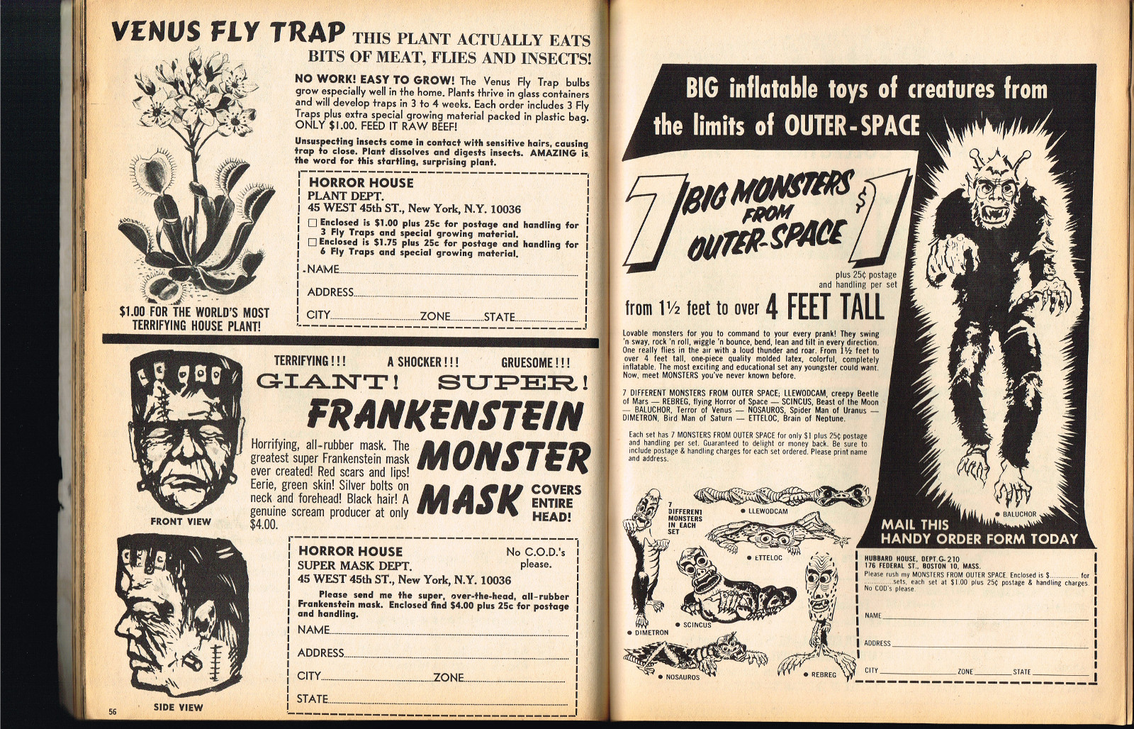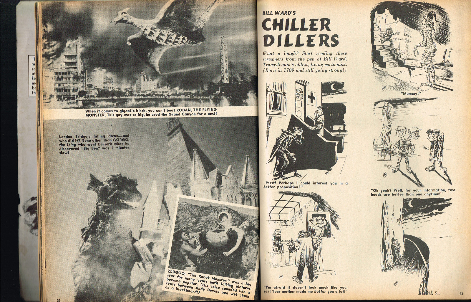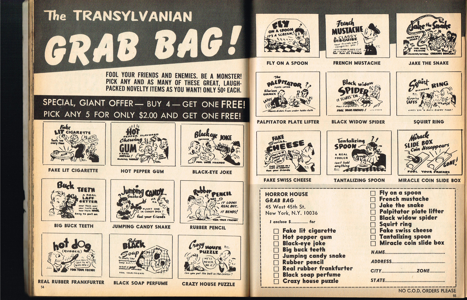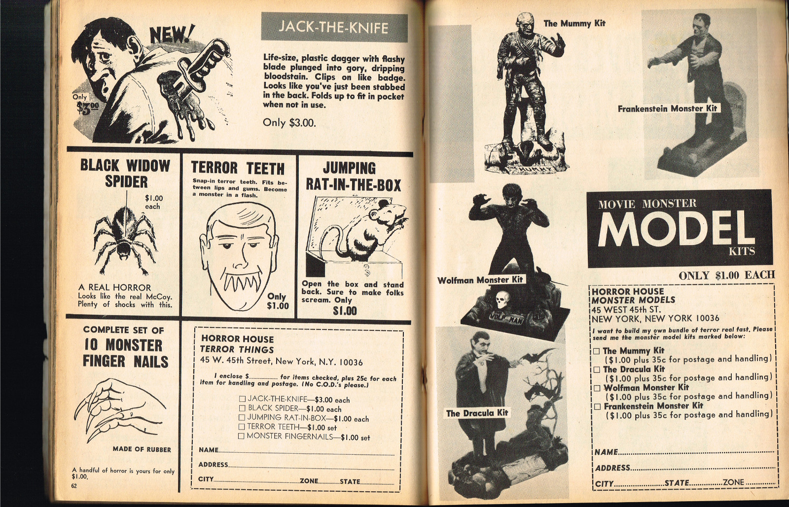 With issue 3 of Cracked’s For Monsters Only, the cartoons and comic stories, the photo-gags, and the horror coverage for both old and newer monsters packed its pages well. Even the John Severin cover was quite inviting as it stared back at you from the overcrowded magazine rack daring you to join the monster party. In this issue Richard Bojarski writes a lengthy, informative article in The Horror Worlds of Karloff (and remember kids, there wasn’t any Google or Wikipedia to refer to!), the School for Monsters shows us where all those monsters appearing everywhere in the 1960s were graduating from (note that horror host Zacherle headed the employment bureau), and John Severin provided some Dungeon Dan-Dan-Dandies to chew on.