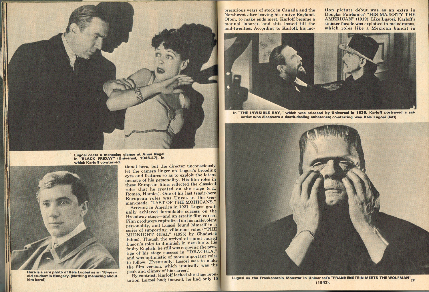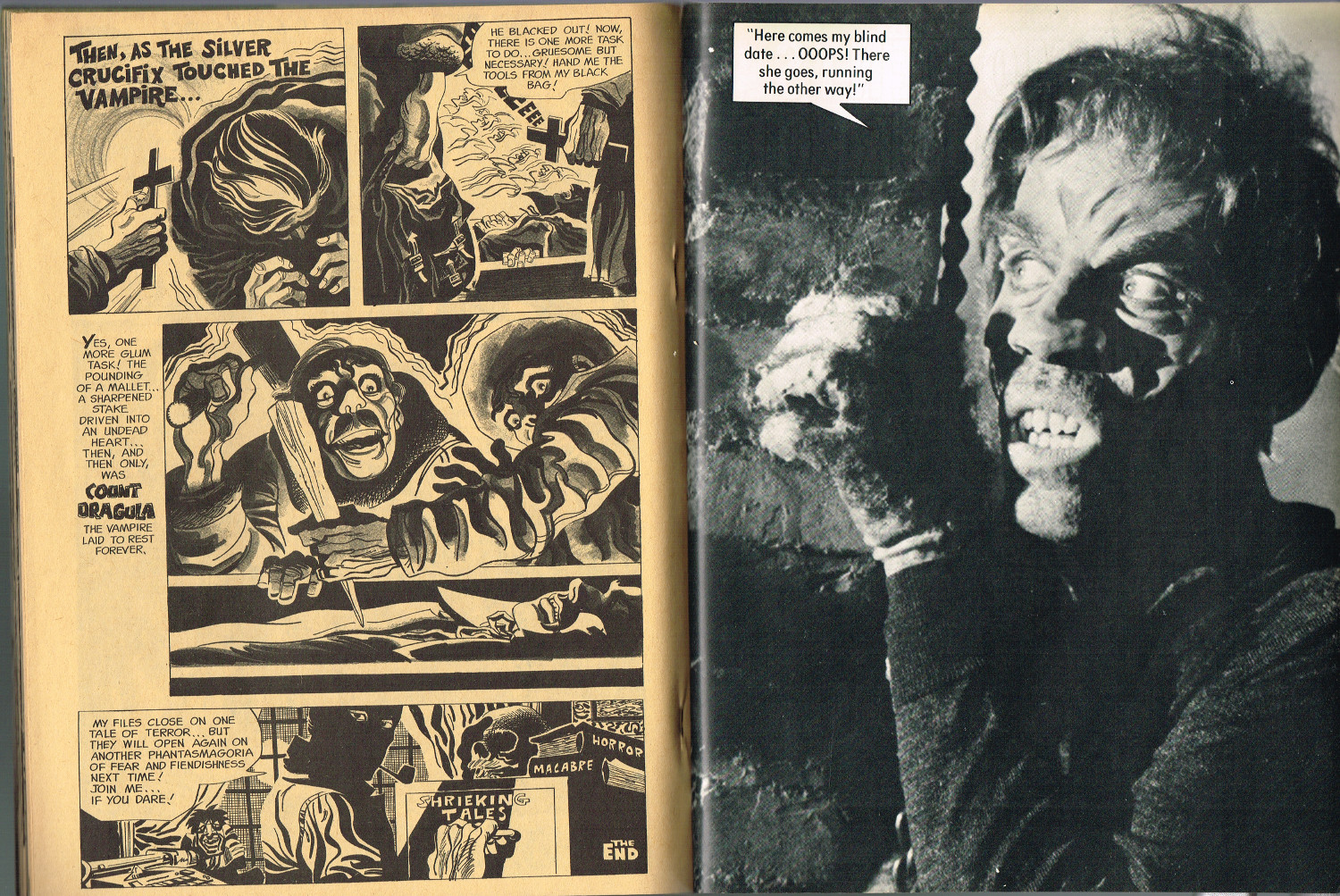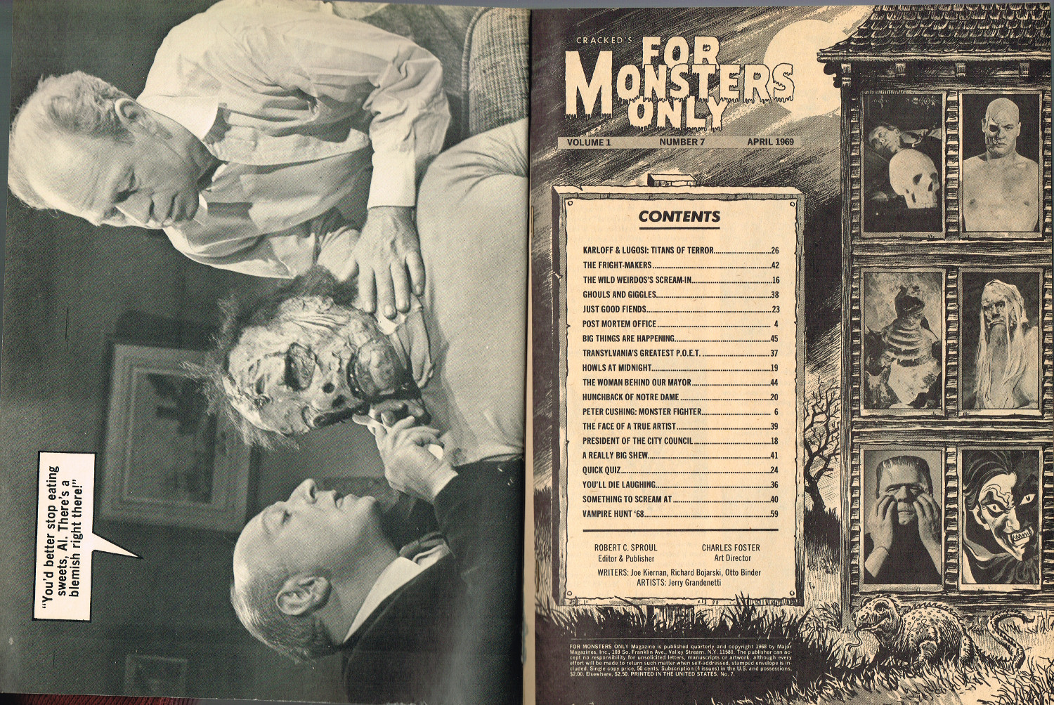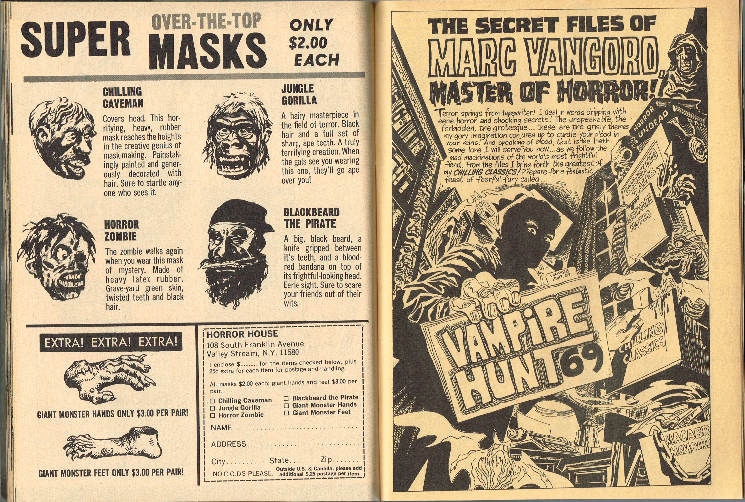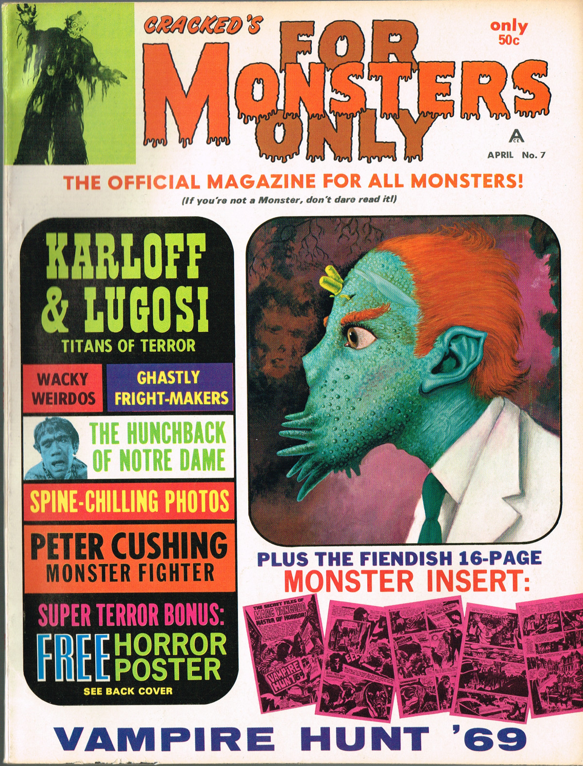 Richard Bojarski comes to the rescue again in issue 7 of Cracked's For Monsters Only with Peter Cushing: Monster Fighter and Karloff and Lugosi: The Titans of Terror. Otherwise, it's the usual filler comprised of ad pages, humor pages (which are actually quite funny this time around), and a 16-page comic, The Secret Files of Marc Vangoro, Master of Horror (he appears in another adventure in CFMO No. 8.)