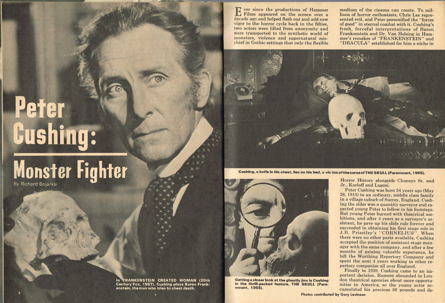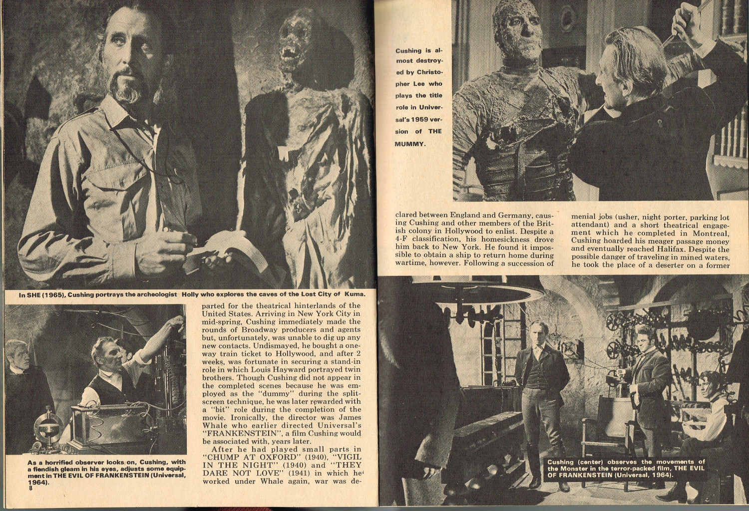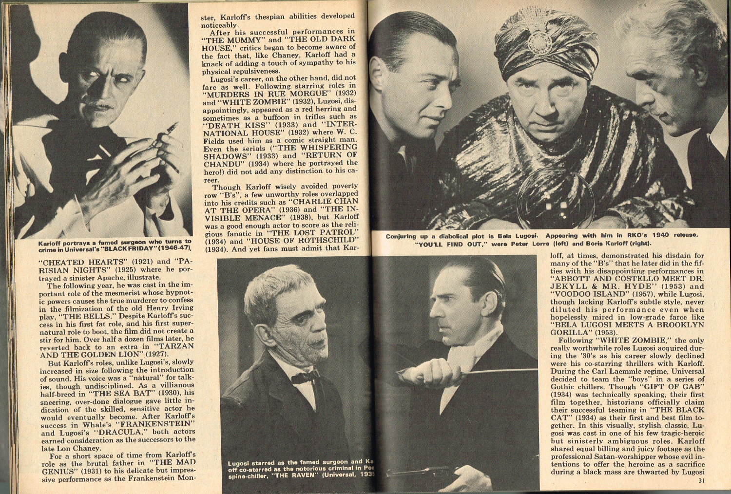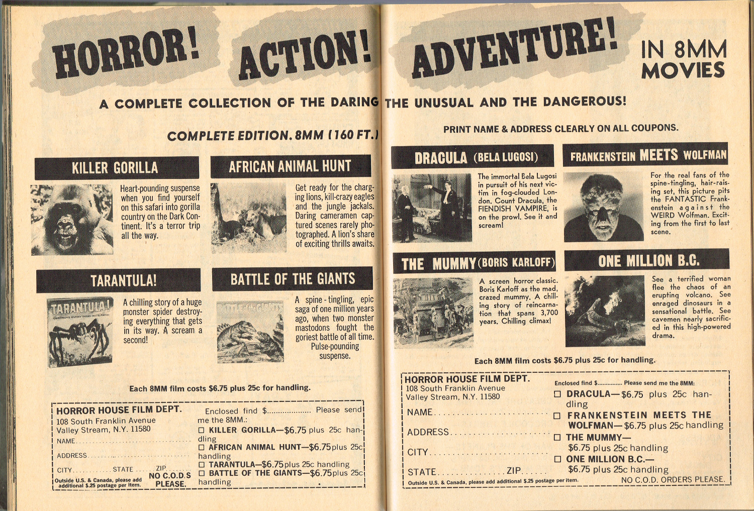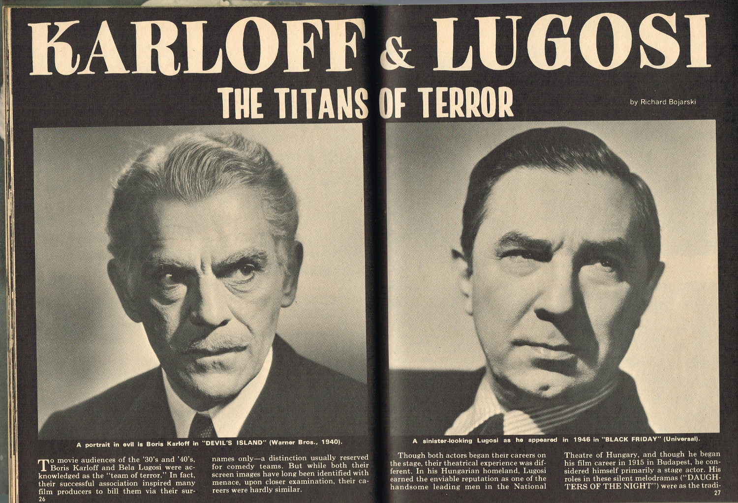 Richard Bojarski comes to the rescue again in issue 7 of Cracked's For Monsters Only with Peter Cushing: Monster Fighter and Karloff and Lugosi: The Titans of Terror. Otherwise, it's the usual filler comprised of ad pages, humor pages (which are actually quite funny this time around), and a 16-page comic, The Secret Files of Marc Vangoro, Master of Horror (he appears in another adventure in CFMO No. 8.)