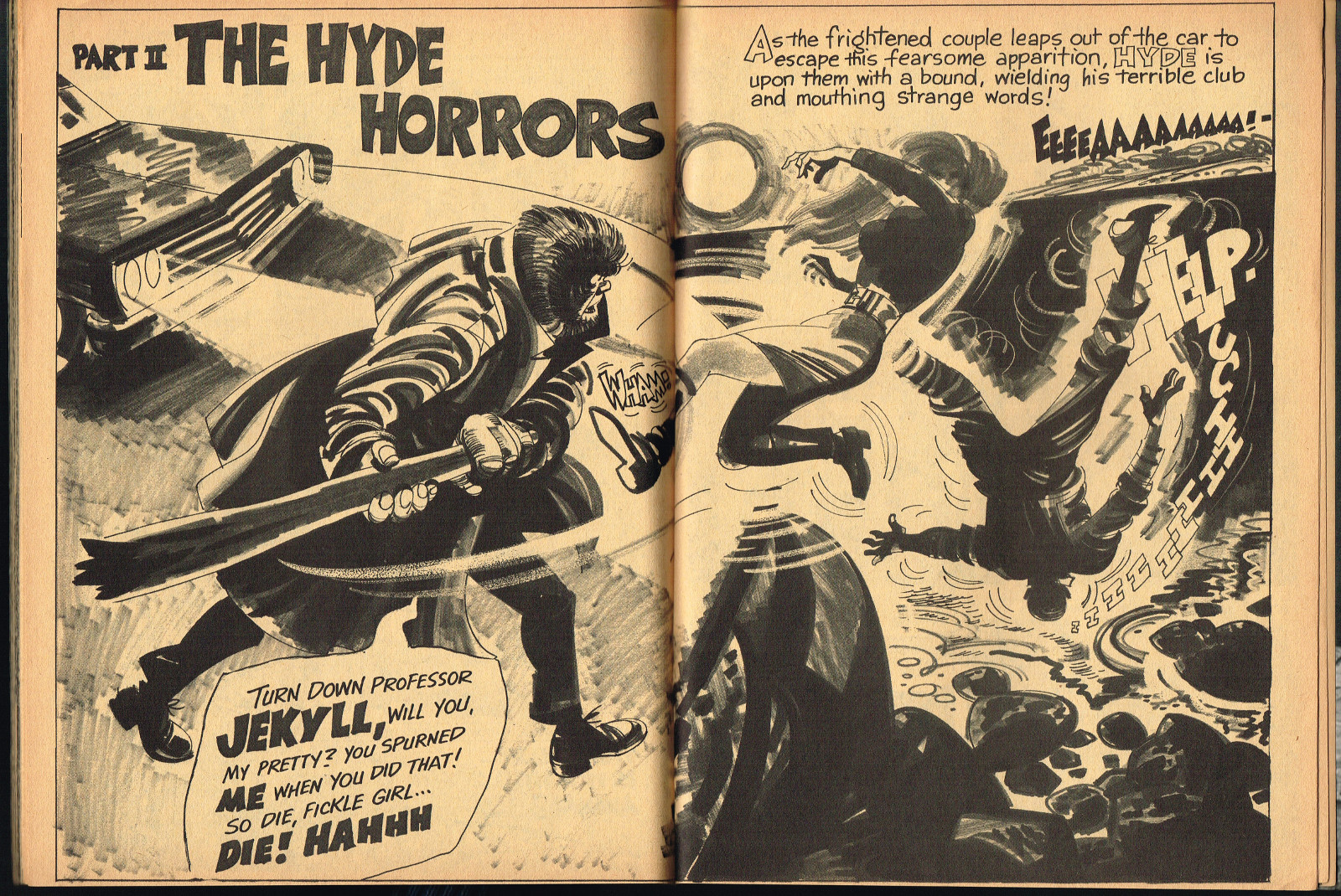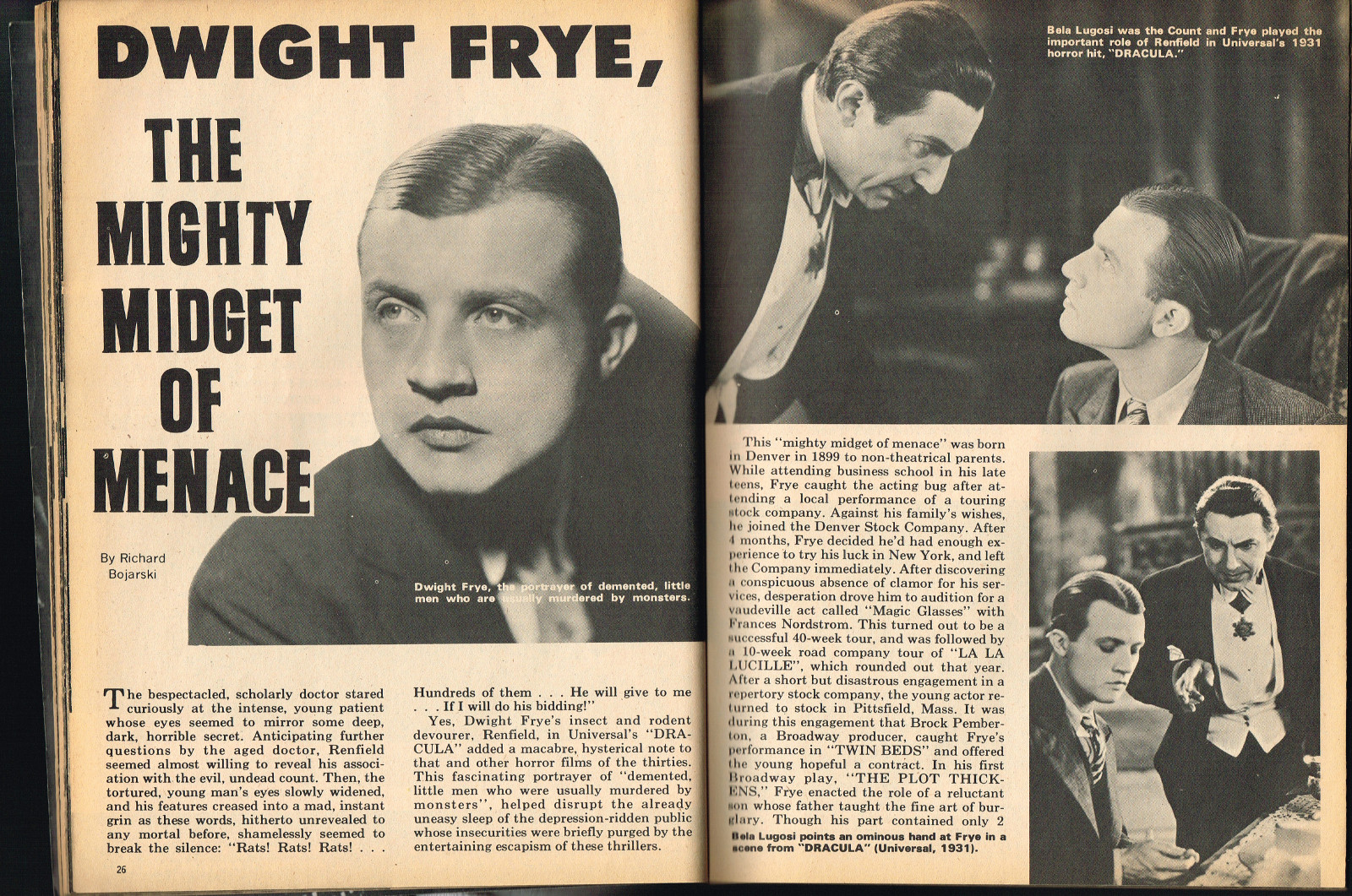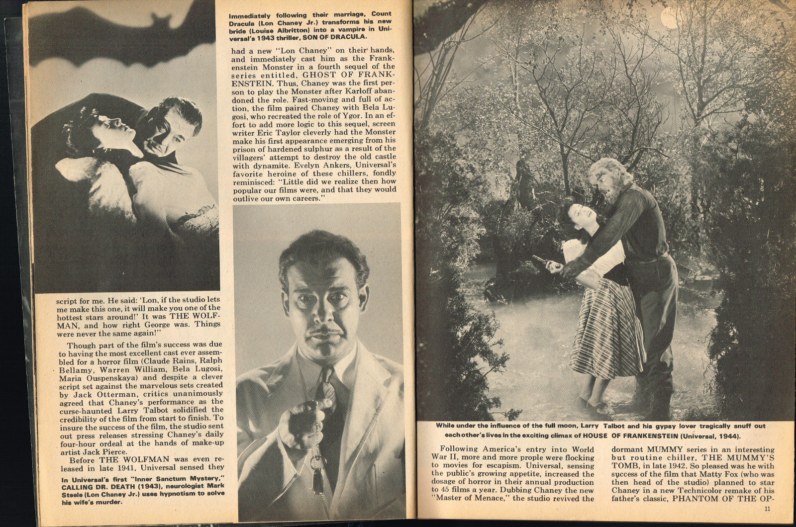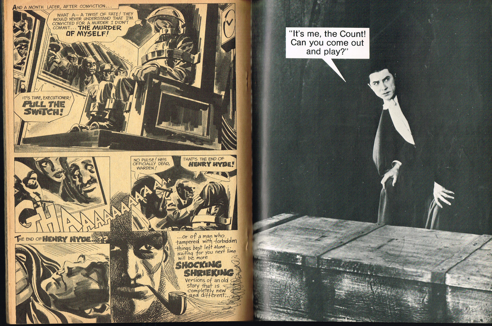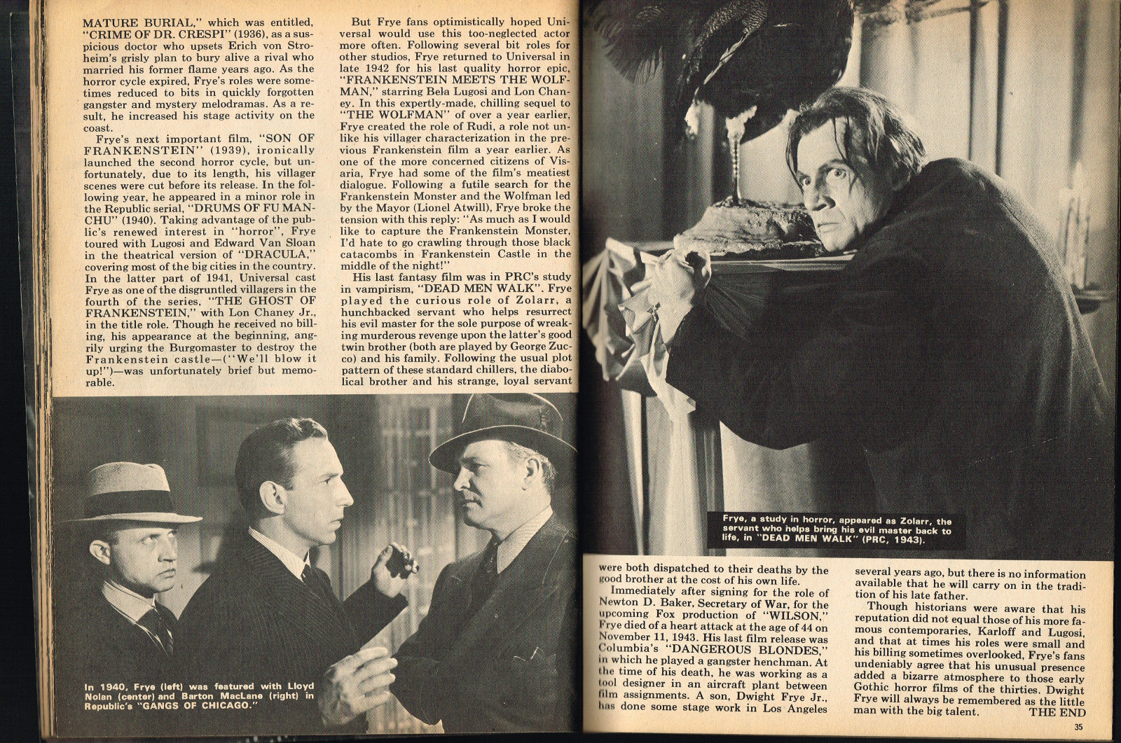 Sporting another stylish cover by John Severin, Cracked’s For Monsters Only issue 8 is chock full of great articles and a long, wonderfully ink-washed horror comic appearing after the requisite adverts. The usual photos with gag-captions abound. Richard Bojarski shines in this issue, writing two articles, Fantasy Films of the Forties (with a focus on Lon Chaney Jr) and Dwight Frye, the Mighty Midget of Menace (although I think Bojarski stretched a tad for that catchy title).
