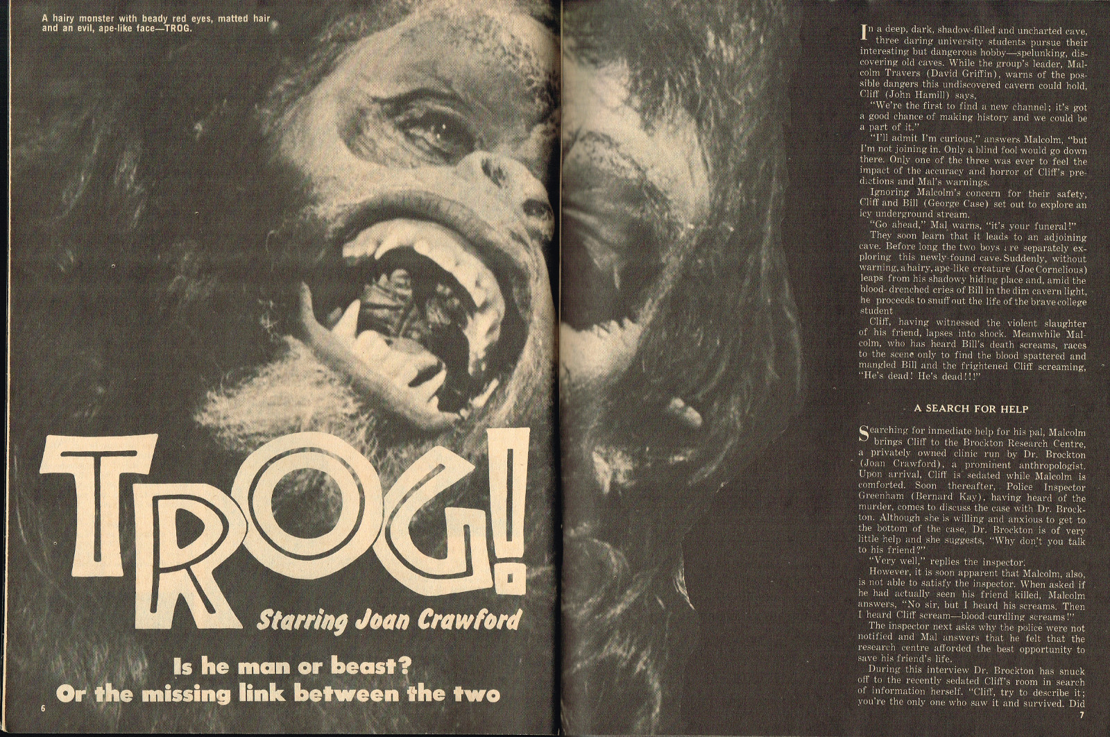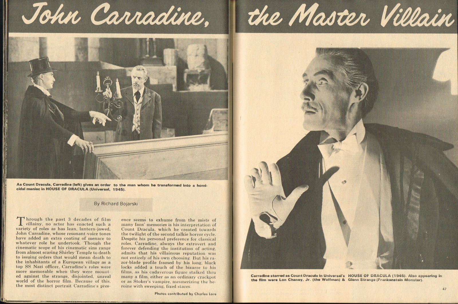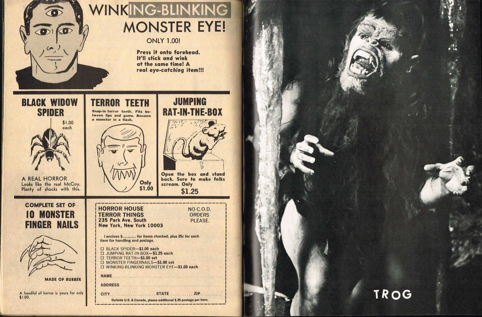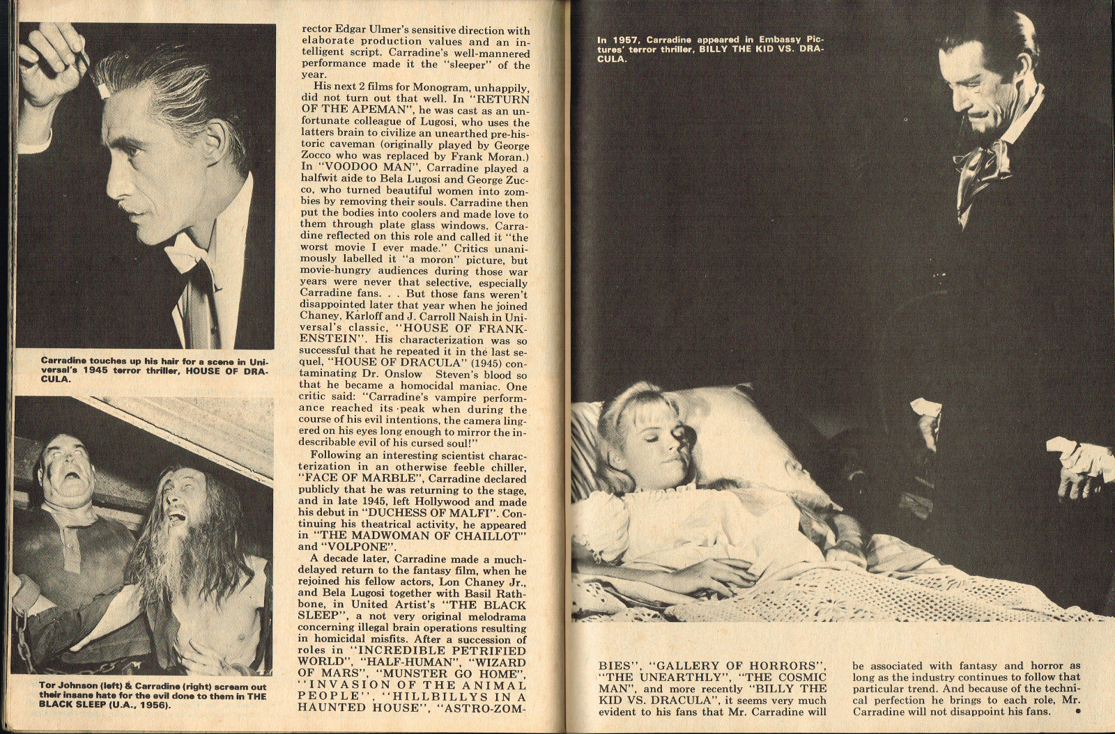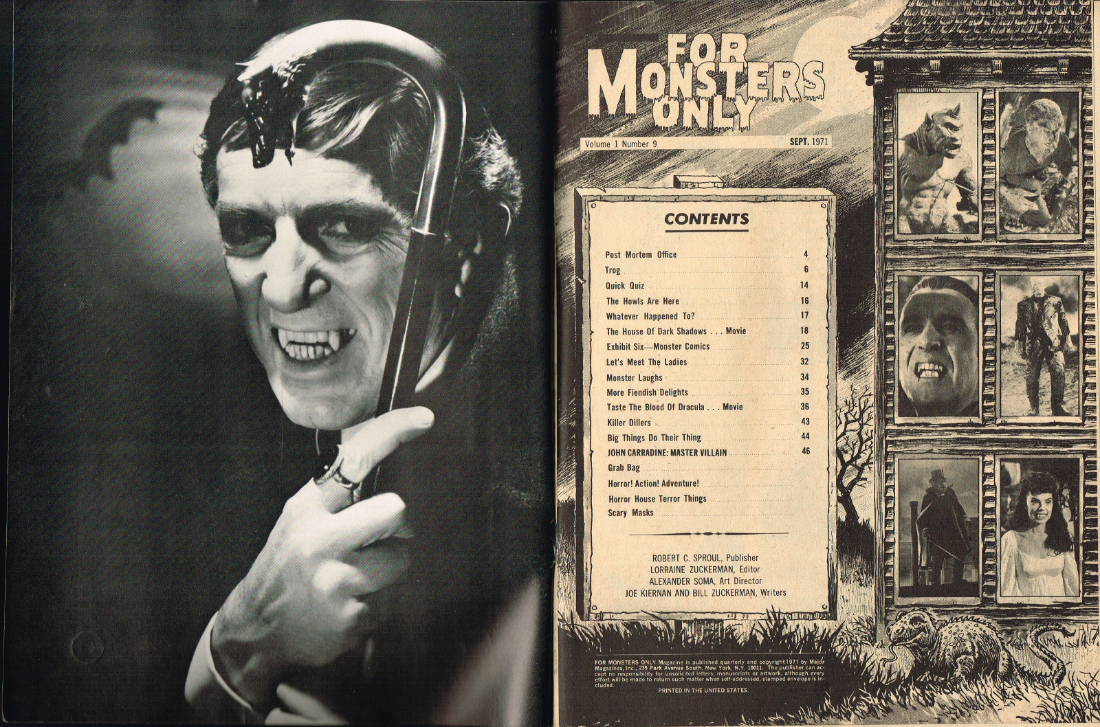 With the dropping of "Cracked's" in the title, and more movie articles than cartoons, this issue may still have the gag-captioned photos, but it does have more bite for serious horror fans. House of Dark Shadows, Taste the Blood of Dracula, a monster comic, and Richard Bojarski's John Carradine, The Master Villain, make this a fun read. Trog gets extensive coverage, too.