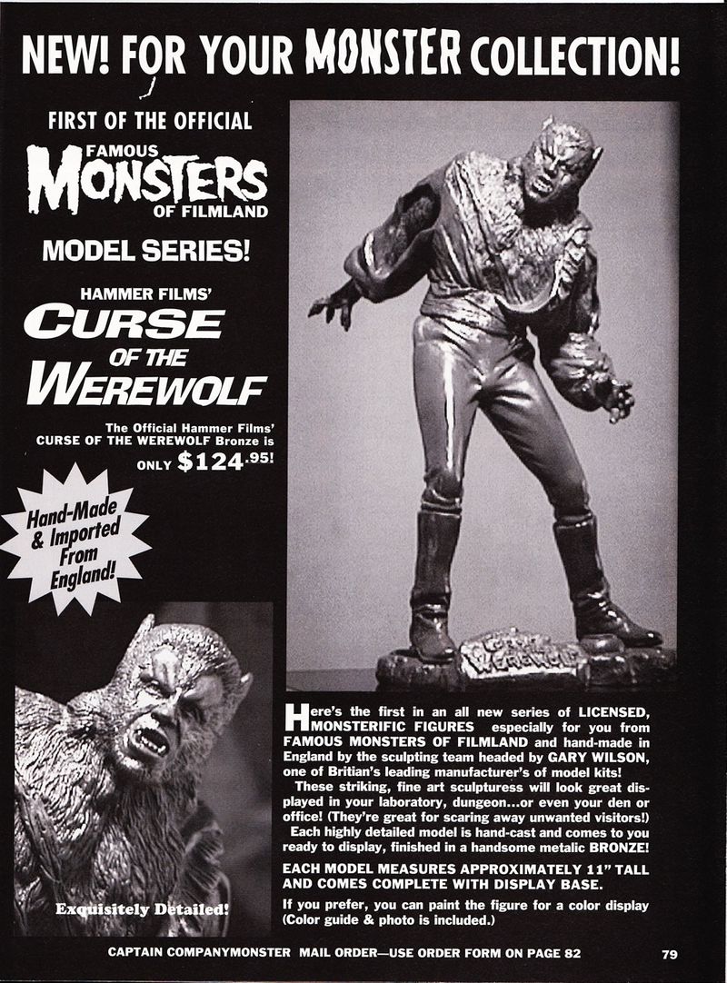 Captain Company Curse of the Werewolf Statue Leave a Comment / Magazine Morgue / By JM Cozzoli The official Hammer Films' Curse of the Werewolf "Bronze" is a beauty to be sure. Good detail, nice pose, and big enough to say 'Hammer Monsterkid!' Bit pricey back then, though. But coming all the way from England, I could see that. Like this:Like Loading... Share this post Facebook Twitter Pinterest Linkedin
