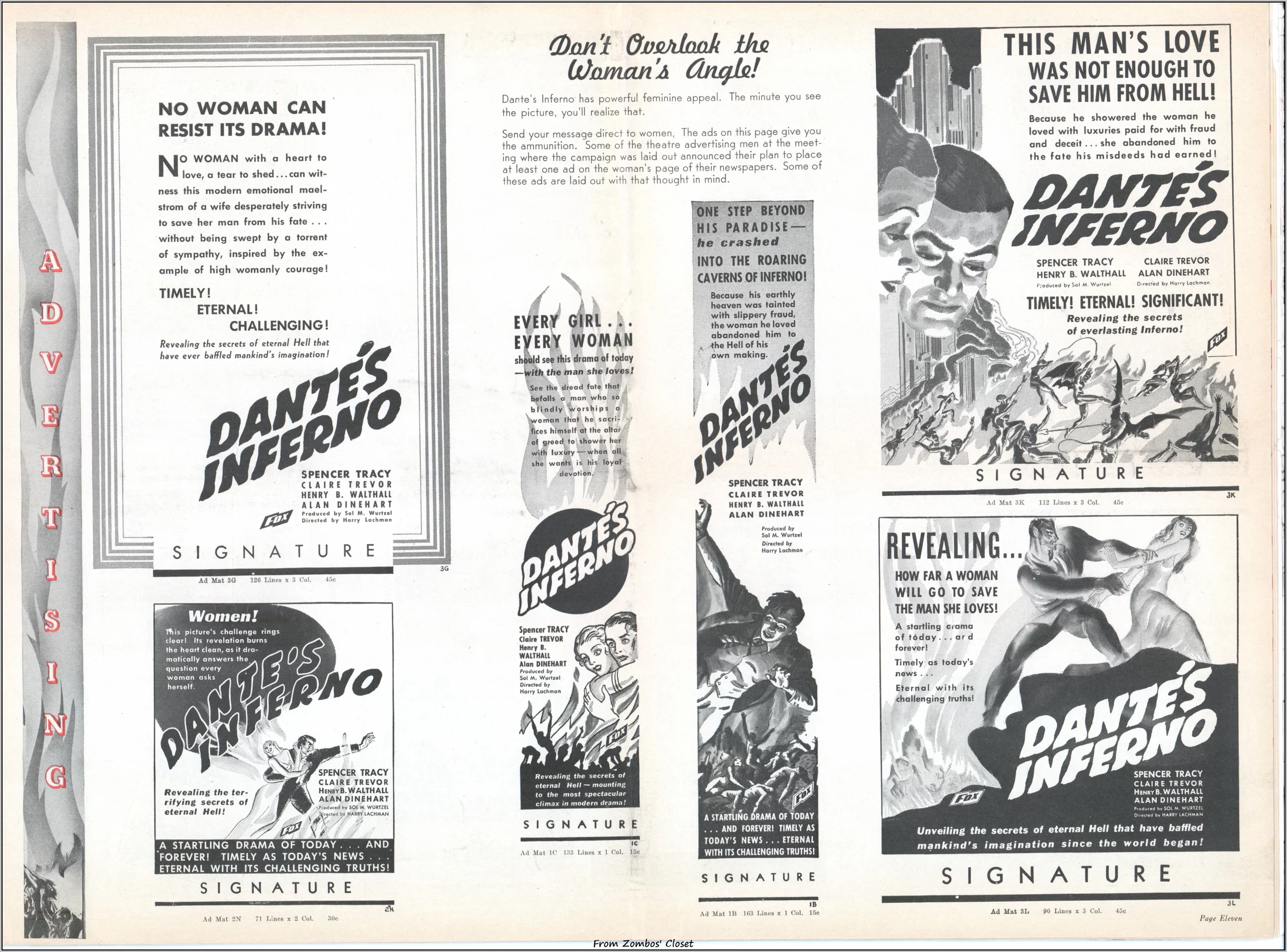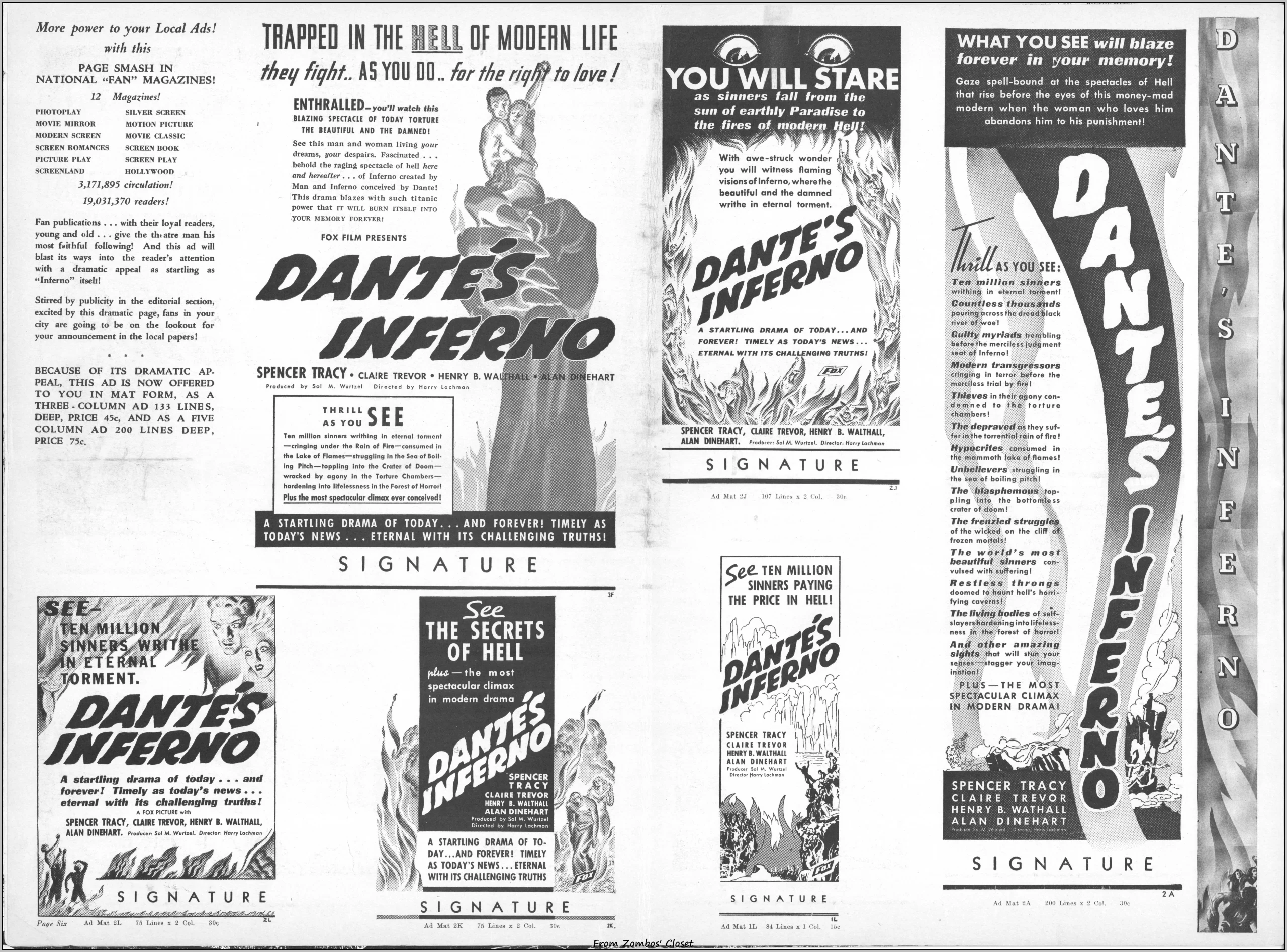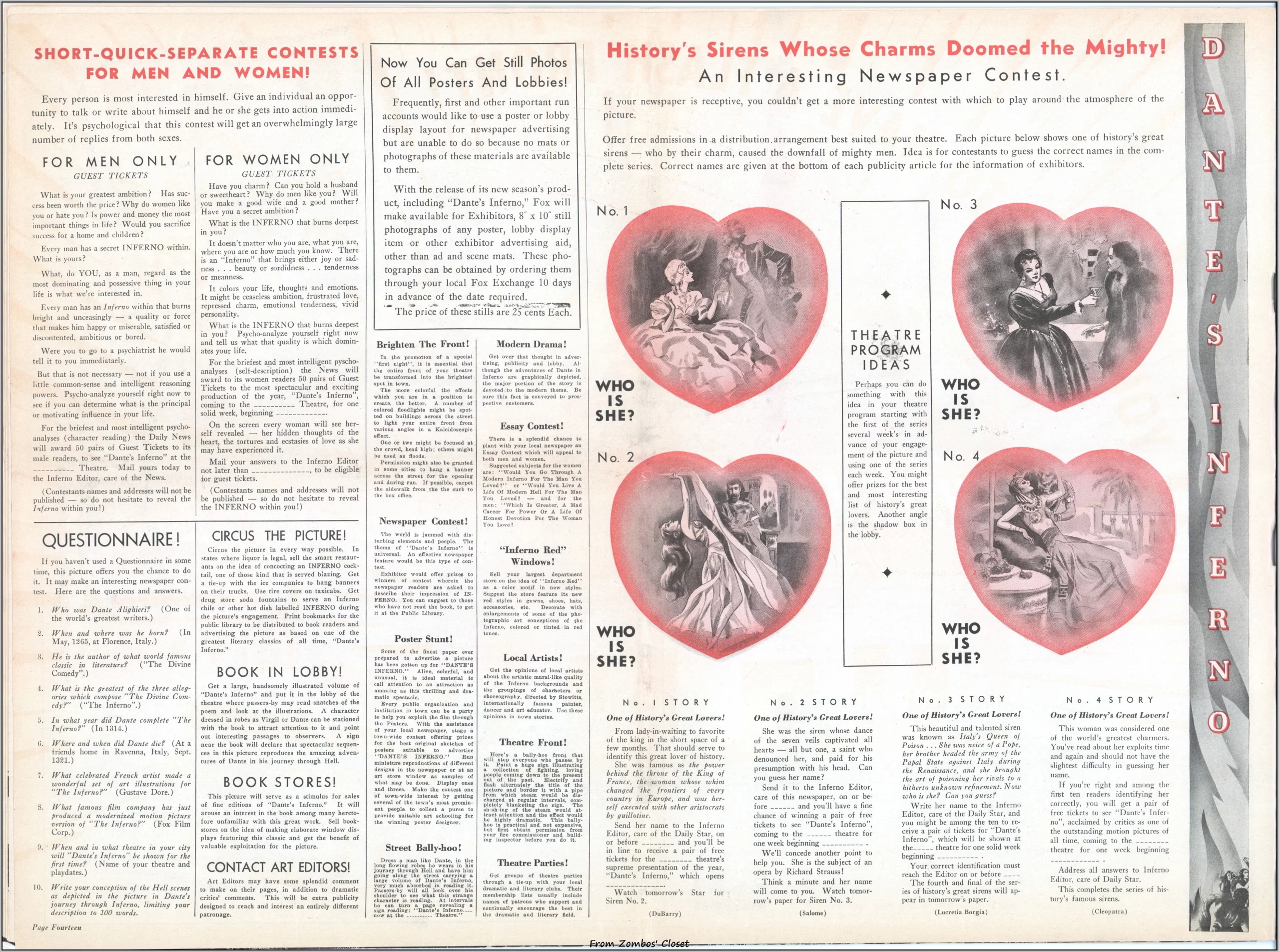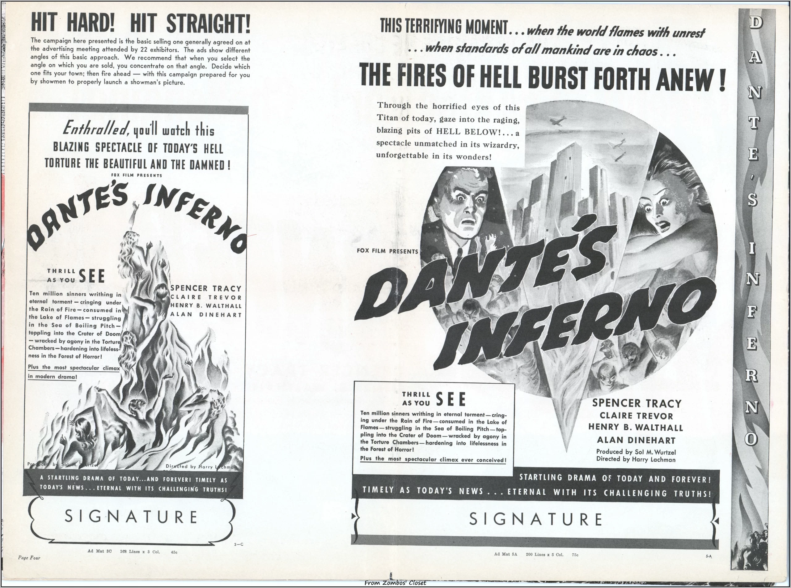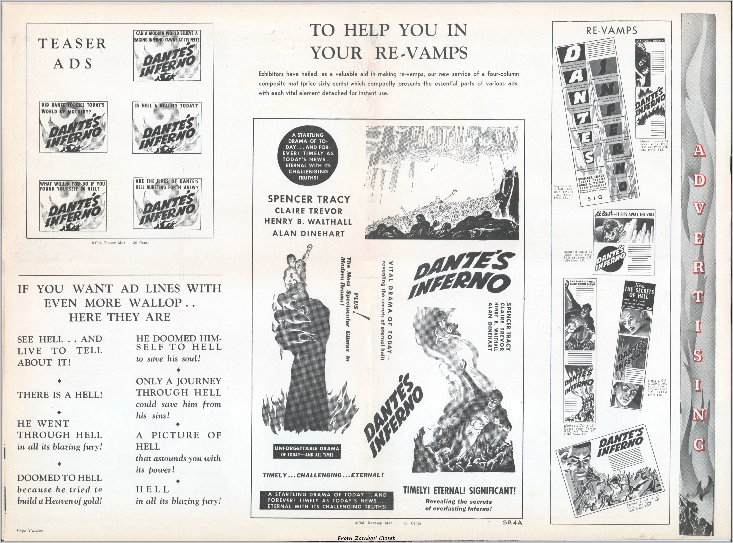 TCM, in their notes section for Dante’s Inferno (1935), states that Spencer Tracy “agreed to have his name eliminated from advertising and publicity regarding the film and from the opening screen credits.” He said it was the worst picture made anywhere, anytime. Variety did like the ten minutes of Hell, though. I haven’t seen the movie so can’t say either way, but this pressbook is awesome and cost a lot of money to print. It is 15.5 inches by 21.5 inches and lots of pages crammed with promotional information. There’s also a translucent red plastic sheet that was inserted into the pressbook, but not sure what that was for. (You will need a large screen to view this beauty online.) One other note from TCM citing the Hollywood Reporter: the movie was delayed due to the need to manufacture small articles of clothing for thousands of devils so the “purity squad’ wouldn’t be offended. Download the pressbook images here: Dante’s Inferno 1935 Pressbook