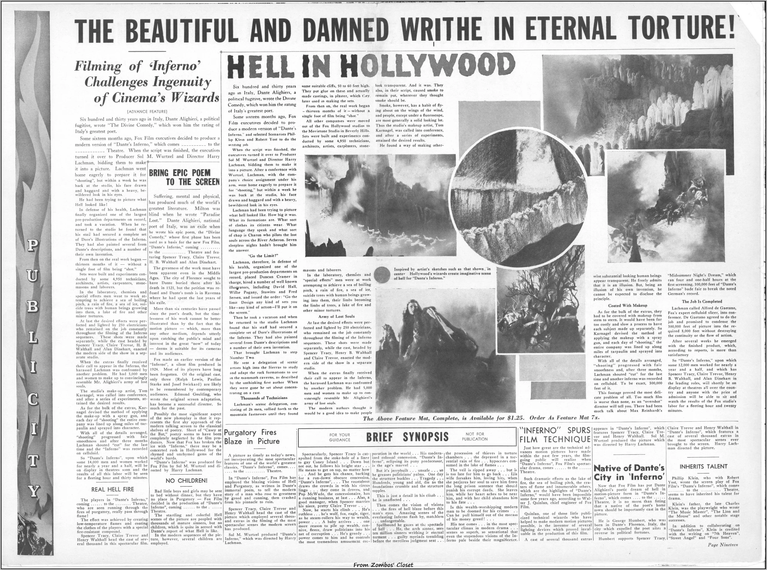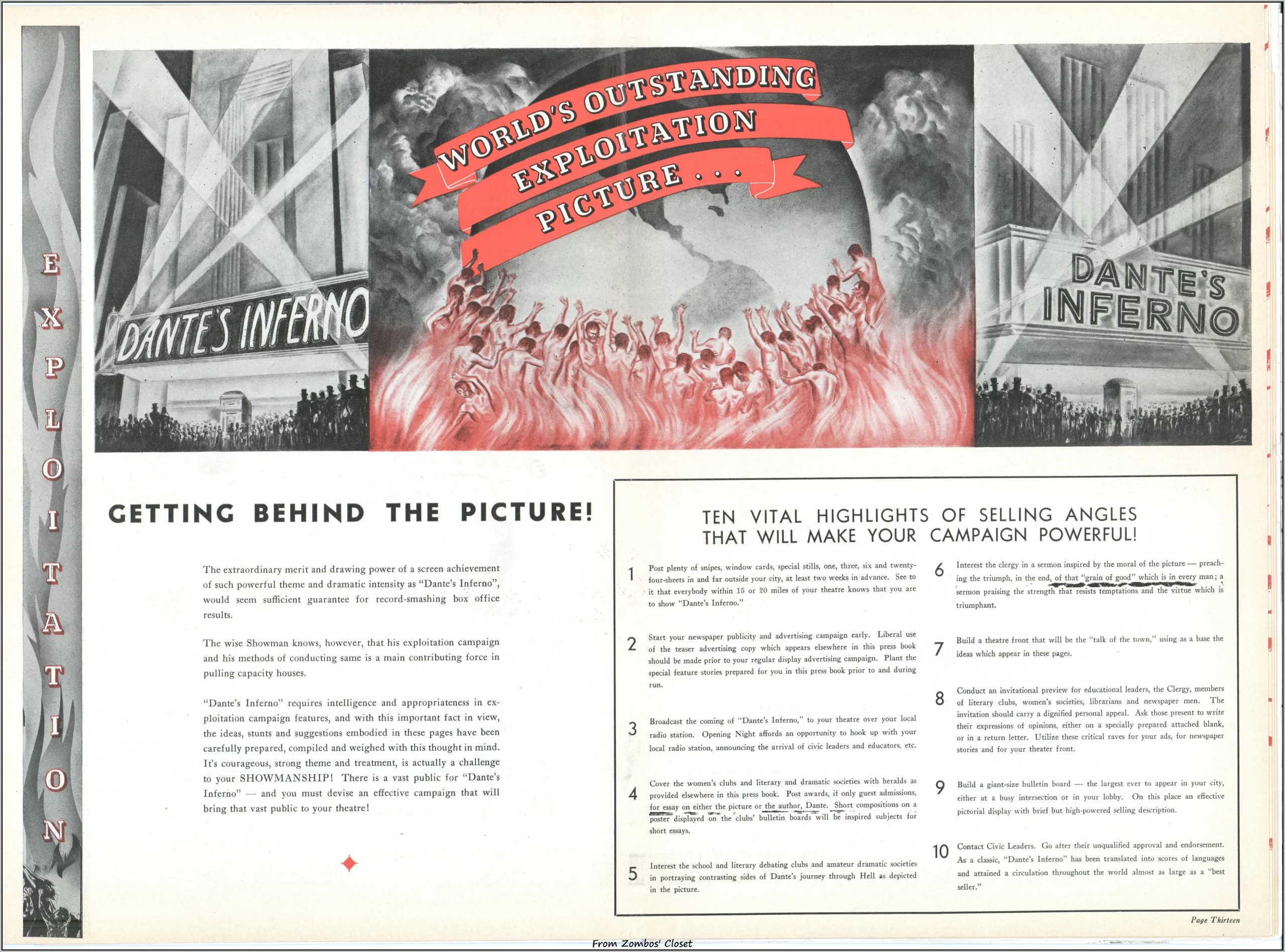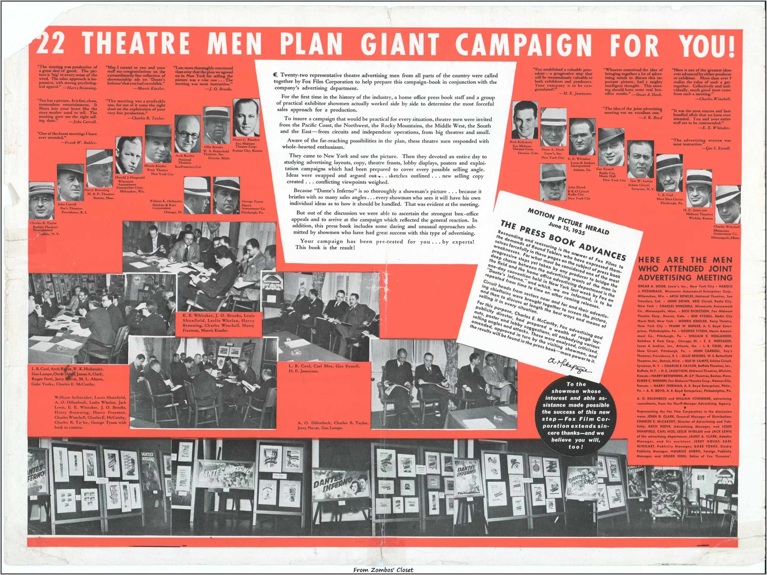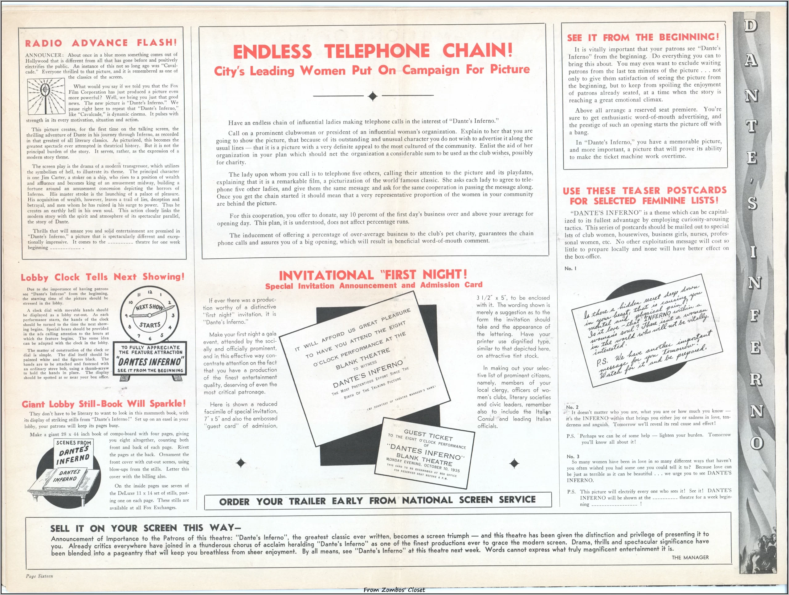 TCM, in their notes section for Dante’s Inferno (1935), states that Spencer Tracy “agreed to have his name eliminated from advertising and publicity regarding the film and from the opening screen credits.” He said it was the worst picture made anywhere, anytime. Variety did like the ten minutes of Hell, though. I haven’t seen the movie so can’t say either way, but this pressbook is awesome and cost a lot of money to print. It is 15.5 inches by 21.5 inches and lots of pages crammed with promotional information. There’s also a translucent red plastic sheet that was inserted into the pressbook, but not sure what that was for. (You will need a large screen to view this beauty online.) One other note from TCM citing the Hollywood Reporter: the movie was delayed due to the need to manufacture small articles of clothing for thousands of devils so the “purity squad’ wouldn’t be offended. Download the pressbook images here: Dante’s Inferno 1935 Pressbook