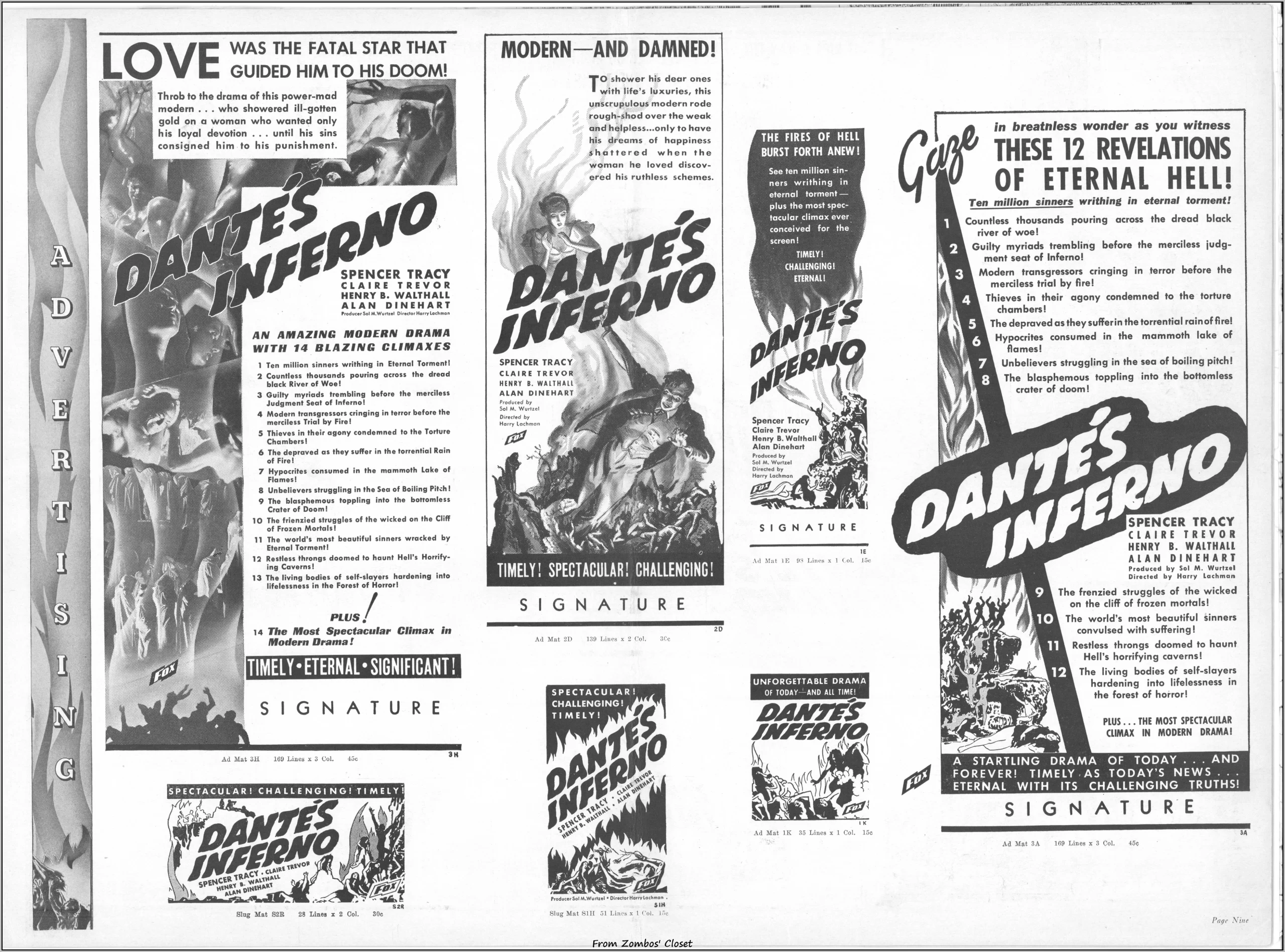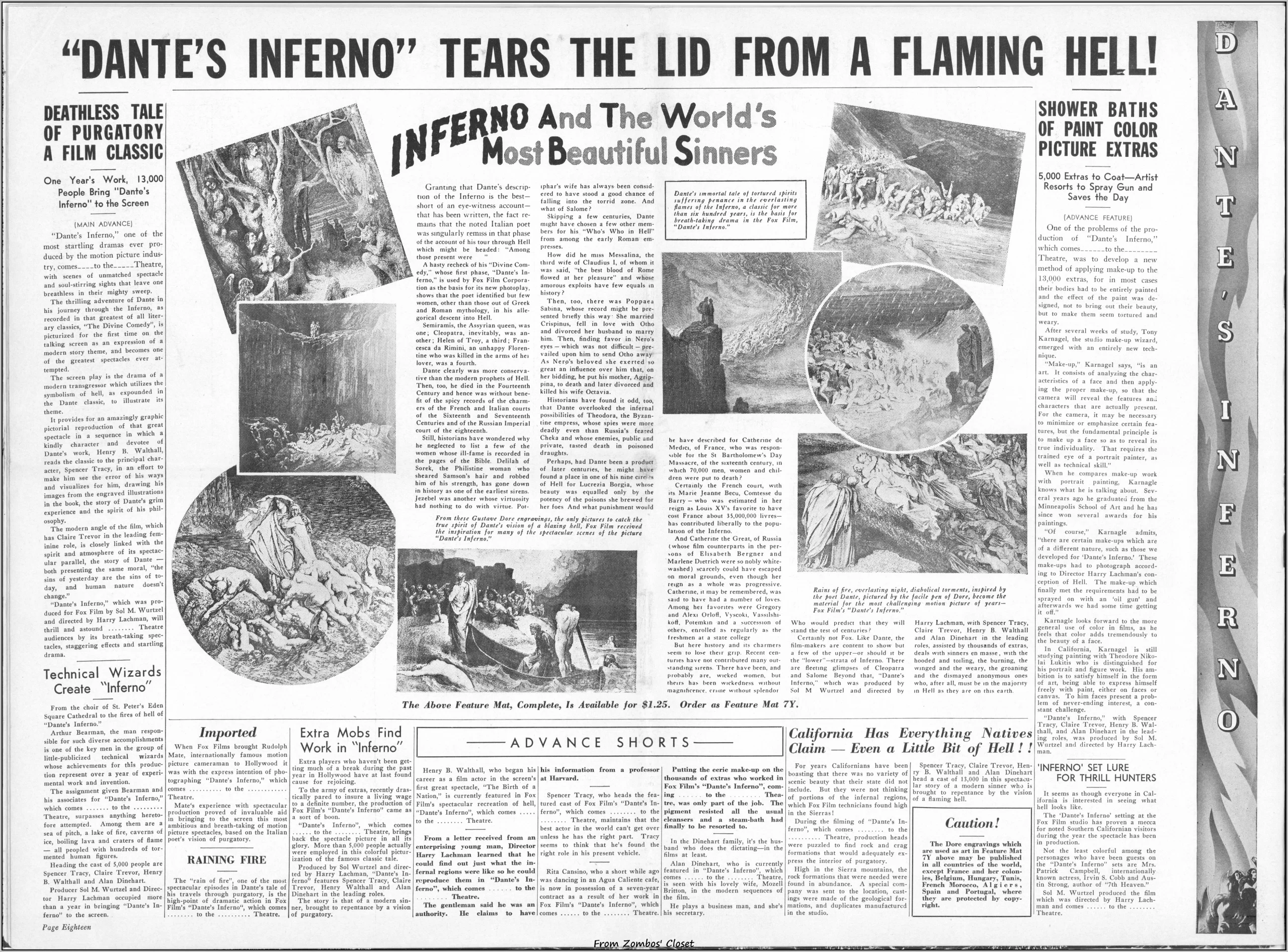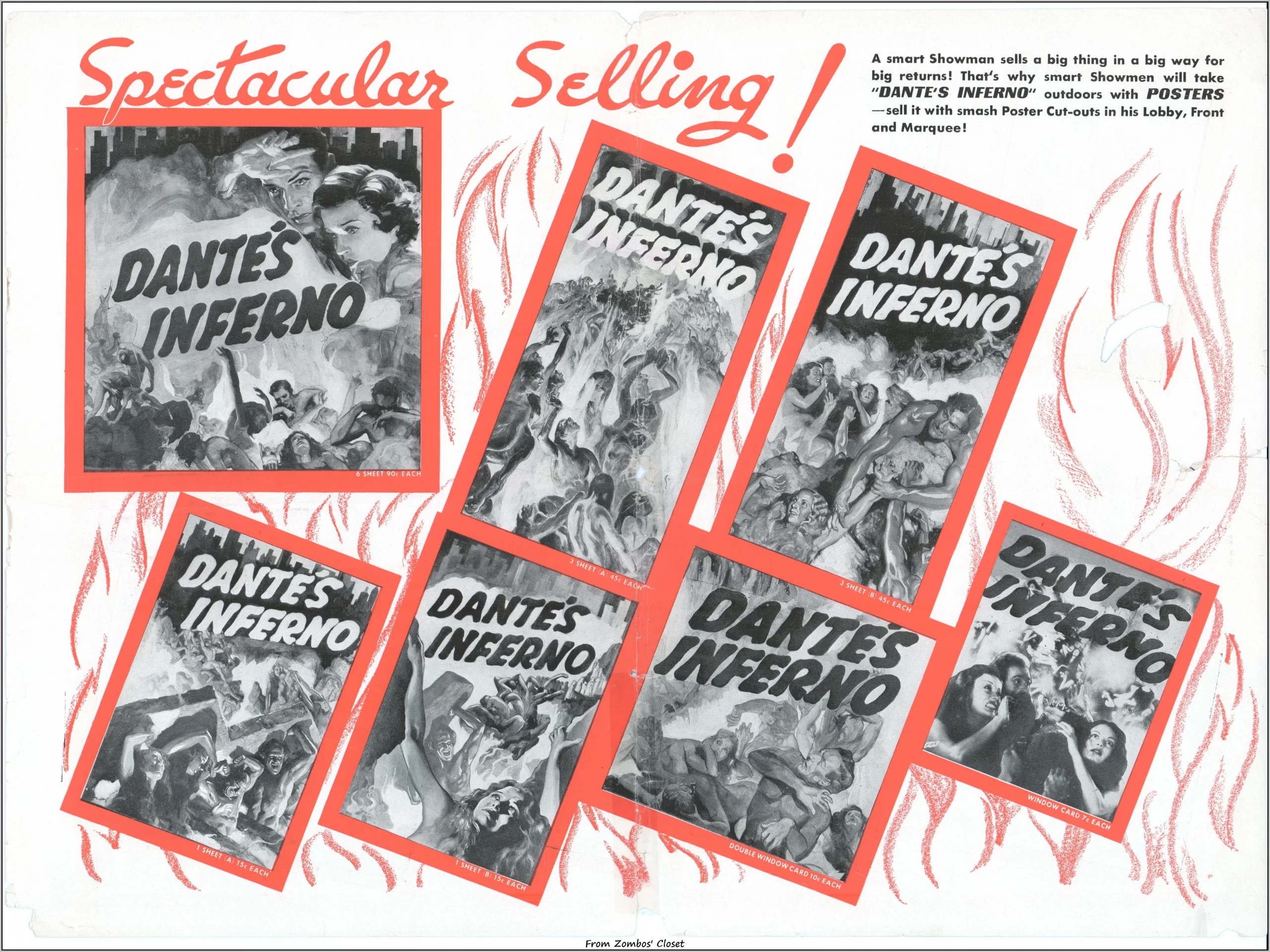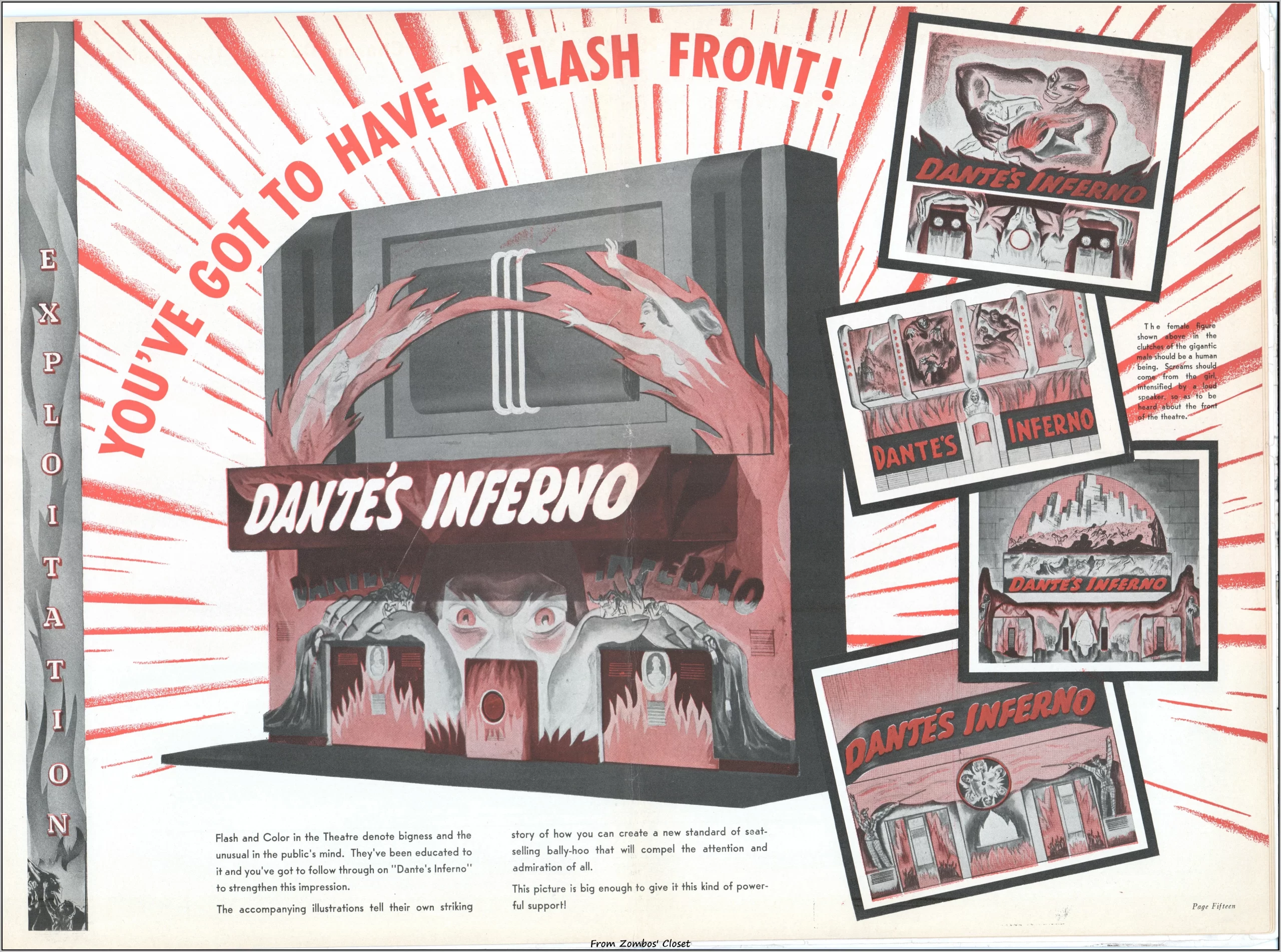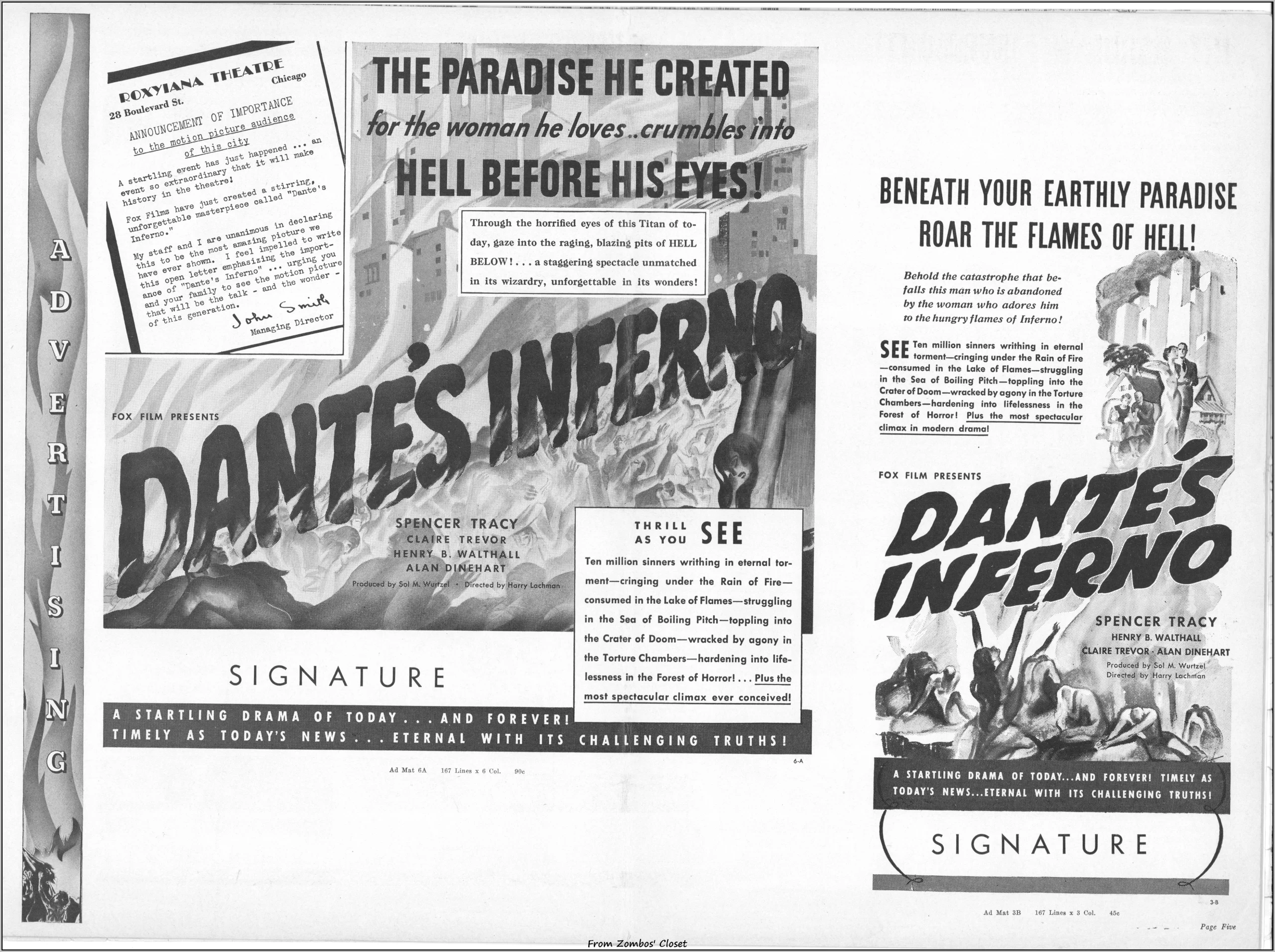 TCM, in their notes section for Dante’s Inferno (1935), states that Spencer Tracy “agreed to have his name eliminated from advertising and publicity regarding the film and from the opening screen credits.” He said it was the worst picture made anywhere, anytime. Variety did like the ten minutes of Hell, though. I haven’t seen the movie so can’t say either way, but this pressbook is awesome and cost a lot of money to print. It is 15.5 inches by 21.5 inches and lots of pages crammed with promotional information. There’s also a translucent red plastic sheet that was inserted into the pressbook, but not sure what that was for. (You will need a large screen to view this beauty online.) One other note from TCM citing the Hollywood Reporter: the movie was delayed due to the need to manufacture small articles of clothing for thousands of devils so the “purity squad’ wouldn’t be offended. Download the pressbook images here: Dante’s Inferno 1935 Pressbook