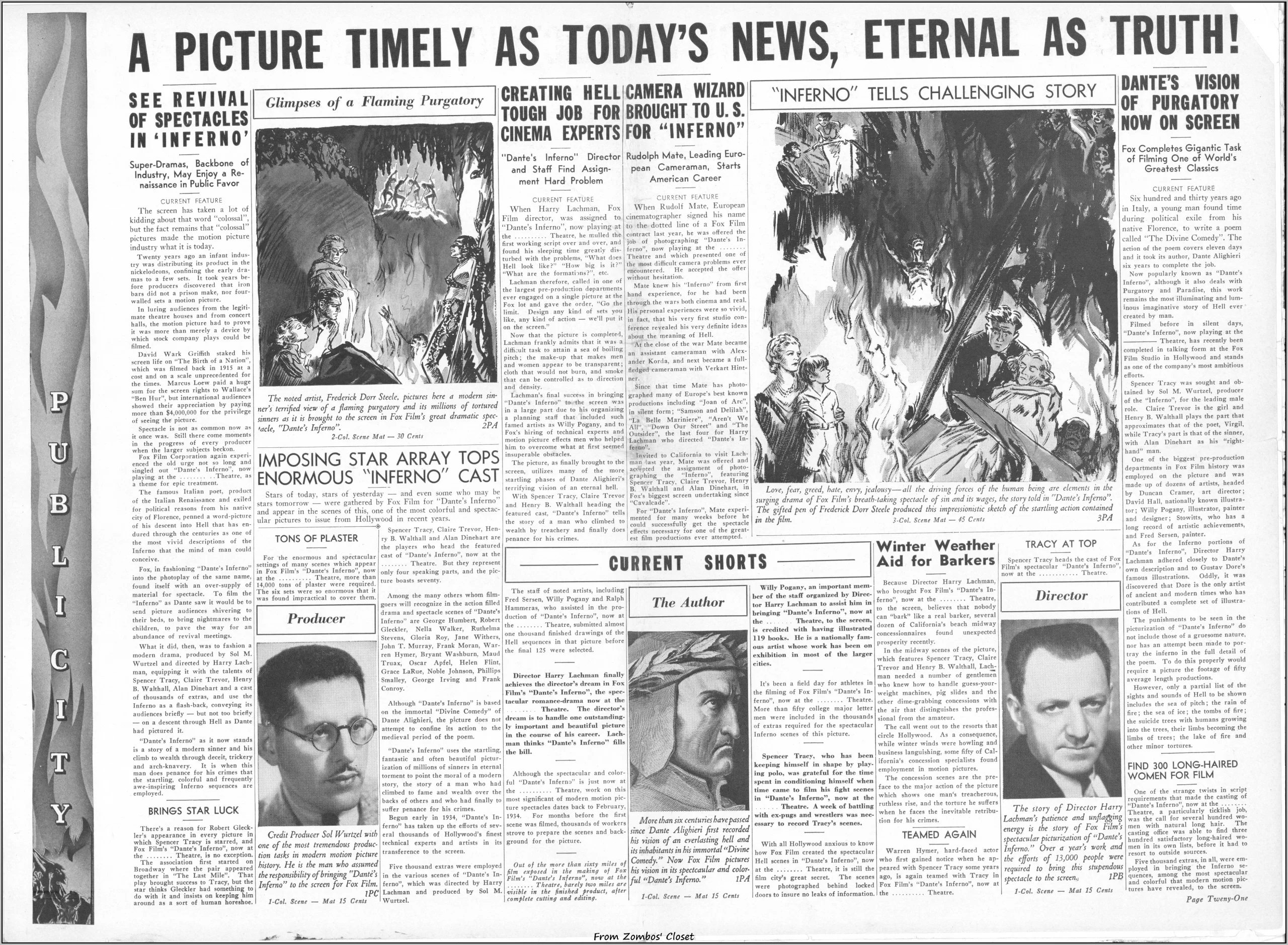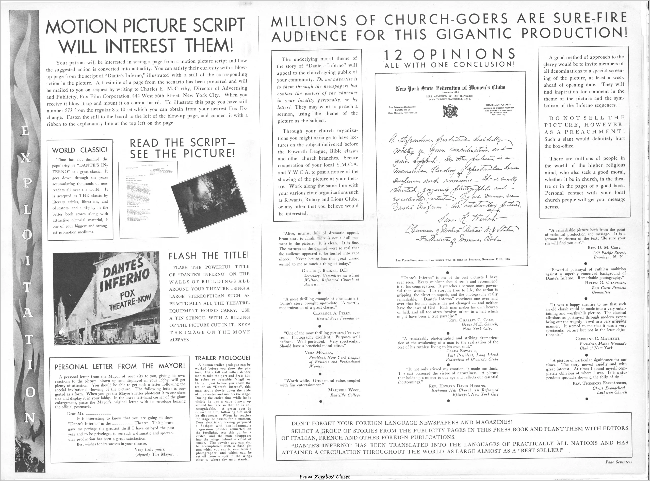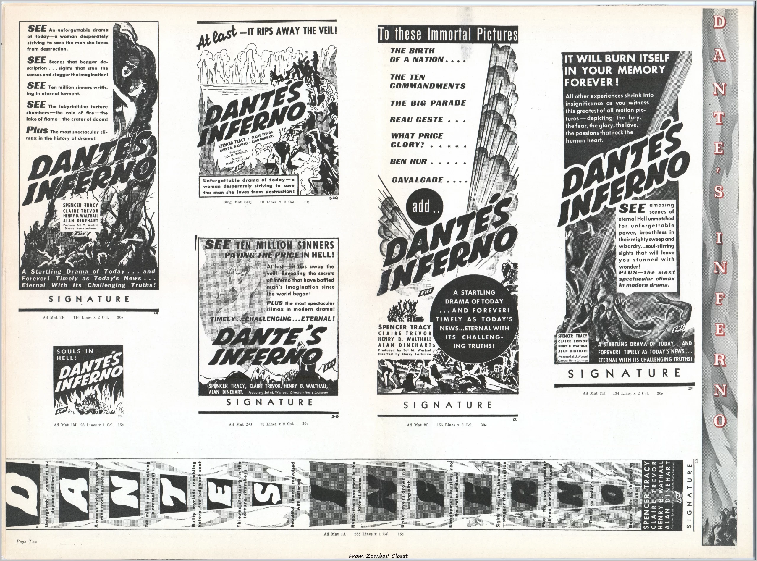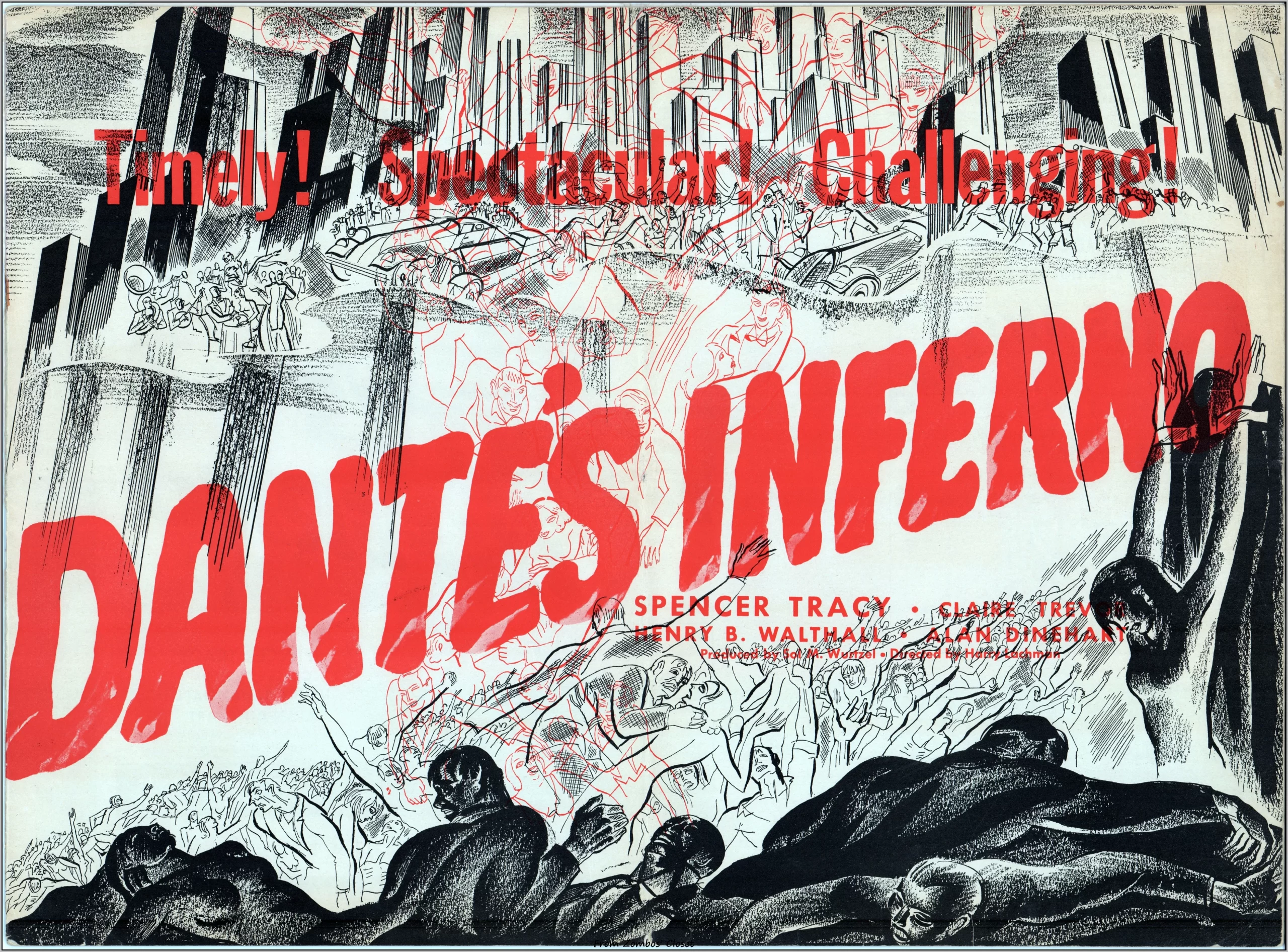 TCM, in their notes section for Dante’s Inferno (1935), states that Spencer Tracy “agreed to have his name eliminated from advertising and publicity regarding the film and from the opening screen credits.” He said it was the worst picture made anywhere, anytime. Variety did like the ten minutes of Hell, though. I haven’t seen the movie so can’t say either way, but this pressbook is awesome and cost a lot of money to print. It is 15.5 inches by 21.5 inches and lots of pages crammed with promotional information. There’s also a translucent red plastic sheet that was inserted into the pressbook, but not sure what that was for. (You will need a large screen to view this beauty online.) One other note from TCM citing the Hollywood Reporter: the movie was delayed due to the need to manufacture small articles of clothing for thousands of devils so the “purity squad’ wouldn’t be offended. Download the pressbook images here: Dante’s Inferno 1935 Pressbook