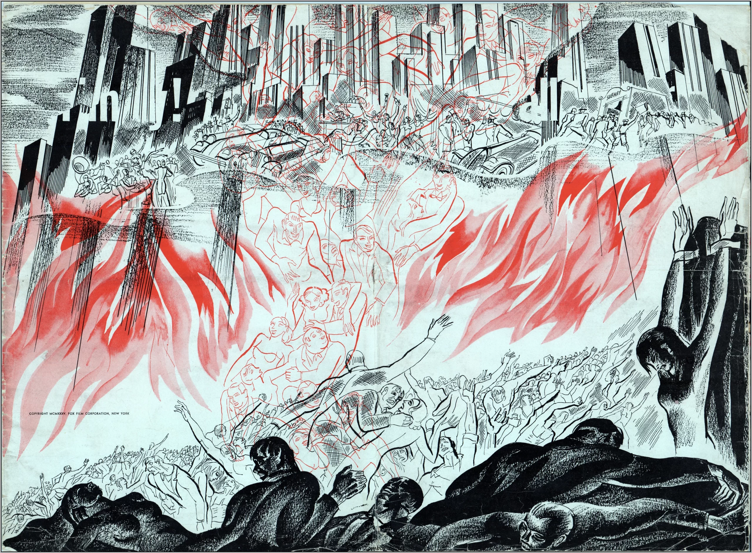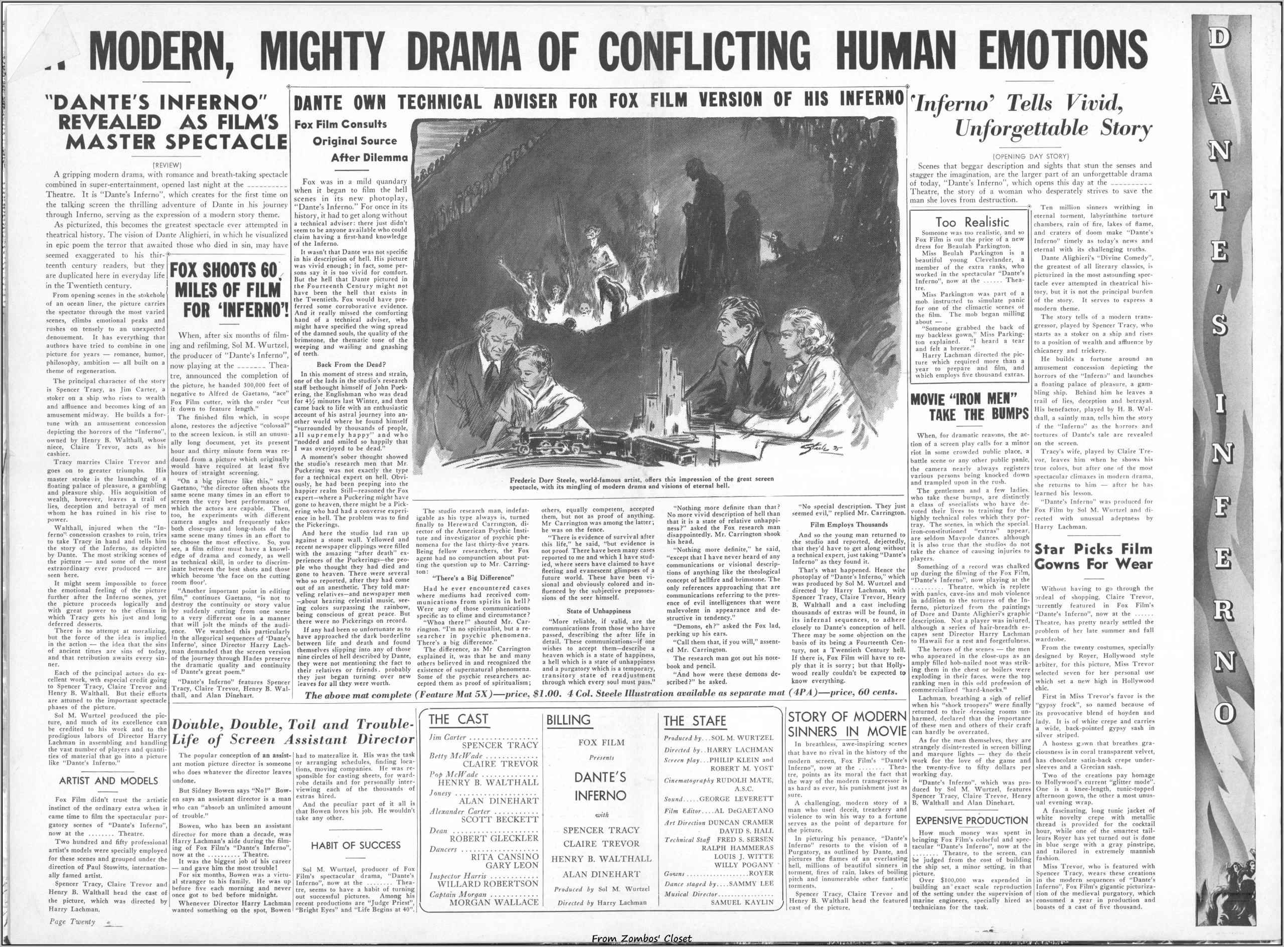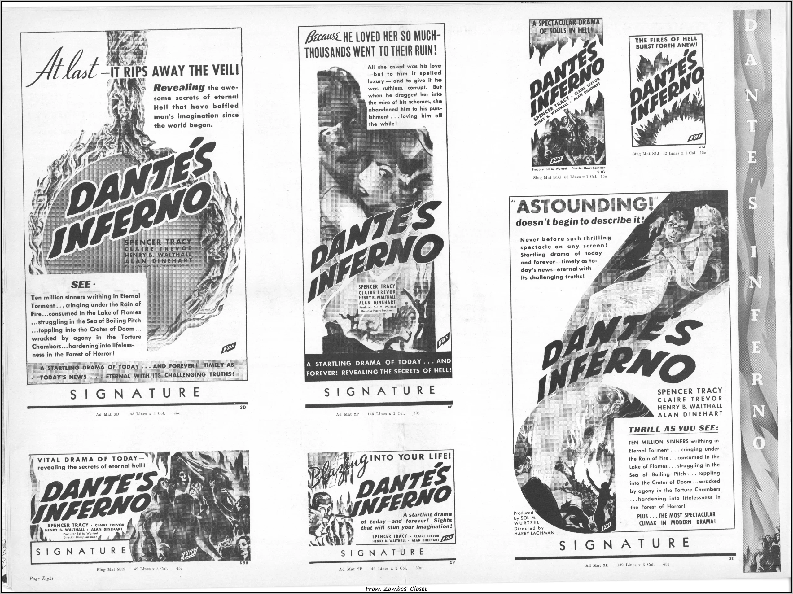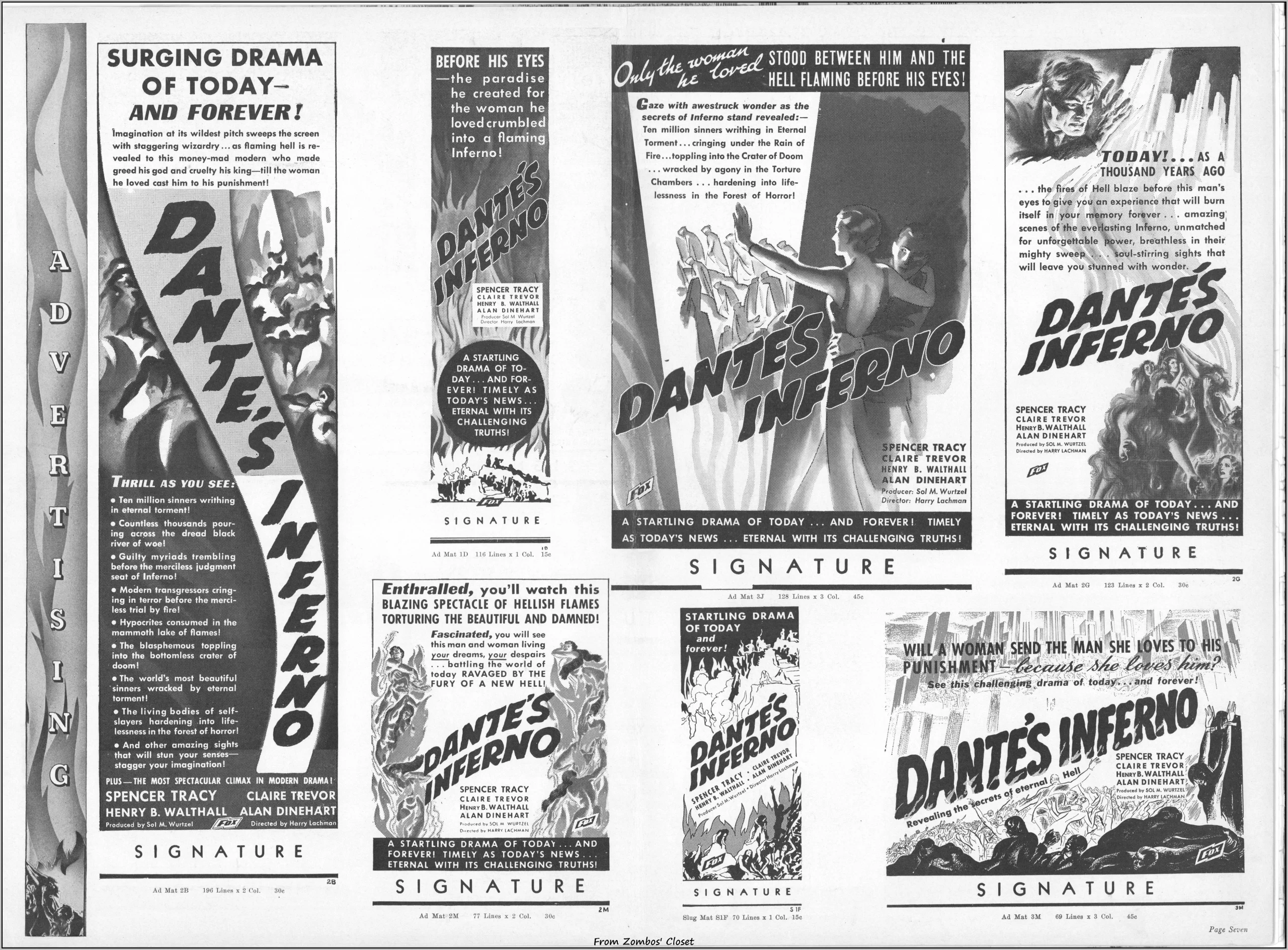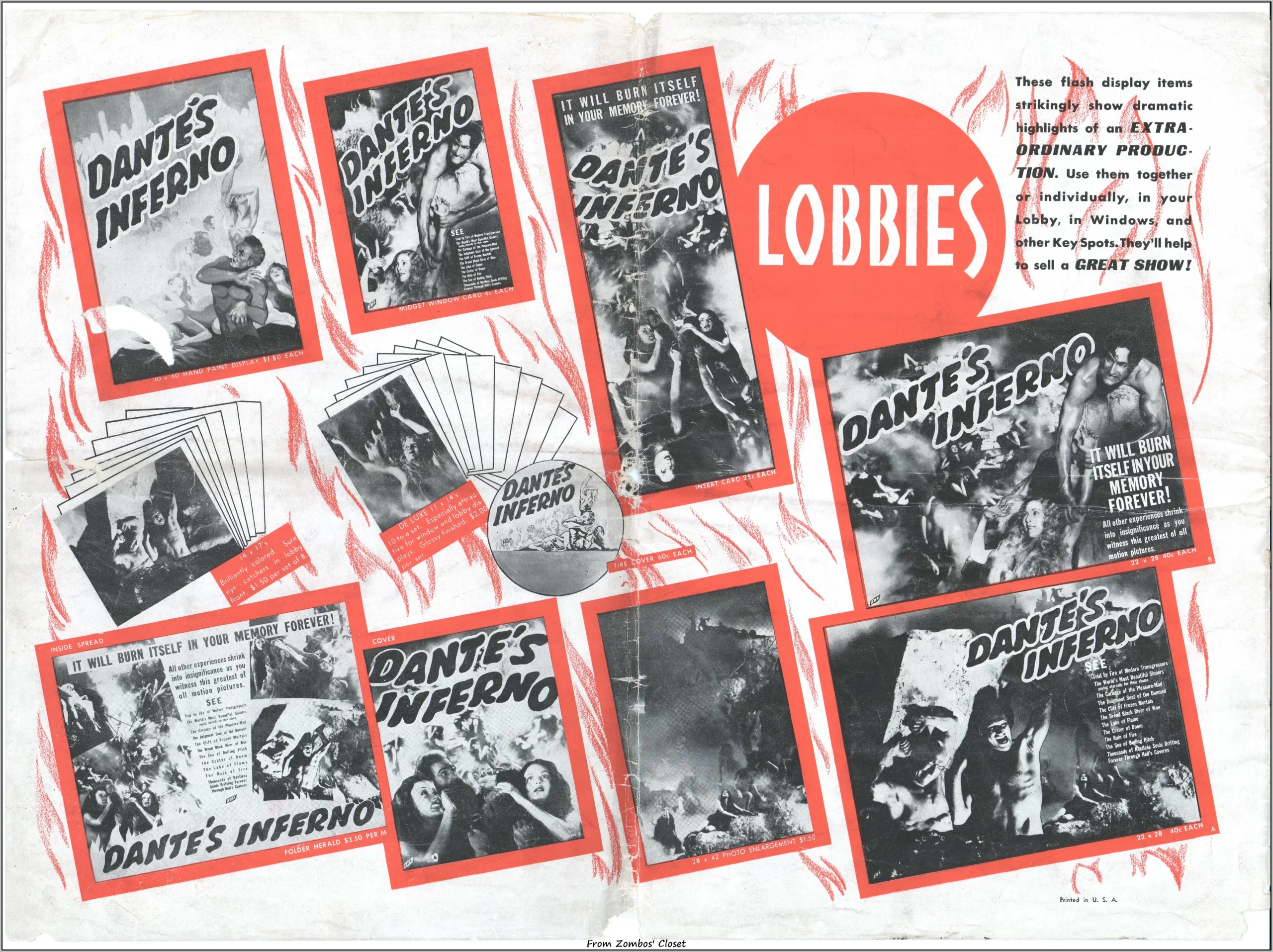 TCM, in their notes section for Dante’s Inferno (1935), states that Spencer Tracy “agreed to have his name eliminated from advertising and publicity regarding the film and from the opening screen credits.” He said it was the worst picture made anywhere, anytime. Variety did like the ten minutes of Hell, though. I haven’t seen the movie so can’t say either way, but this pressbook is awesome and cost a lot of money to print. It is 15.5 inches by 21.5 inches and lots of pages crammed with promotional information. There’s also a translucent red plastic sheet that was inserted into the pressbook, but not sure what that was for. (You will need a large screen to view this beauty online.) One other note from TCM citing the Hollywood Reporter: the movie was delayed due to the need to manufacture small articles of clothing for thousands of devils so the “purity squad’ wouldn’t be offended. Download the pressbook images here: Dante’s Inferno 1935 Pressbook