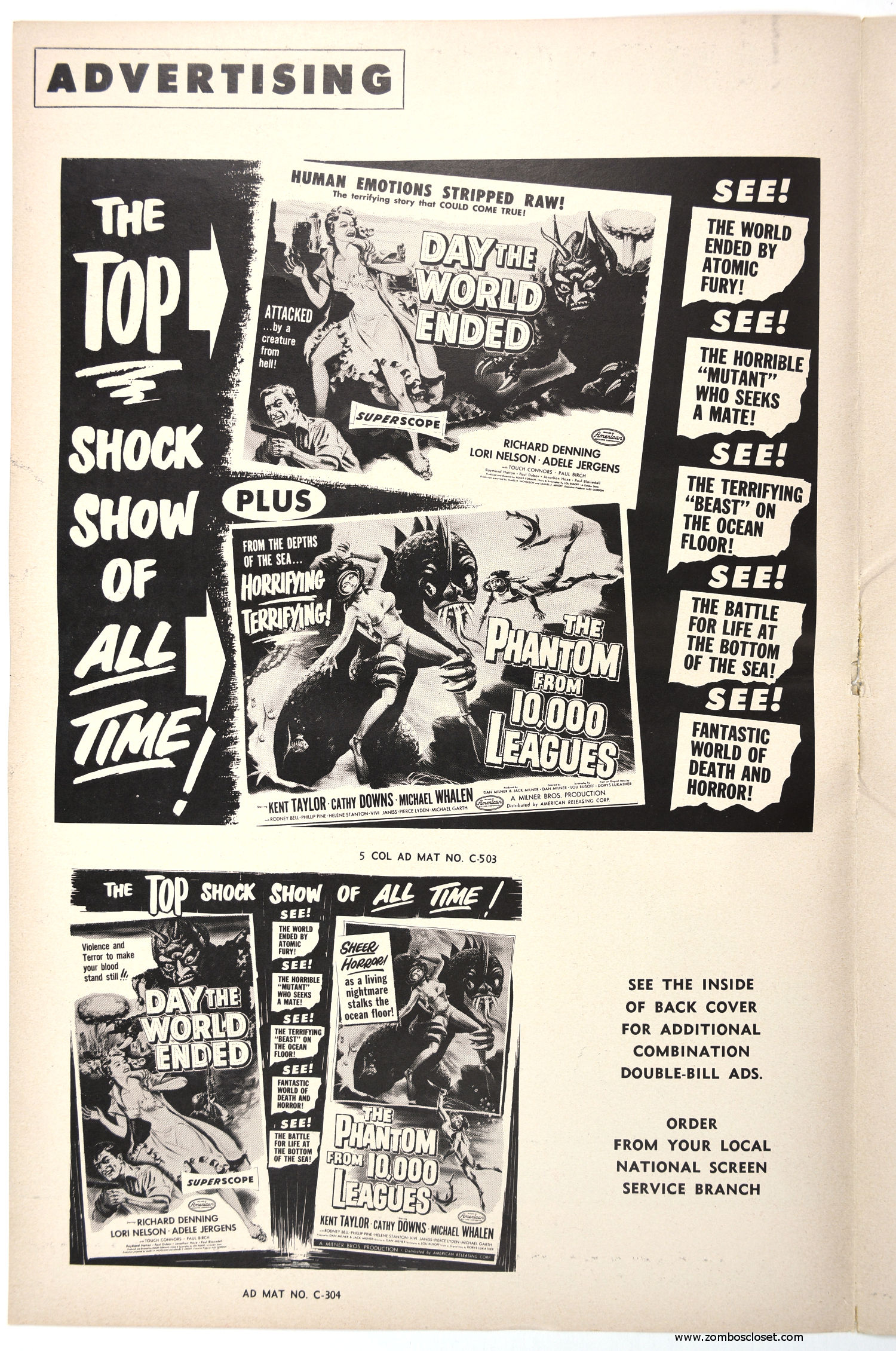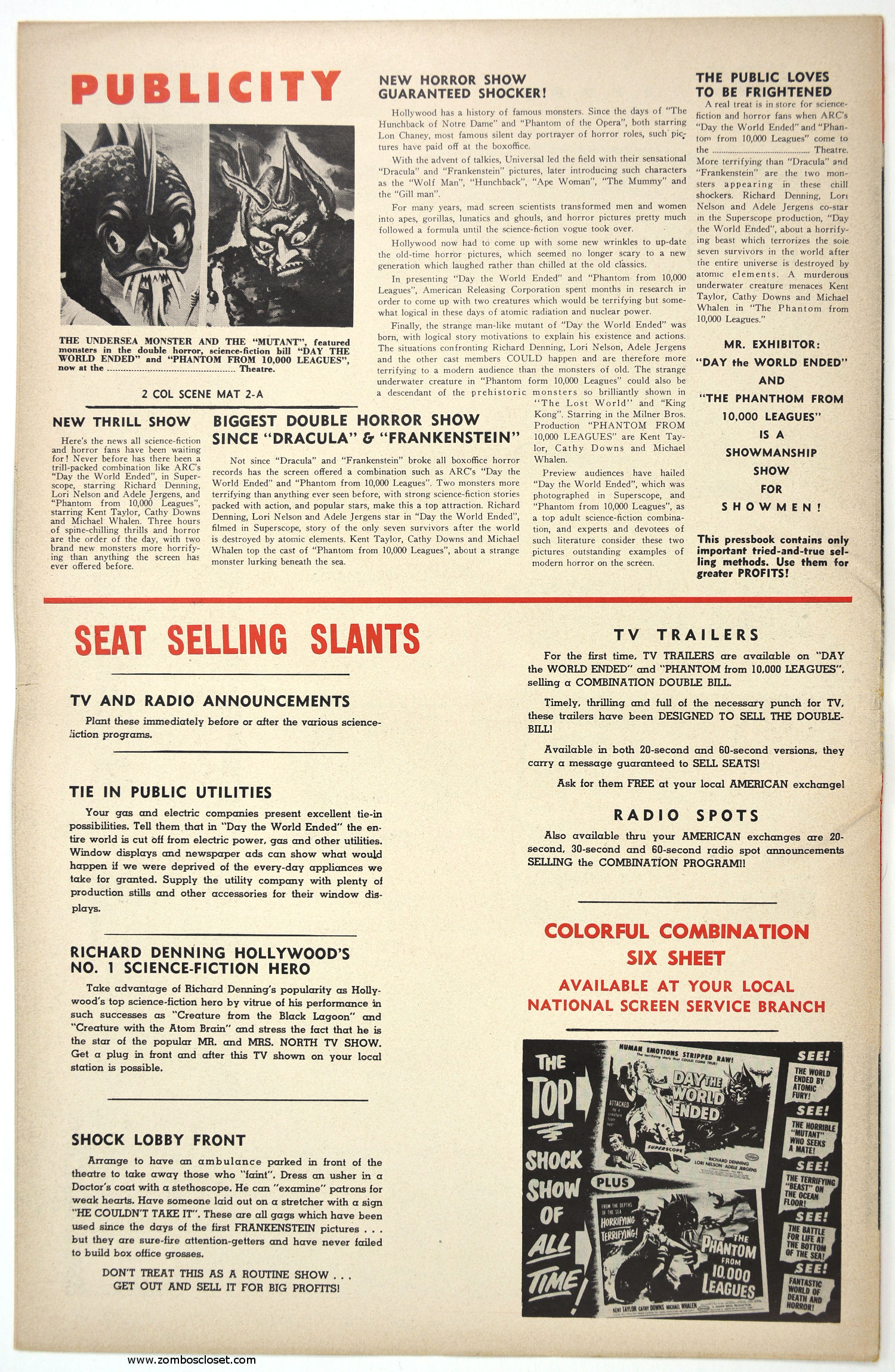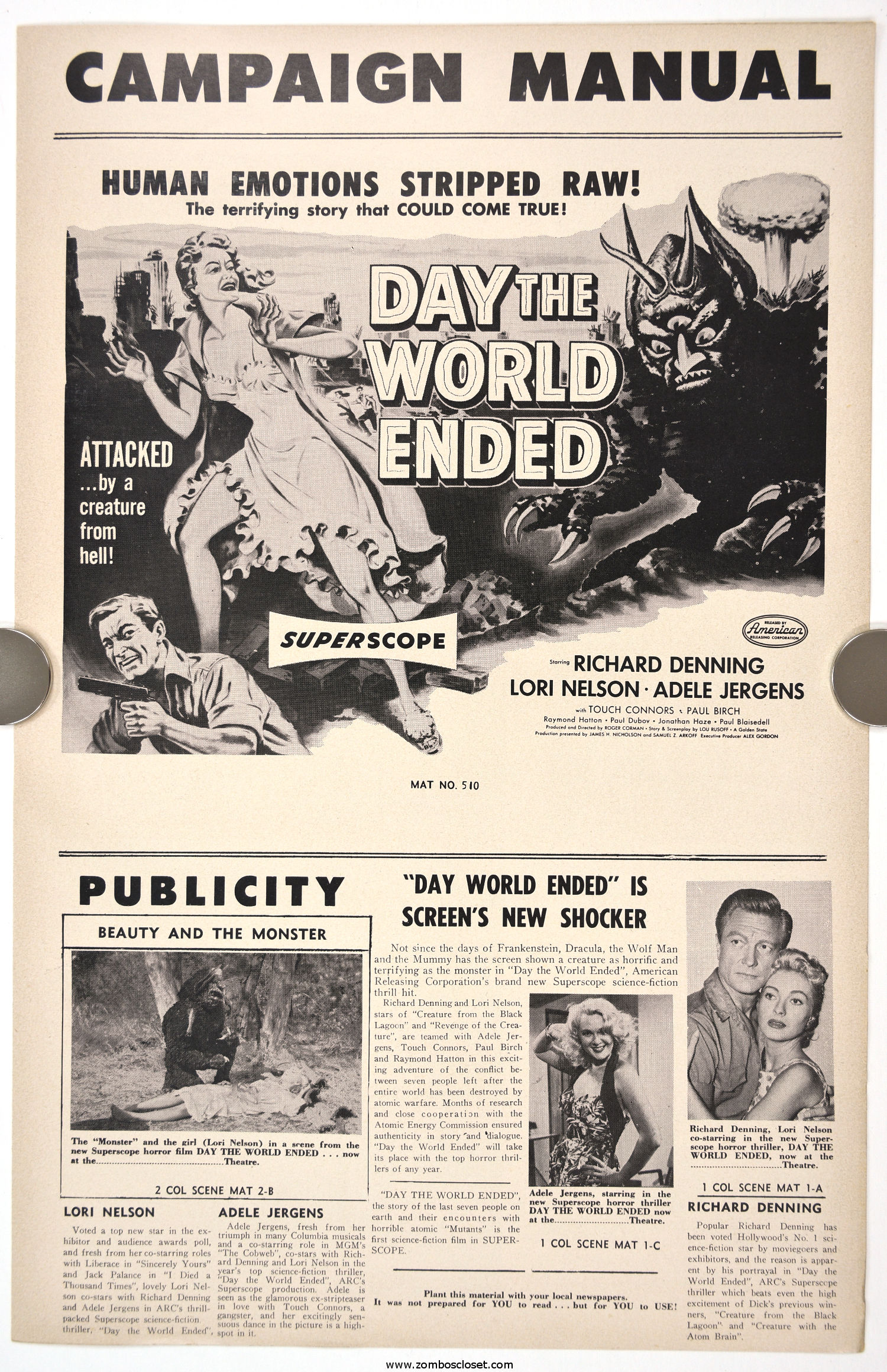 Roger Corman directed fourth movie, Day the World Ended, starred Richard Denning, Paul Birch, and Marty the Mutated Monster courtesy of Paul Blaisdell. Double billed with The Phantom From 10,000 Leagues, the pair made a tidy profit. It was the first double feature offering by American Releasing Corporation, later known by horror fans as American International Pictures. Day is the better of the two movies.