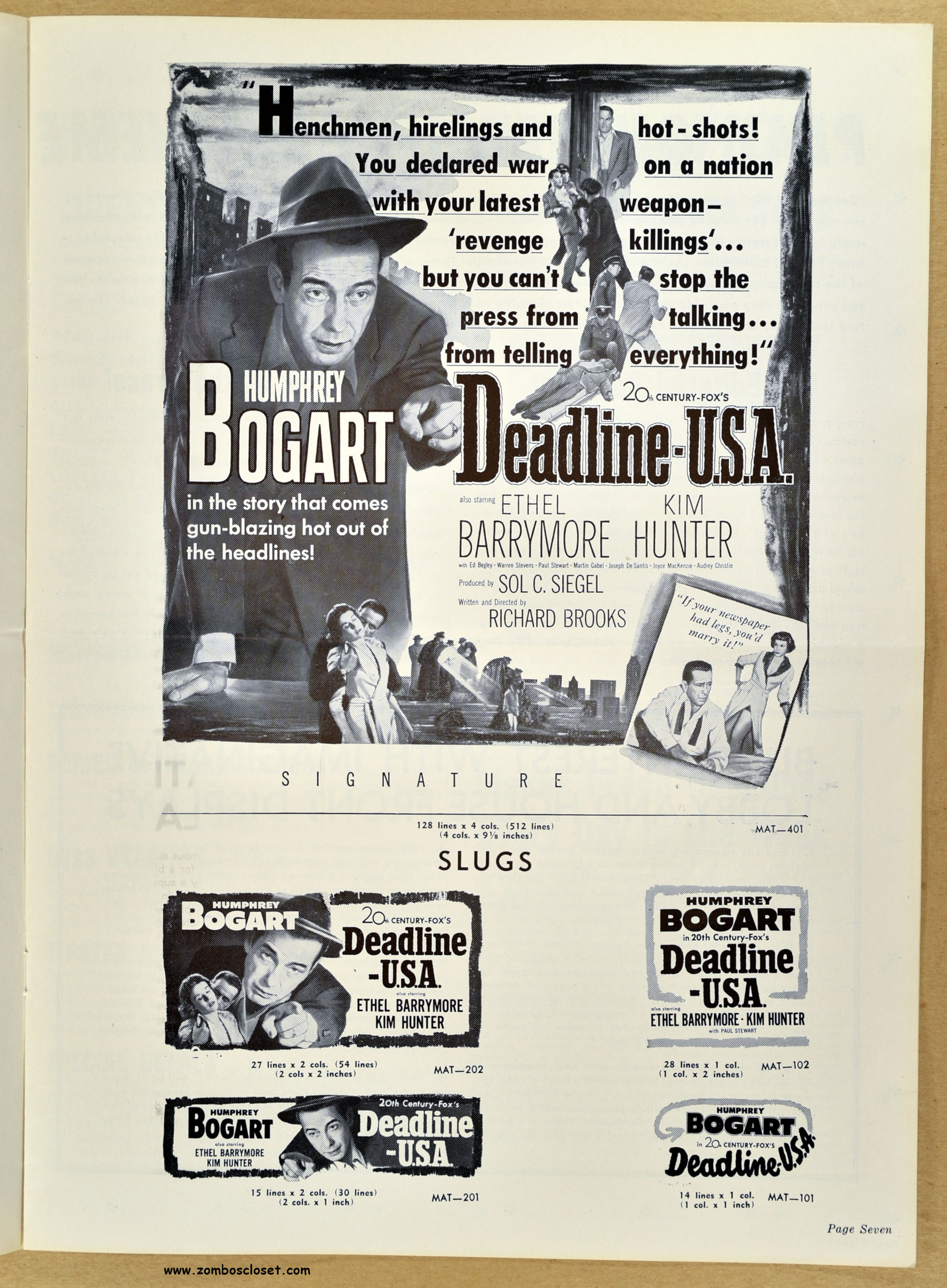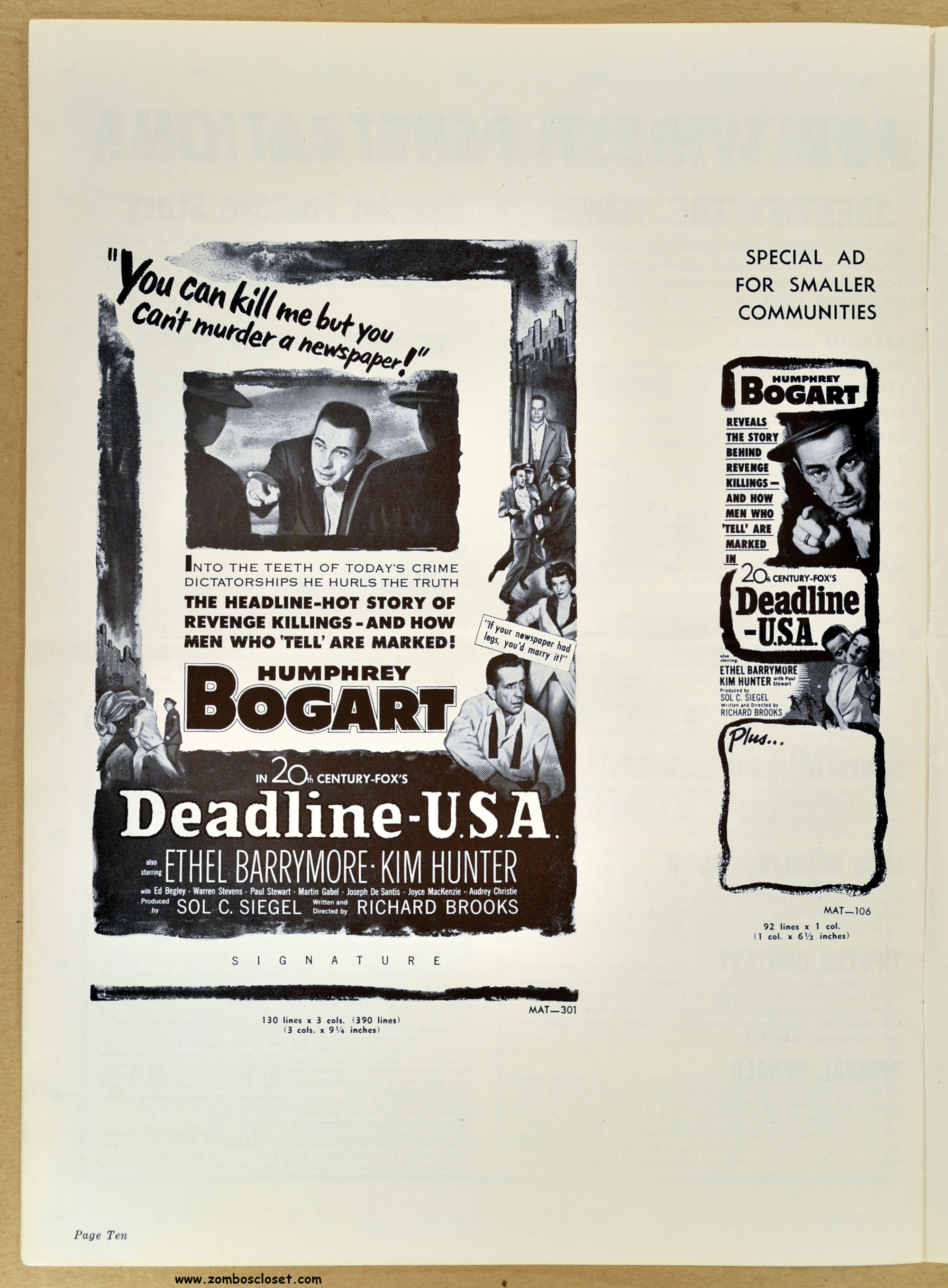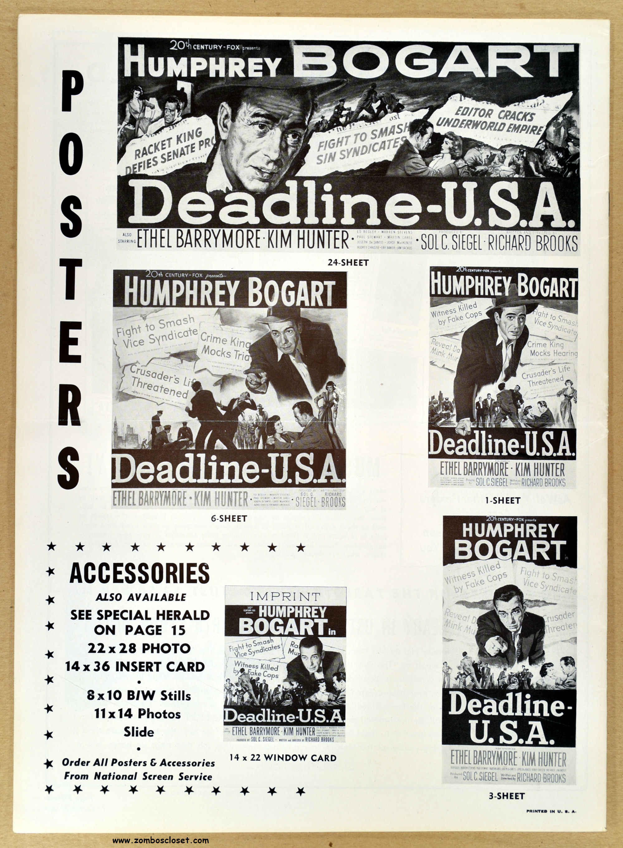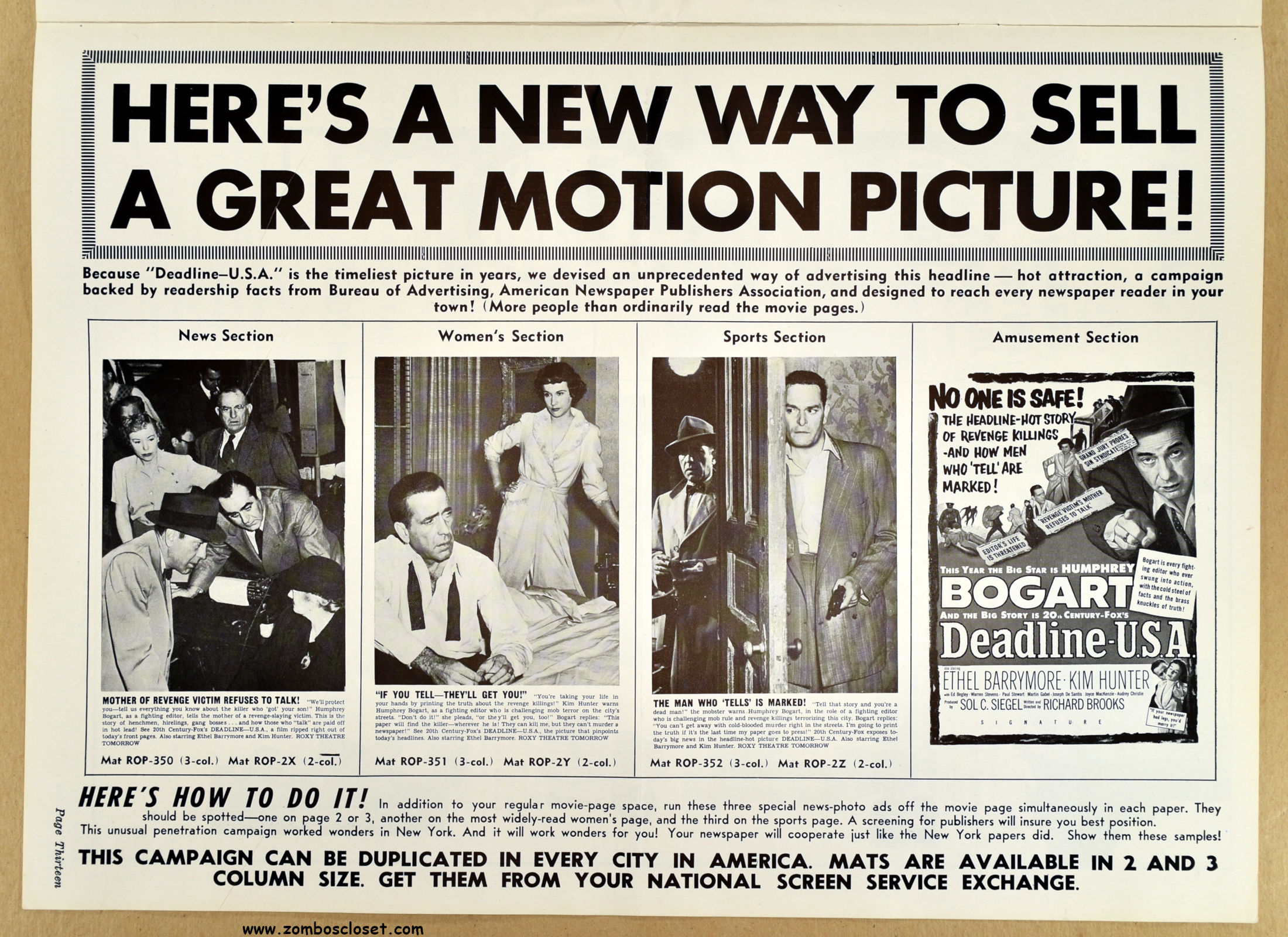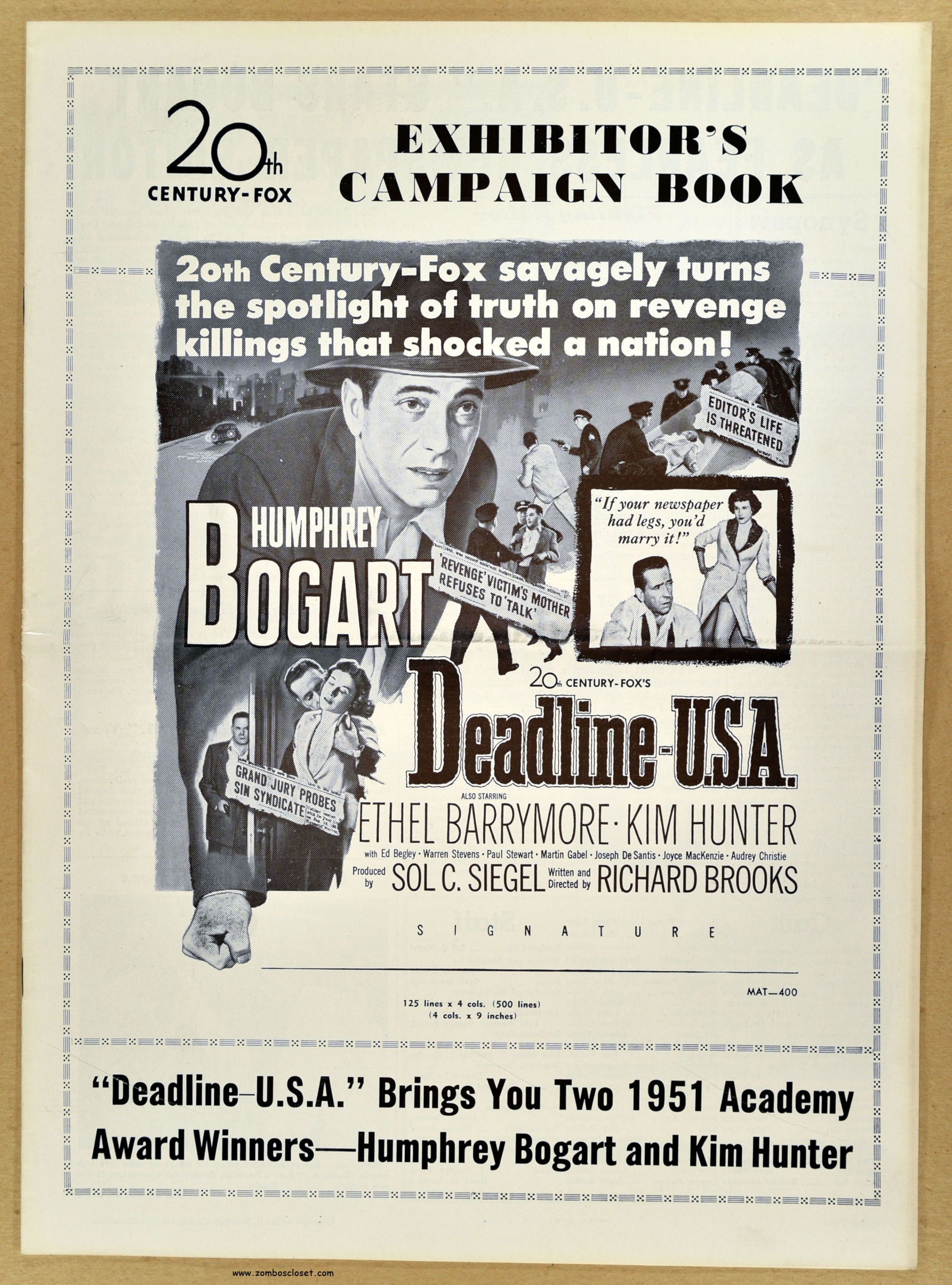 Humphrey Bogart tackles lies, criminal activity, and a struggling newspaper in Deadline-U.S.A. At least he didn't have to deal with the effects of the Internet and 24/7 newsy views dumping. Here's the hard-hitting 16-page pressbook.