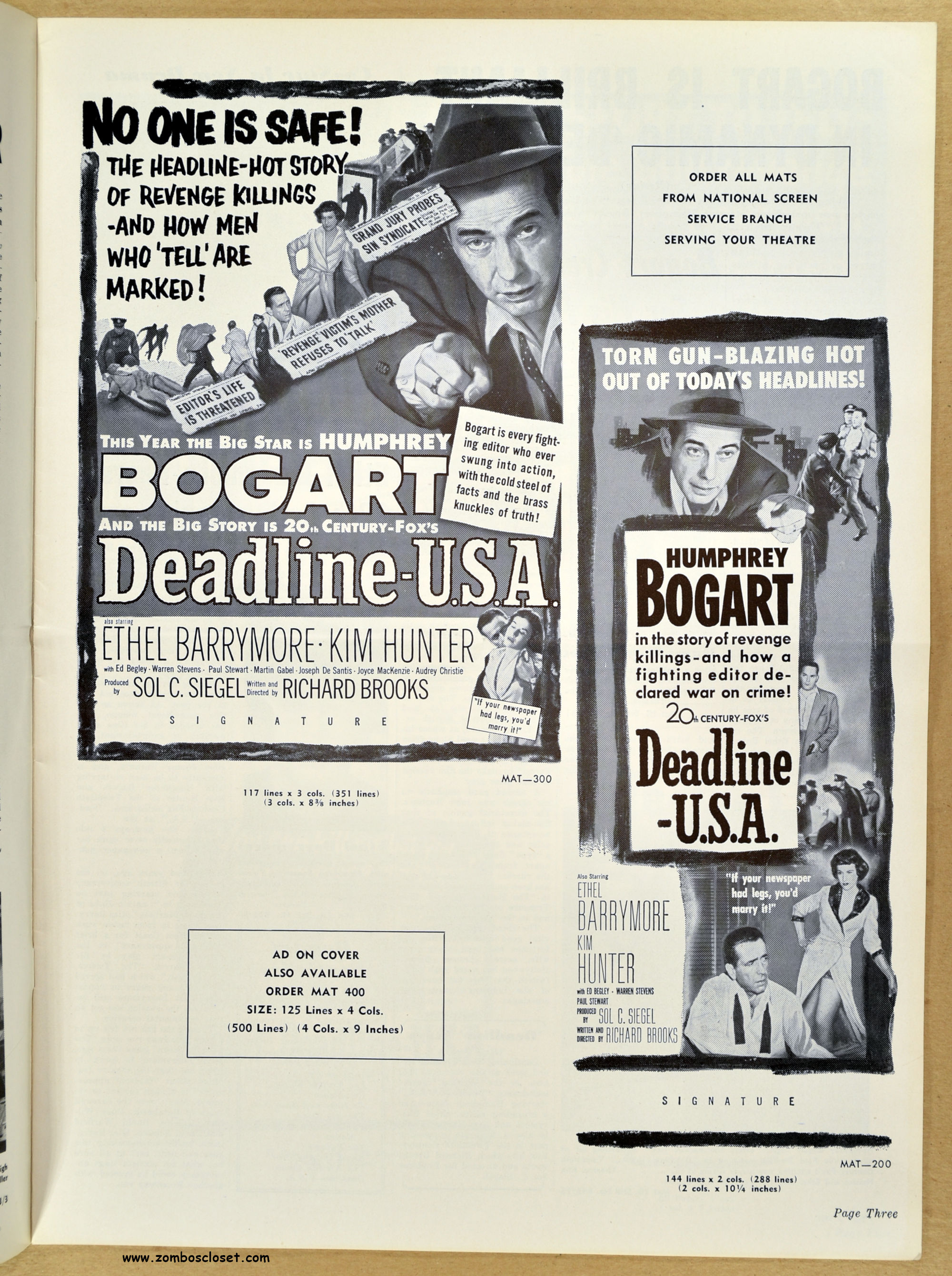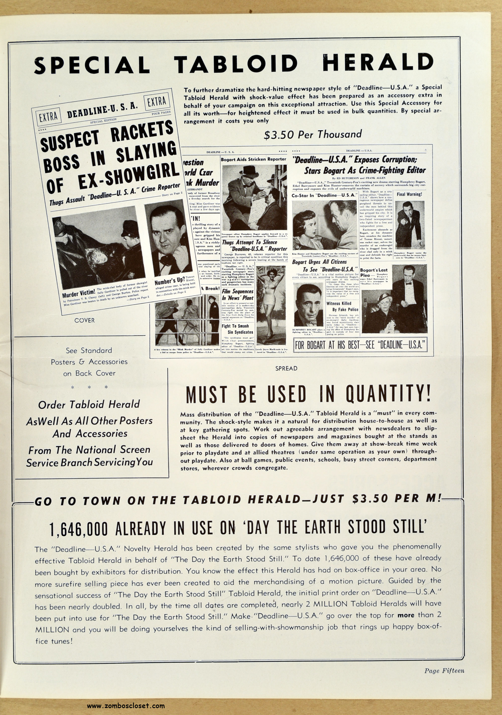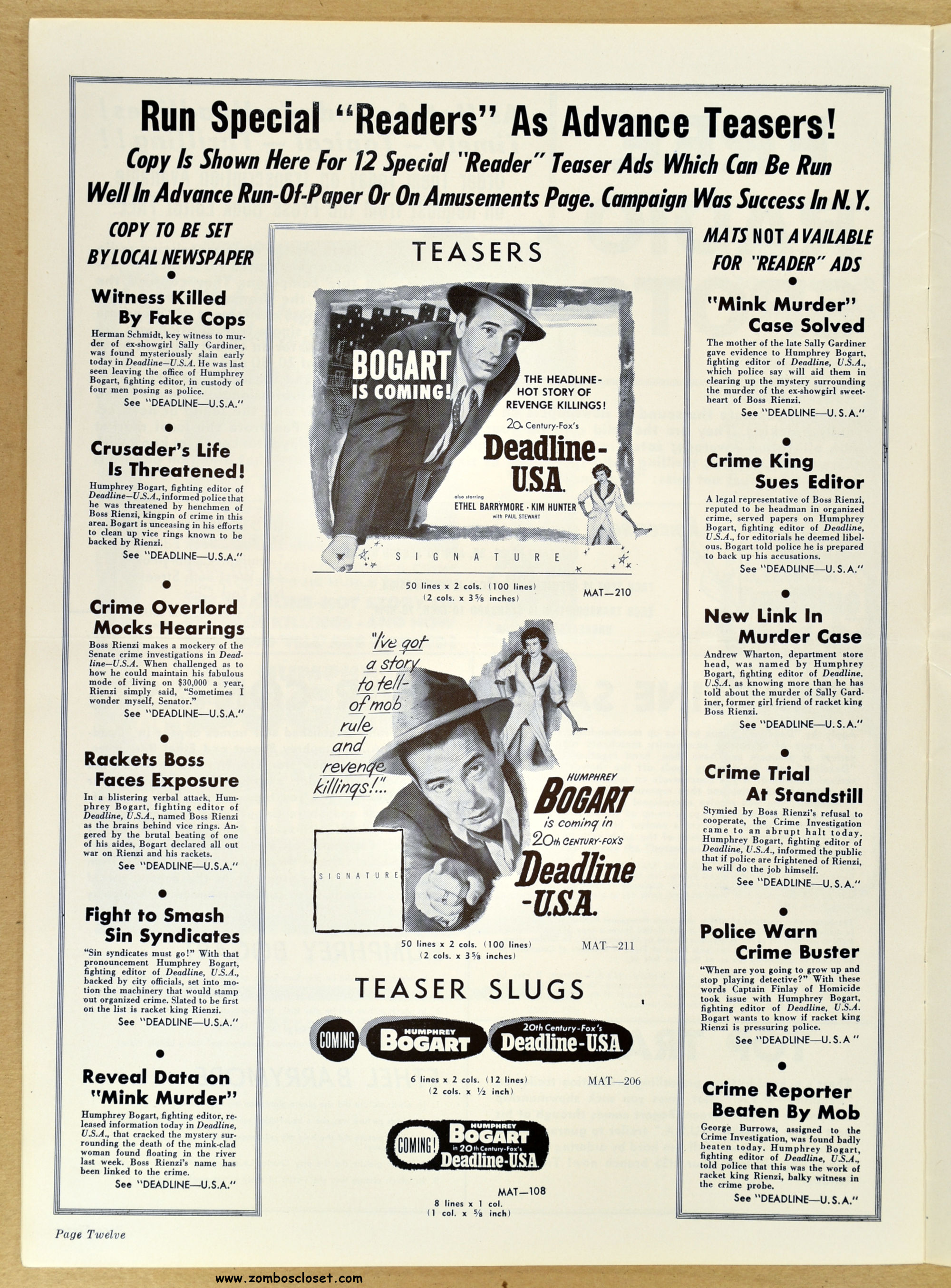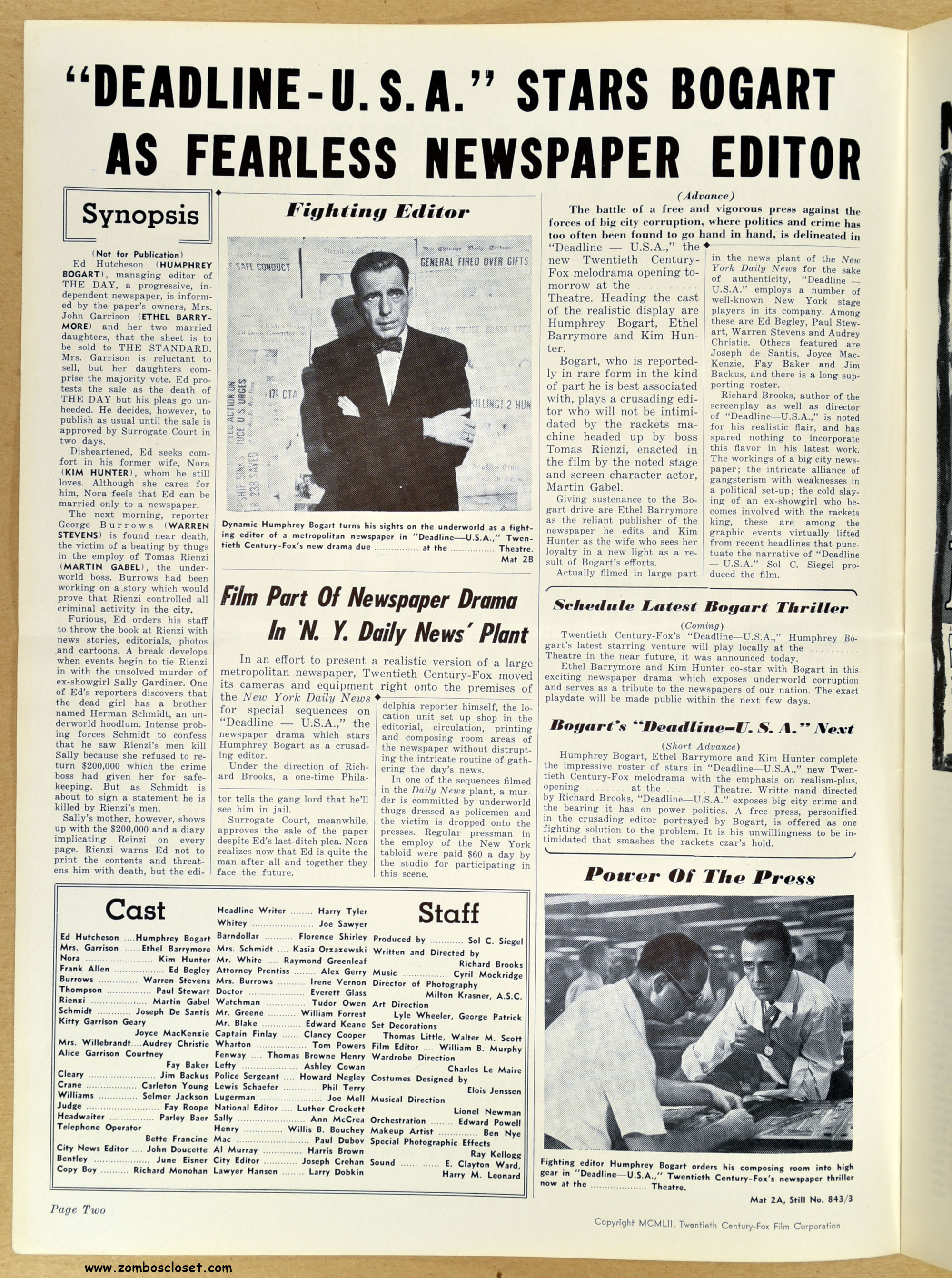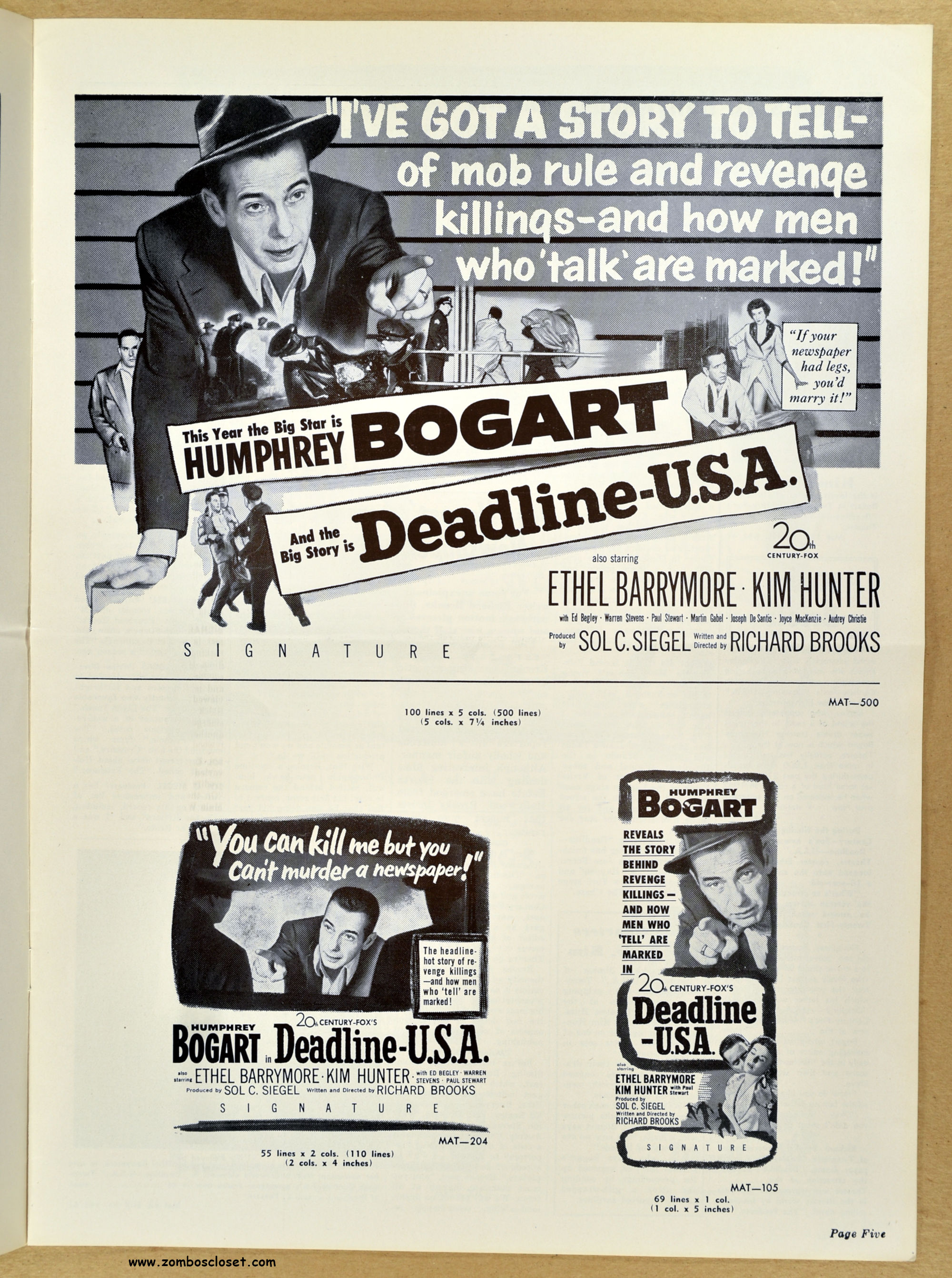 Humphrey Bogart tackles lies, criminal activity, and a struggling newspaper in Deadline-U.S.A. At least he didn't have to deal with the effects of the Internet and 24/7 newsy views dumping. Here's the hard-hitting 16-page pressbook.