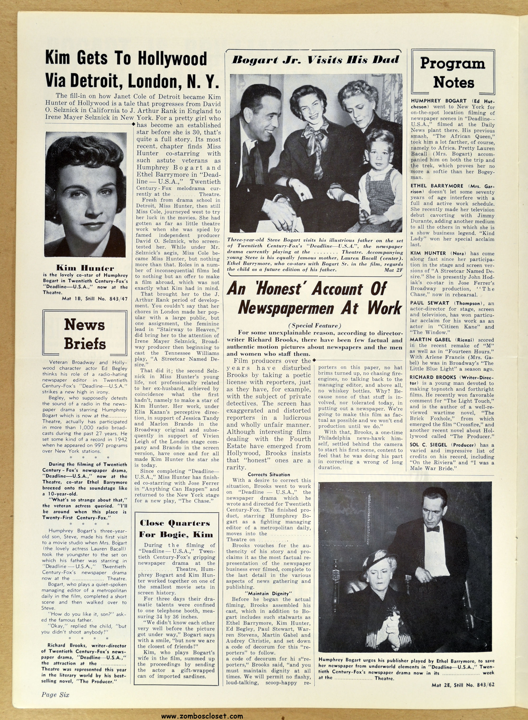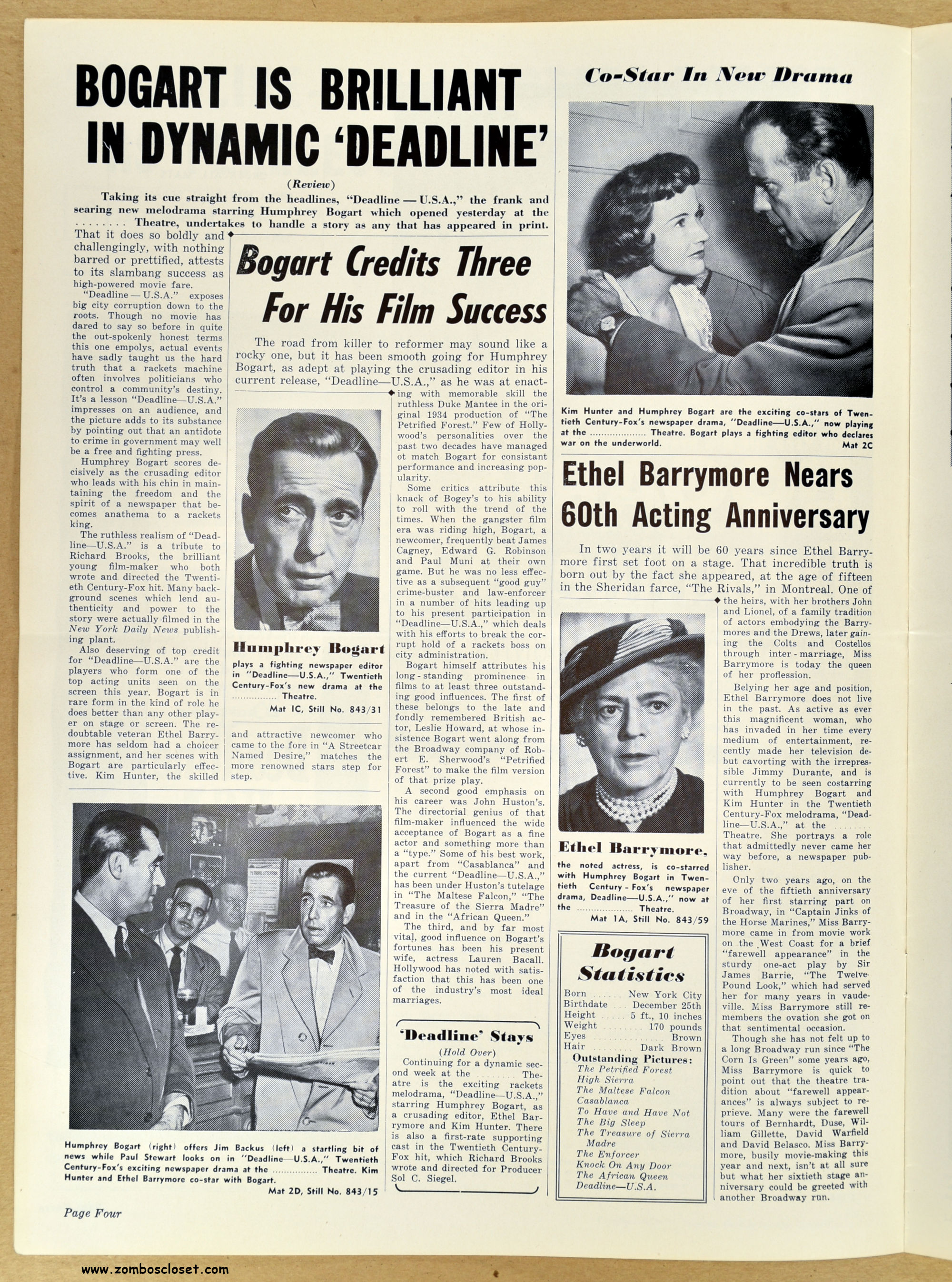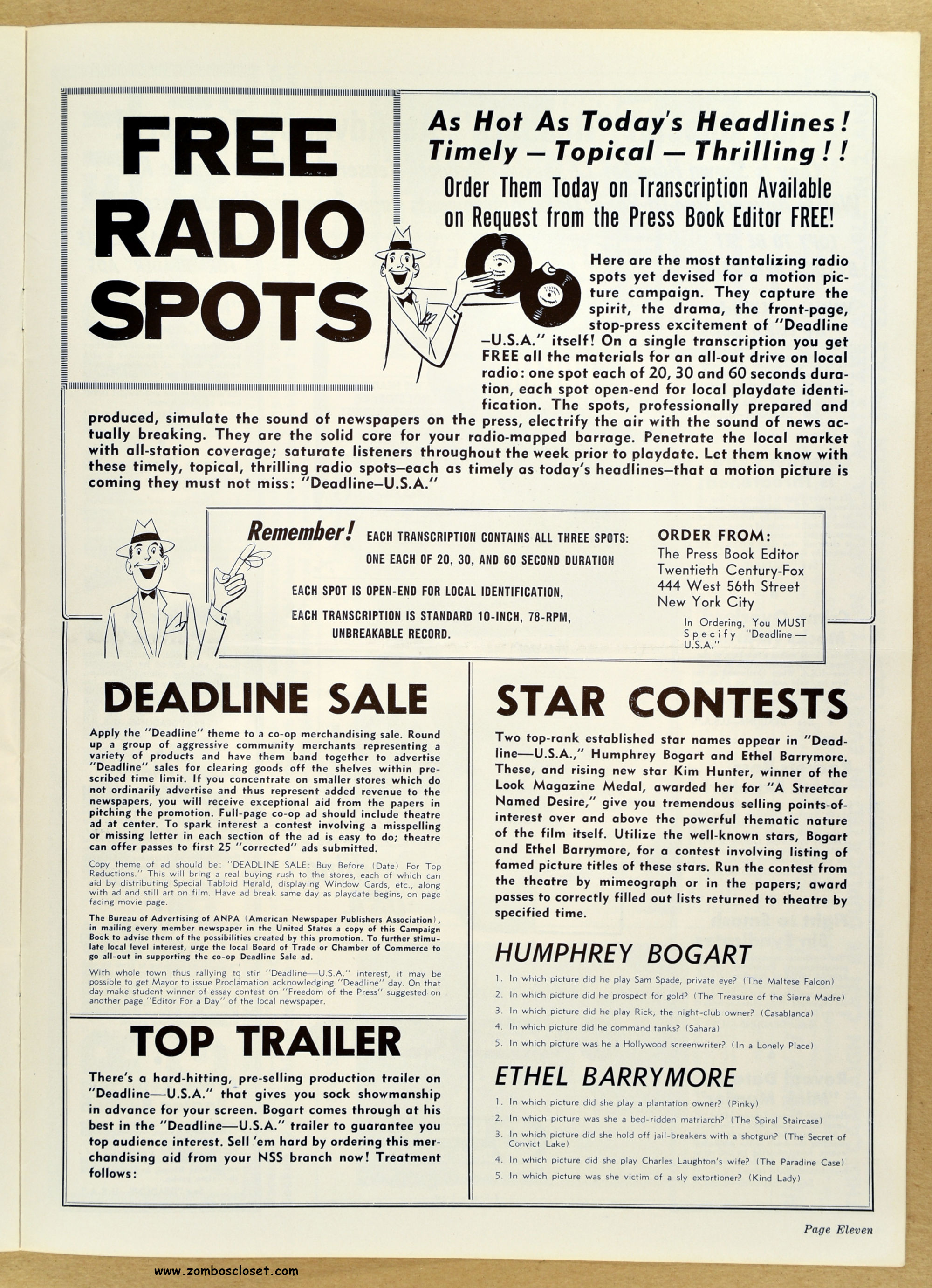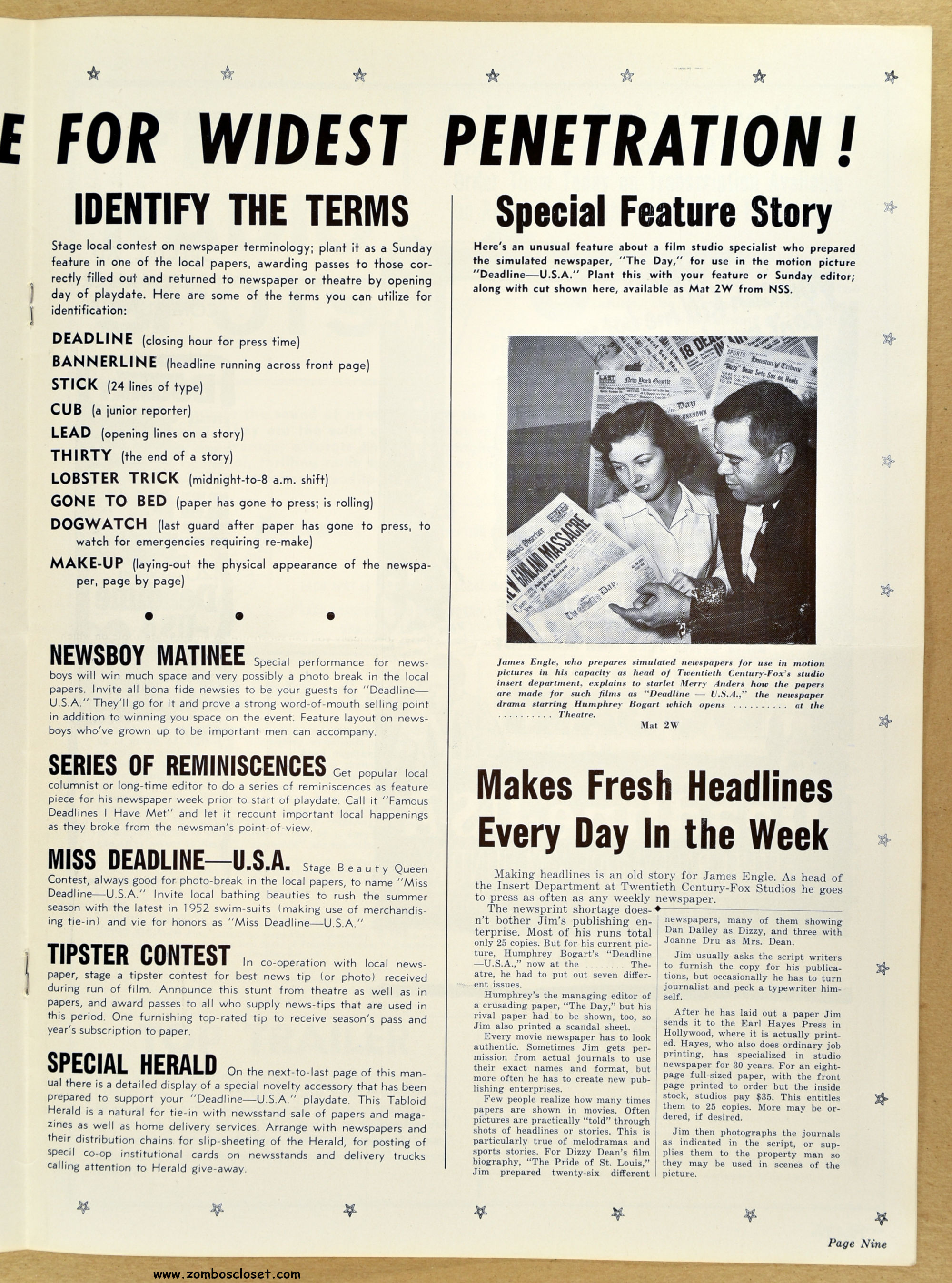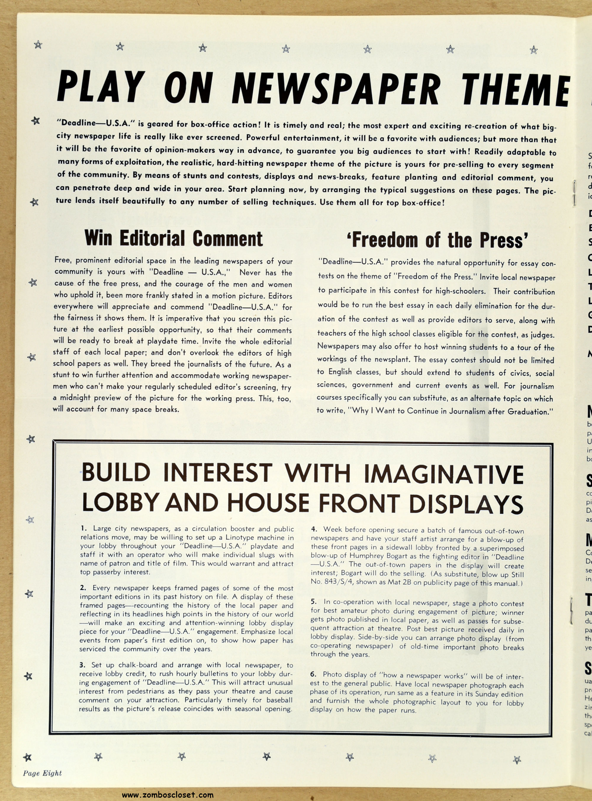 Humphrey Bogart tackles lies, criminal activity, and a struggling newspaper in Deadline-U.S.A. At least he didn't have to deal with the effects of the Internet and 24/7 newsy views dumping. Here's the hard-hitting 16-page pressbook.