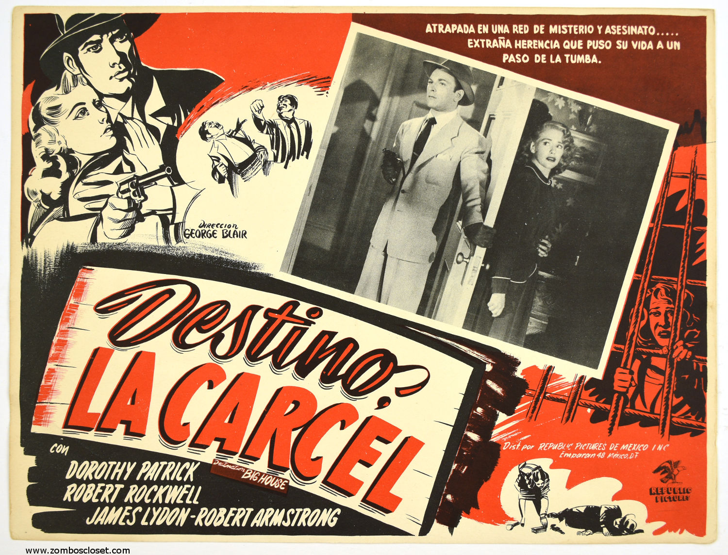 Here's a nice noirish Mexican lobby card for Republic Pictures' Destino La Carcel–Destination Big House. Note how well the spaces around the inset scene and the title are used. You immediately know this one's about a dame in distress and crime all around.