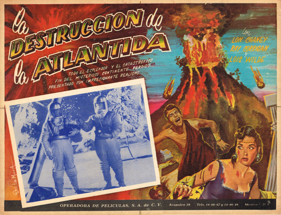 This Mexican lobby card appears to be for Republic Pictures' serial, Undersea Kingdom (1936), with Ray "Crash" Corrigan and Lon Chaney, Jr. But…spacemen…in outer space? And, yes, the story is about Atlantis, but the Mount Vesuvius-like volcano looks apropos of Pompeii, not the earth-quake centered plot of this serial.