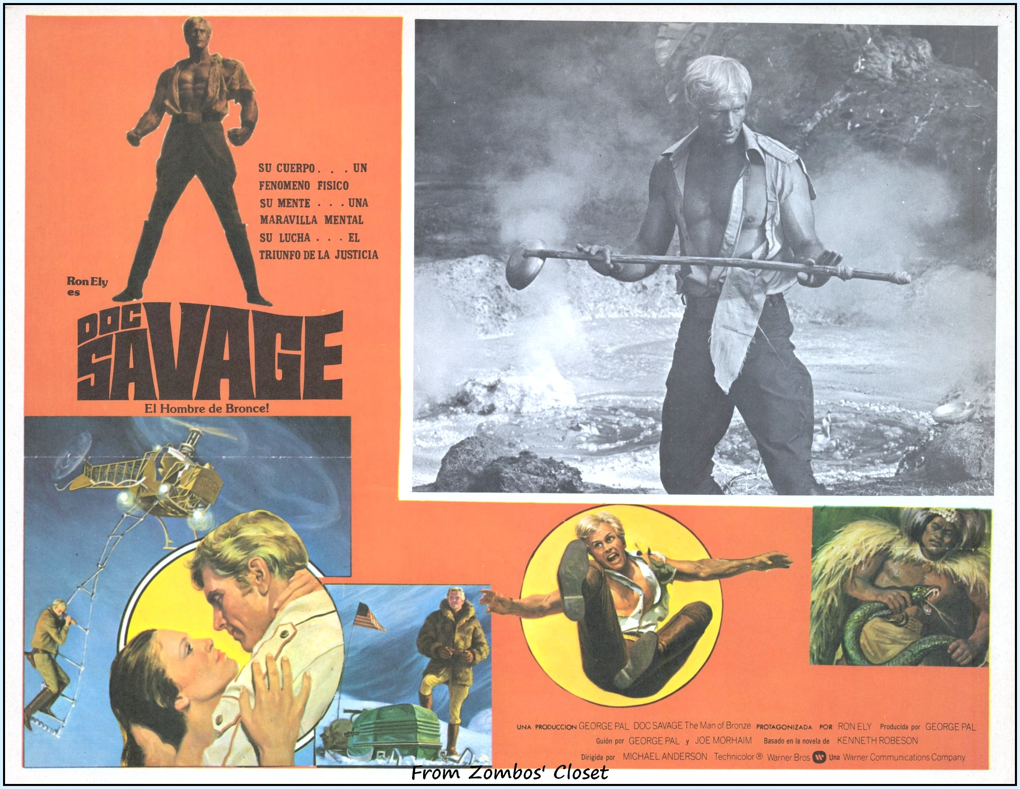 Here’s the Doc Savage (El Hombre de Bronce!) Mexican lobby card for the George Pal low budget and campy movie that didn’t properly envision the popular pulp hero who was the forerunner to the modern superhero. Ron Ely was a perfect choice, however, to play the man of bronze. Clark ‘Doc’ Savage Jr. was the first to have a Fortress of Solitude in the Arctic wastes, a place where he pursued his polymathic learning and meditations. Rich like Bruce Wayne, Doc lived on the 86th floor of a New York skyscraper and had five expert friends (a lawyer, an industrial chemist, an archeologist, an electrical wizard, and a construction engineer) to aide him on his adventures. His stories appeared in Street and Smith Publications, on radio, and in the comics during the 1930s and 1940s. Doc’s popularity faded for a while until Bantam re-issued their 1930s paperbacks beginning in 1969 with the awesome James Bama covers. The newfound interest for pulp heroes and serial movies pervaded the 1970s comic conventions and monster magazines too, leading to new fans discovering his exciting adventures.