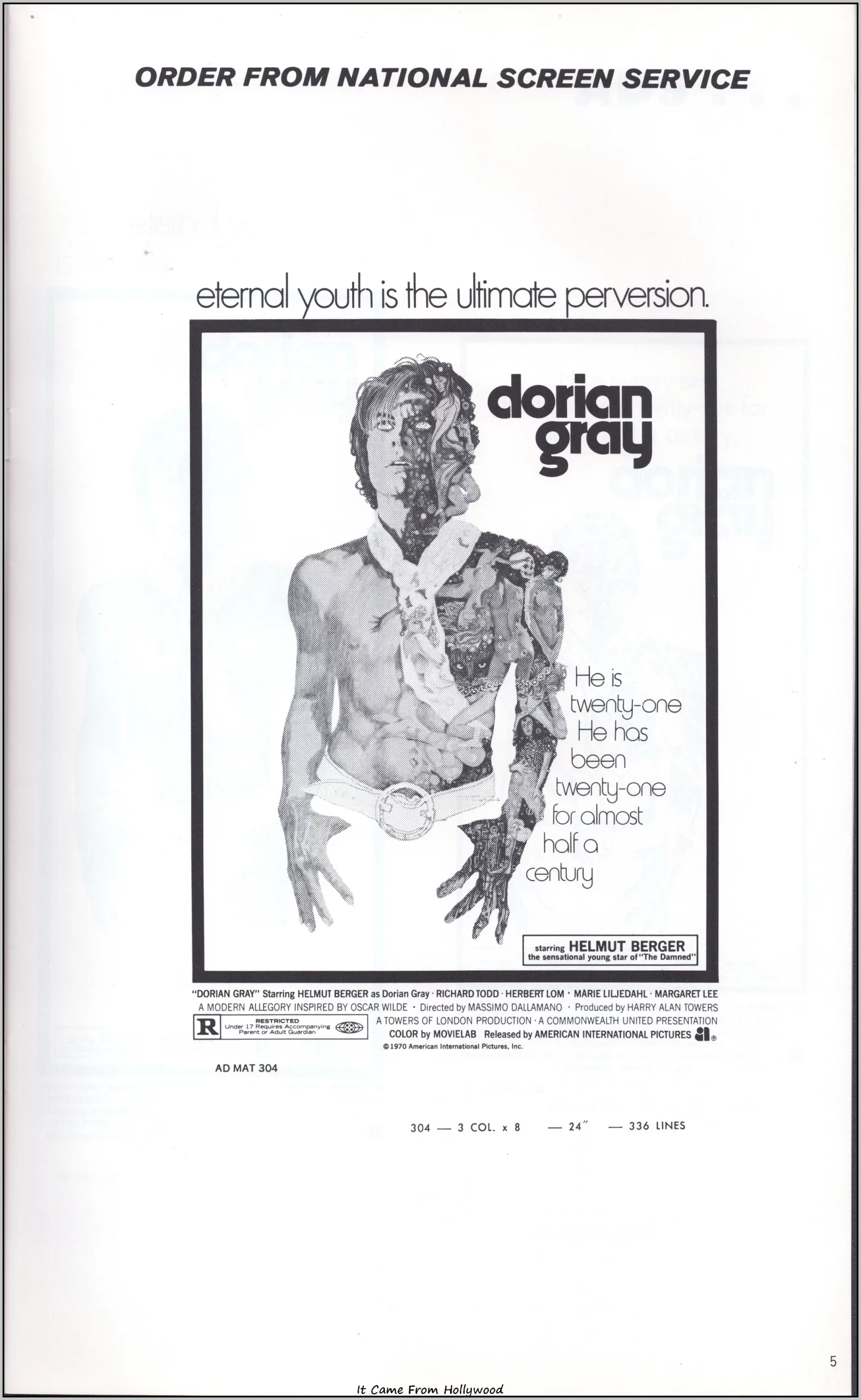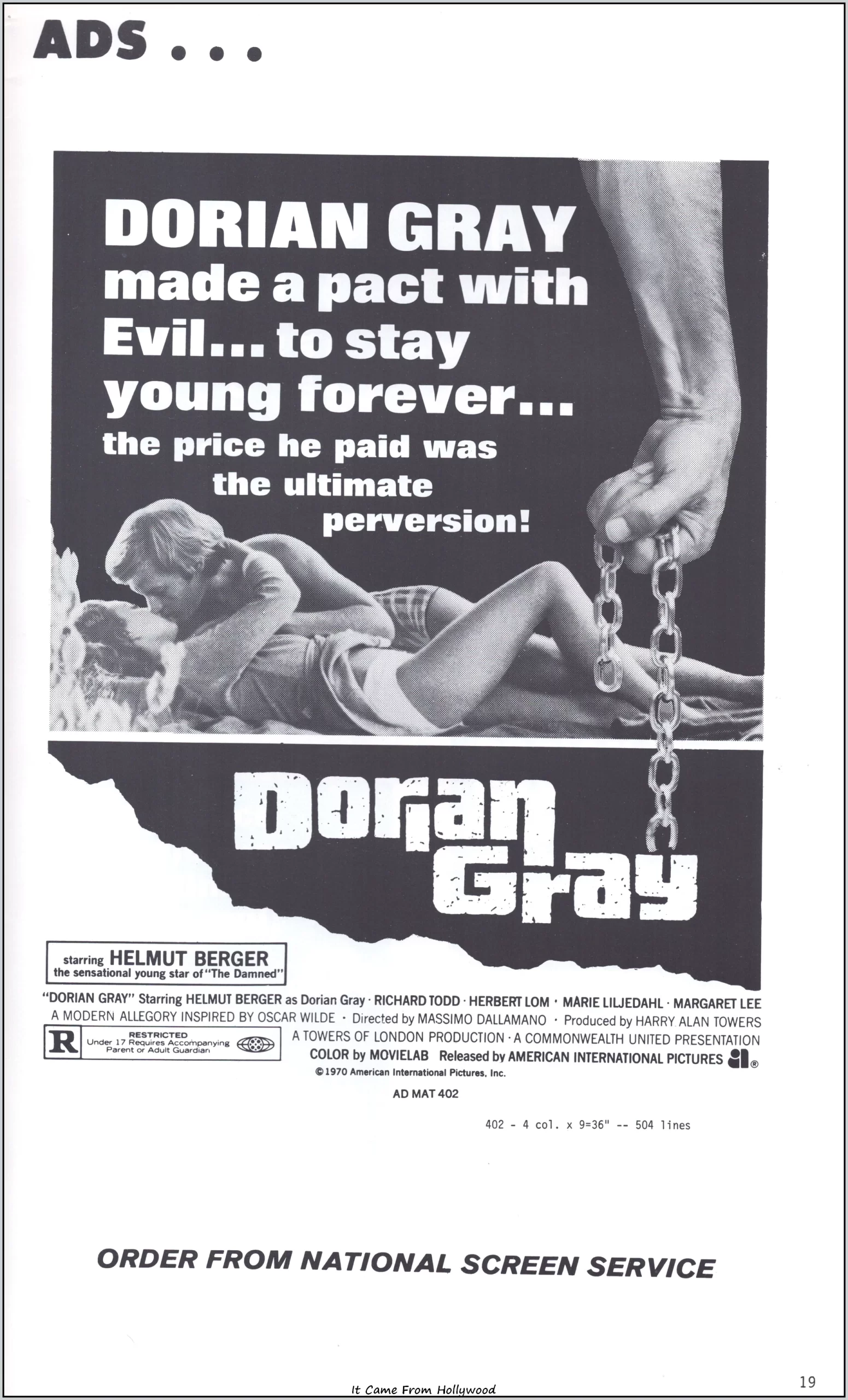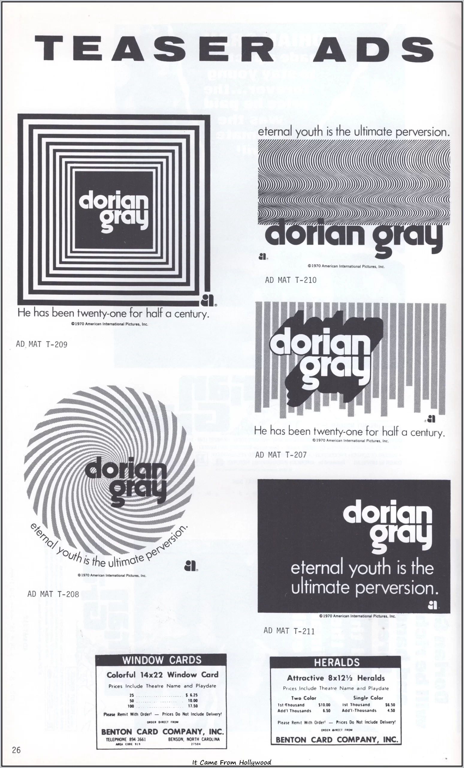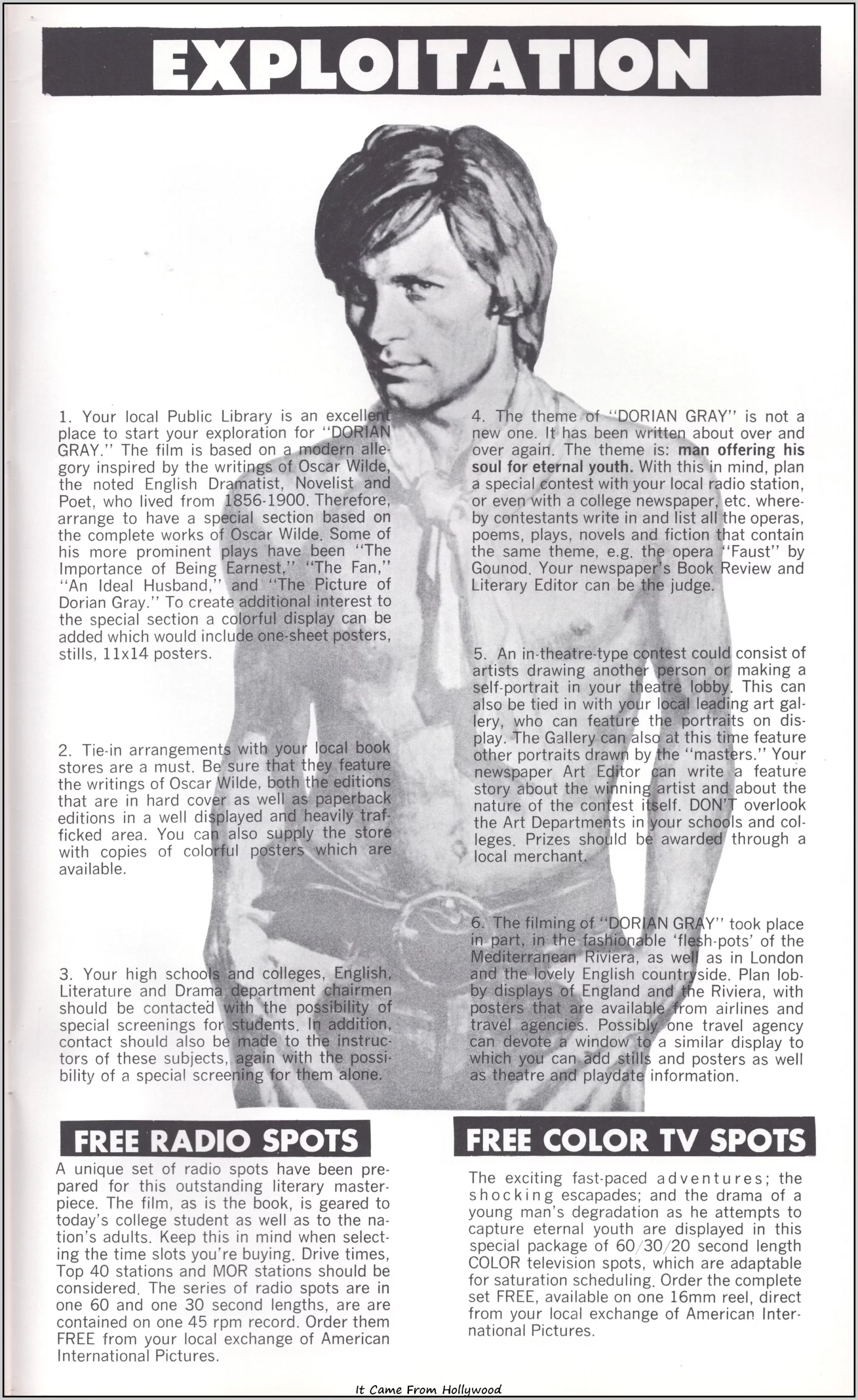 Oscar Wilde’s novel, The Picture of Dorian Gray, has been made into many movies. The earliest surviving version, according to IMDb, is one from 1915, where the sins of Dorian center mostly on cocaine use. This updated 1970 version by AIP amps up the sexual aspects of Wilde’s novel, with Dorian’s descent reflecting the more daring social and cinematic atmosphere of the 1970s as influenced by the sexual revolution that began in the 1960s.  AIP’s pressbooks tended to focus on ad mats for newspapers, posters and lobbies for theaters, then maybe a page or two devoted to exploitation and movie and actor details. They also printed on one side of the sheet, so contained blank pages. The teaser ads are especially psychedelic even without color. (courtesy of It Came From Hollywood)