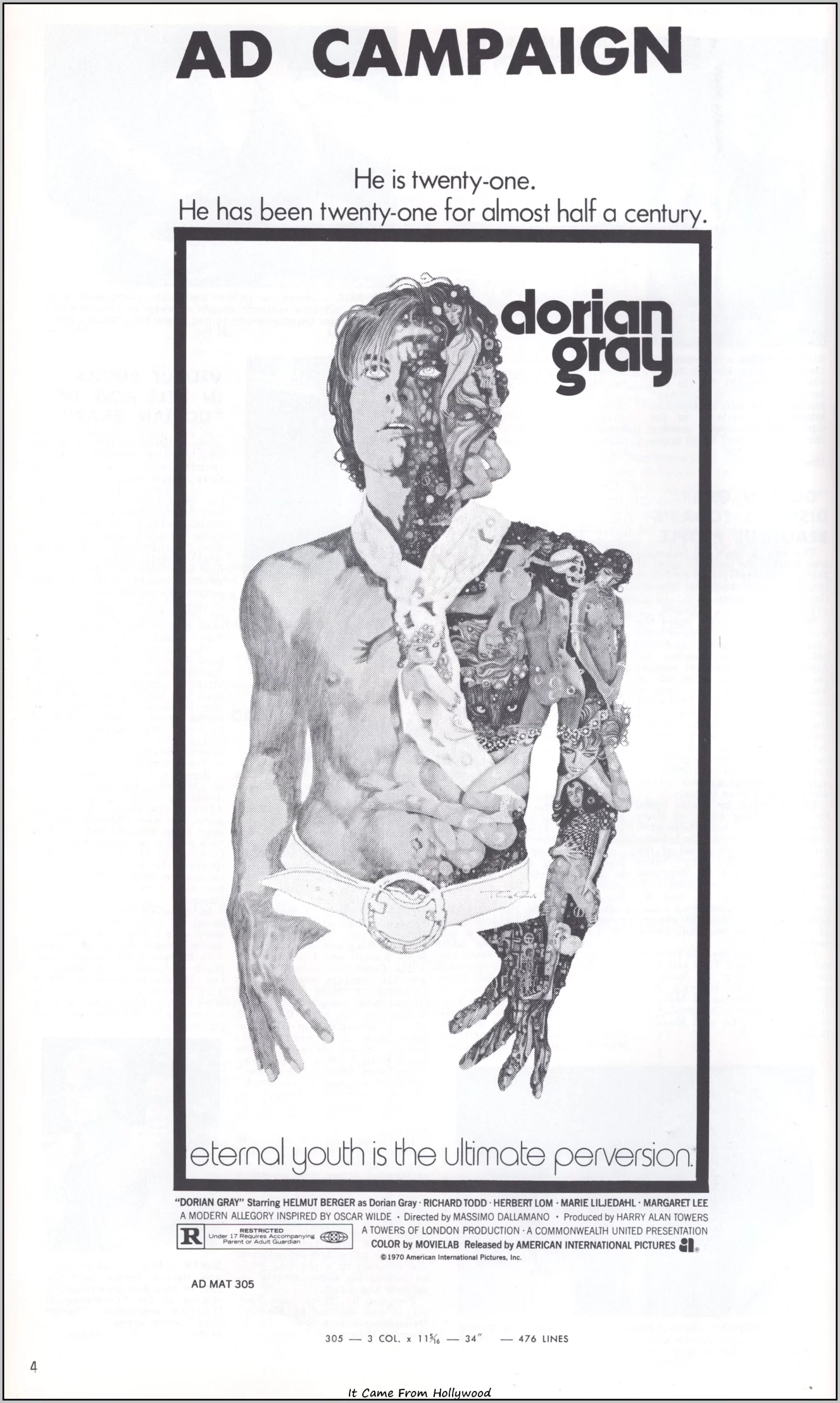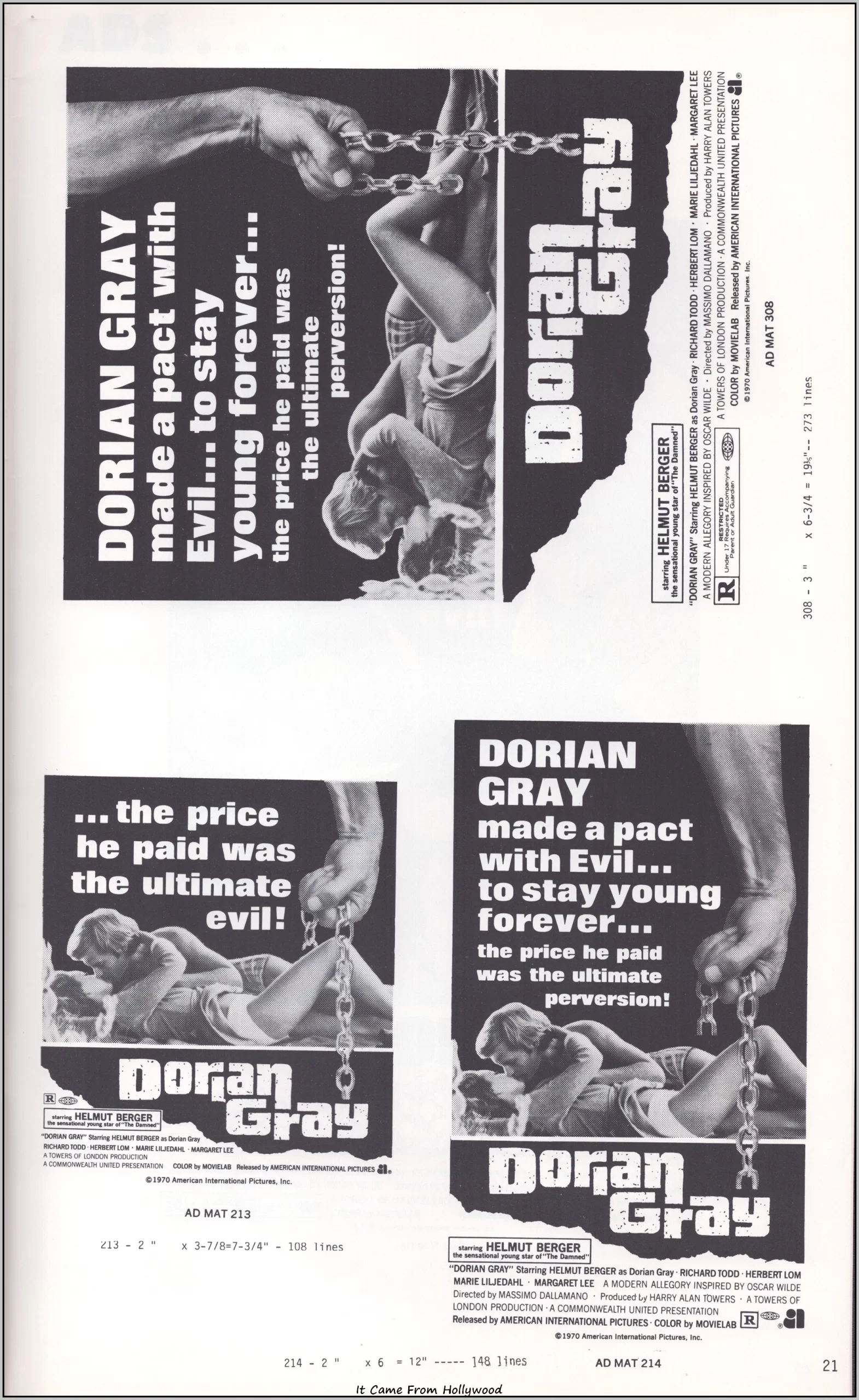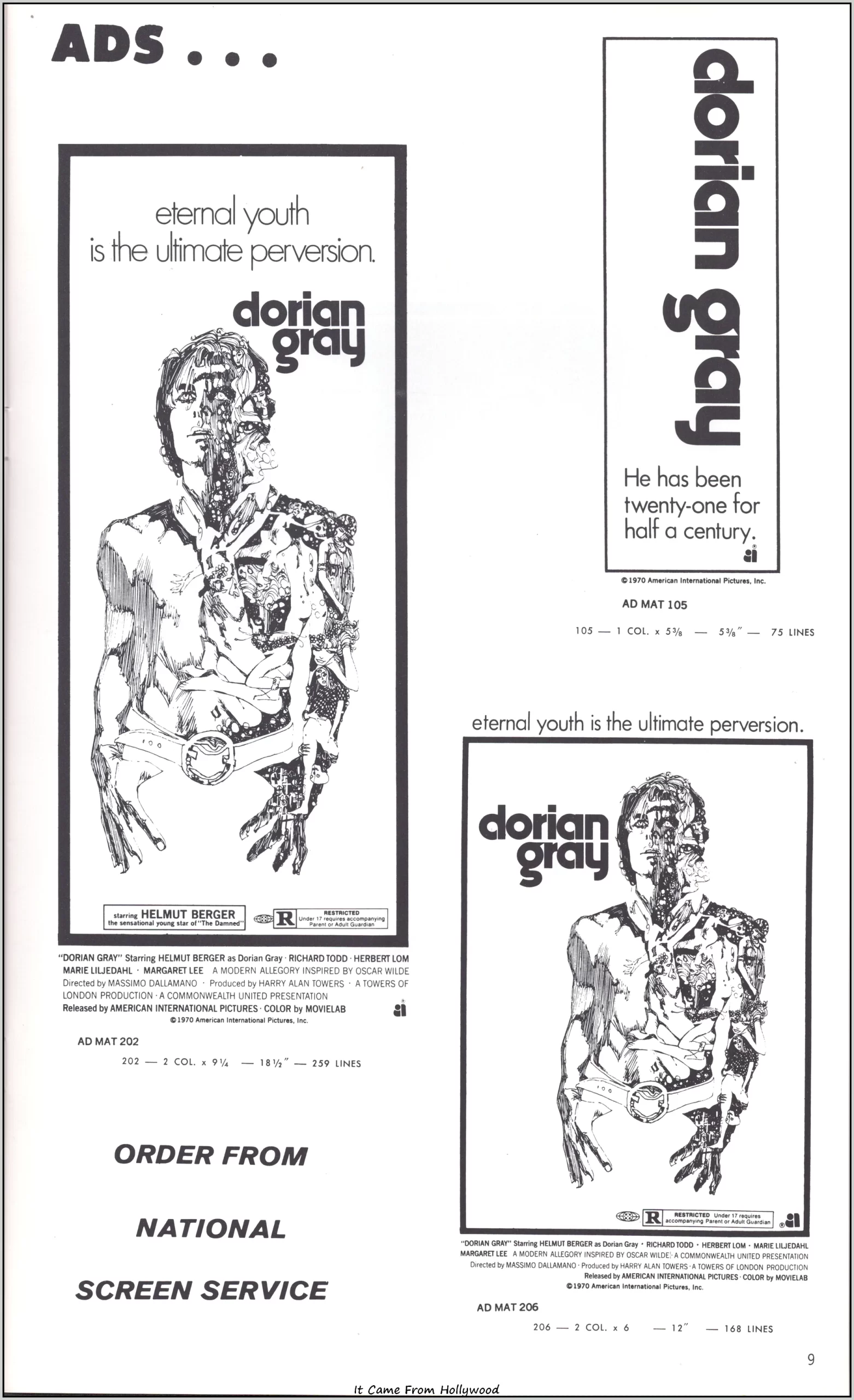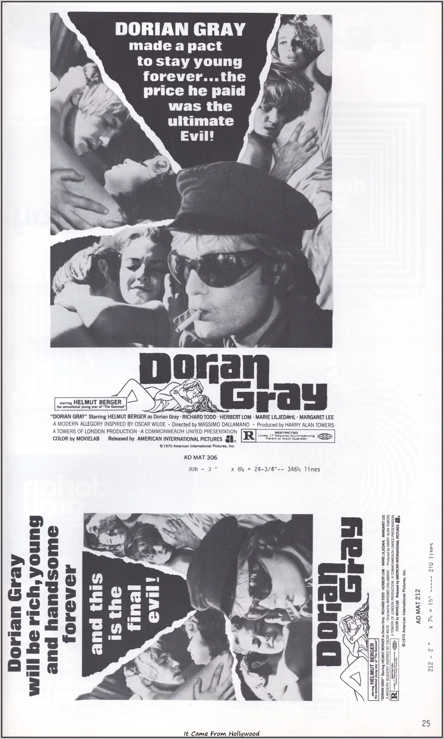 Oscar Wilde’s novel, The Picture of Dorian Gray, has been made into many movies. The earliest surviving version, according to IMDb, is one from 1915, where the sins of Dorian center mostly on cocaine use. This updated 1970 version by AIP amps up the sexual aspects of Wilde’s novel, with Dorian’s descent reflecting the more daring social and cinematic atmosphere of the 1970s as influenced by the sexual revolution that began in the 1960s.  AIP’s pressbooks tended to focus on ad mats for newspapers, posters and lobbies for theaters, then maybe a page or two devoted to exploitation and movie and actor details. They also printed on one side of the sheet, so contained blank pages. The teaser ads are especially psychedelic even without color. (courtesy of It Came From Hollywood)