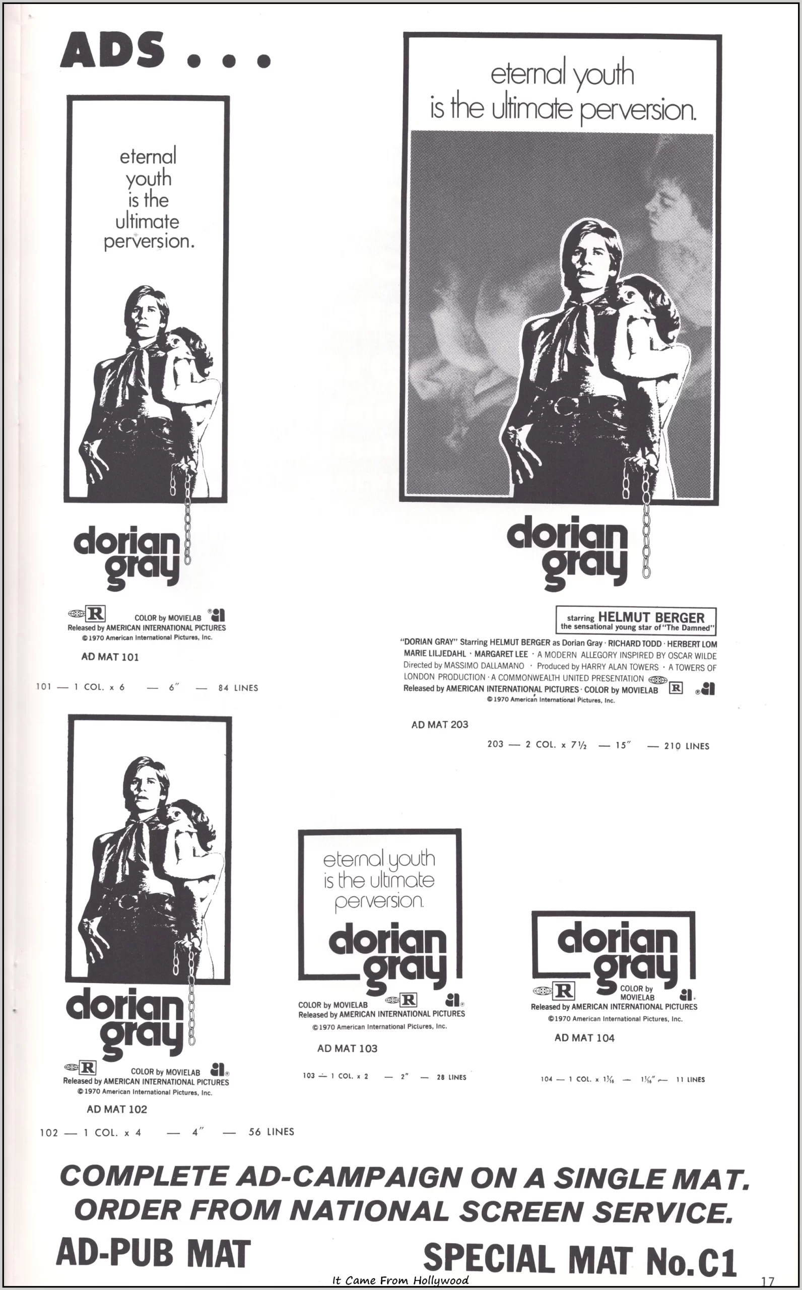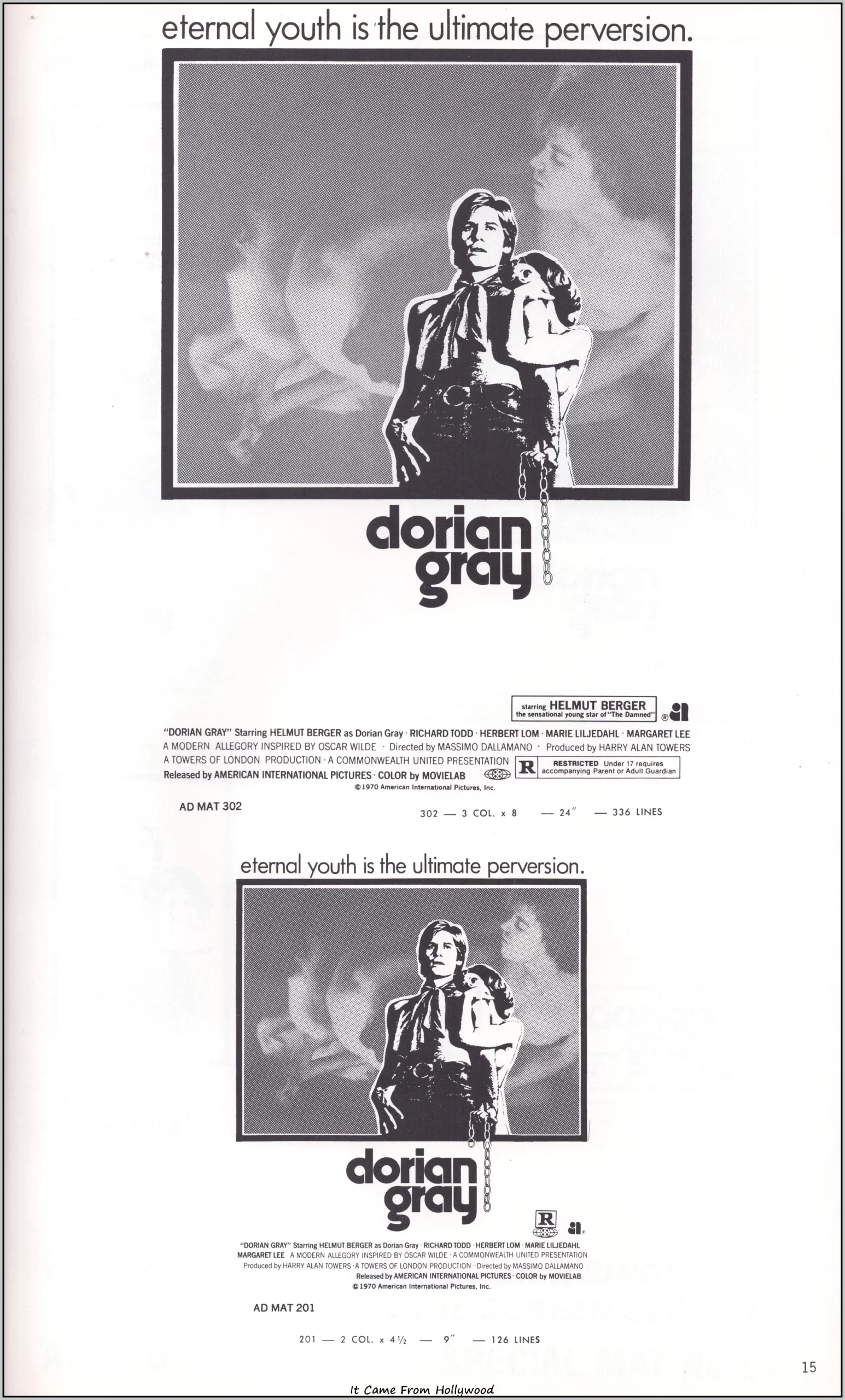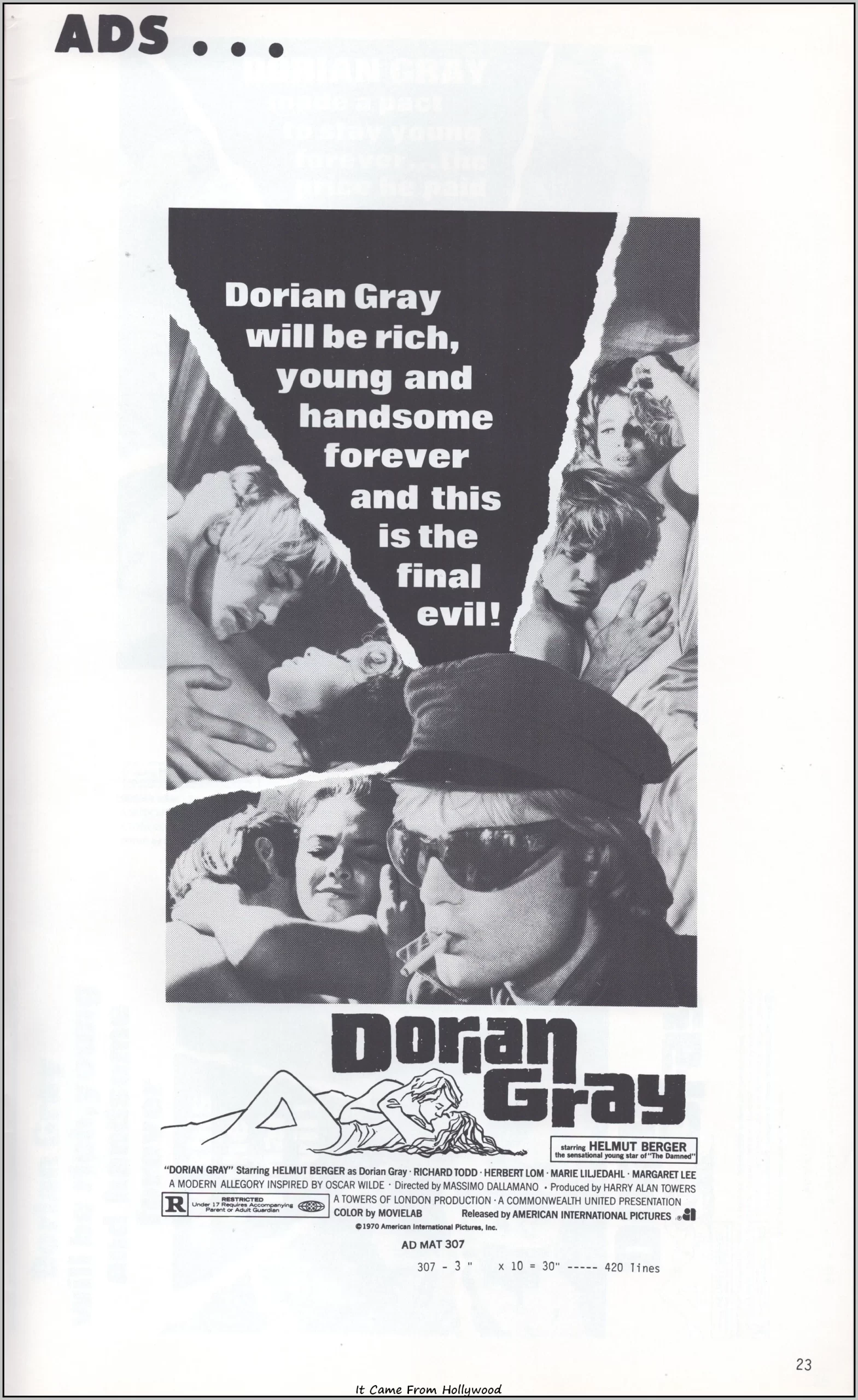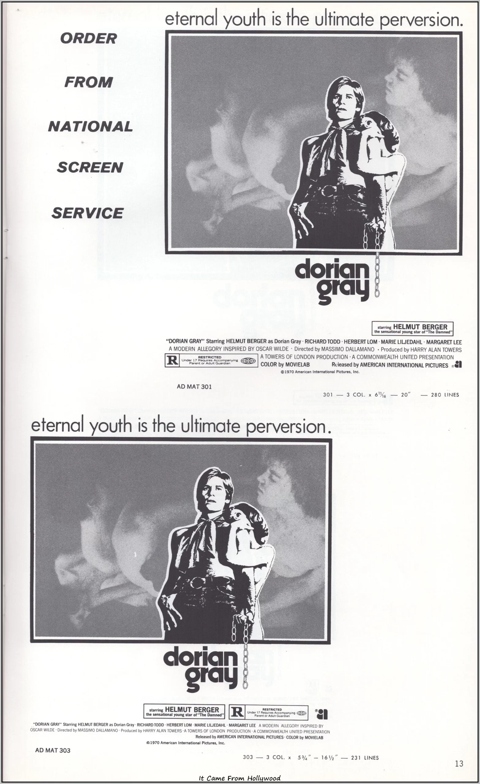 Oscar Wilde’s novel, The Picture of Dorian Gray, has been made into many movies. The earliest surviving version, according to IMDb, is one from 1915, where the sins of Dorian center mostly on cocaine use. This updated 1970 version by AIP amps up the sexual aspects of Wilde’s novel, with Dorian’s descent reflecting the more daring social and cinematic atmosphere of the 1970s as influenced by the sexual revolution that began in the 1960s.  AIP’s pressbooks tended to focus on ad mats for newspapers, posters and lobbies for theaters, then maybe a page or two devoted to exploitation and movie and actor details. They also printed on one side of the sheet, so contained blank pages. The teaser ads are especially psychedelic even without color. (courtesy of It Came From Hollywood)