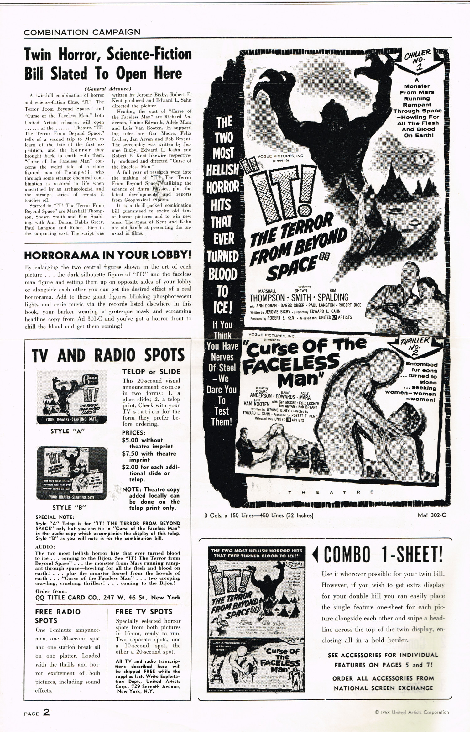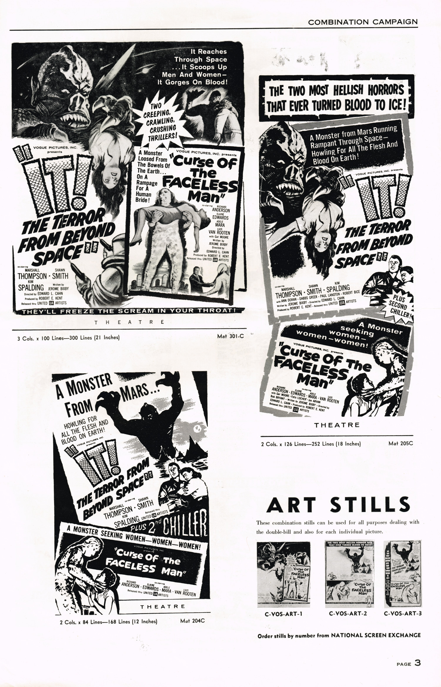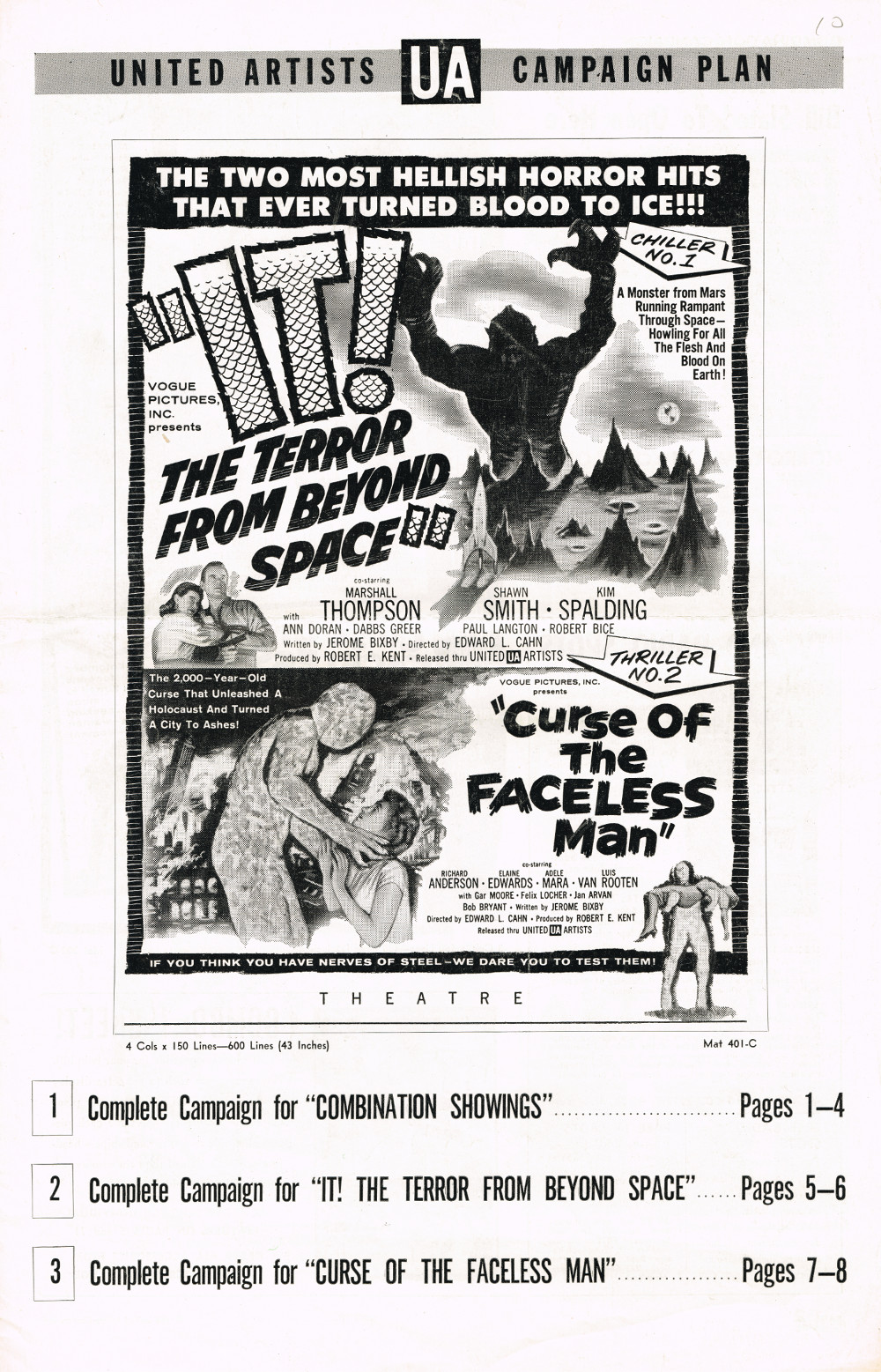 Double Bill Pressbook: IT! The Terror From Beyond Space and Curse of the Faceless Man Leave a Comment / Pressbooks (Horror, Sci Fi, Fantasy) / By JM Cozzoli Two of my favorite horror movies with all the 1950s matinee flair you could muster. I would love to see this on a midnight double bill with a Three Stooges short.Like this:Like Loading... Share this post Facebook Twitter Pinterest Linkedin