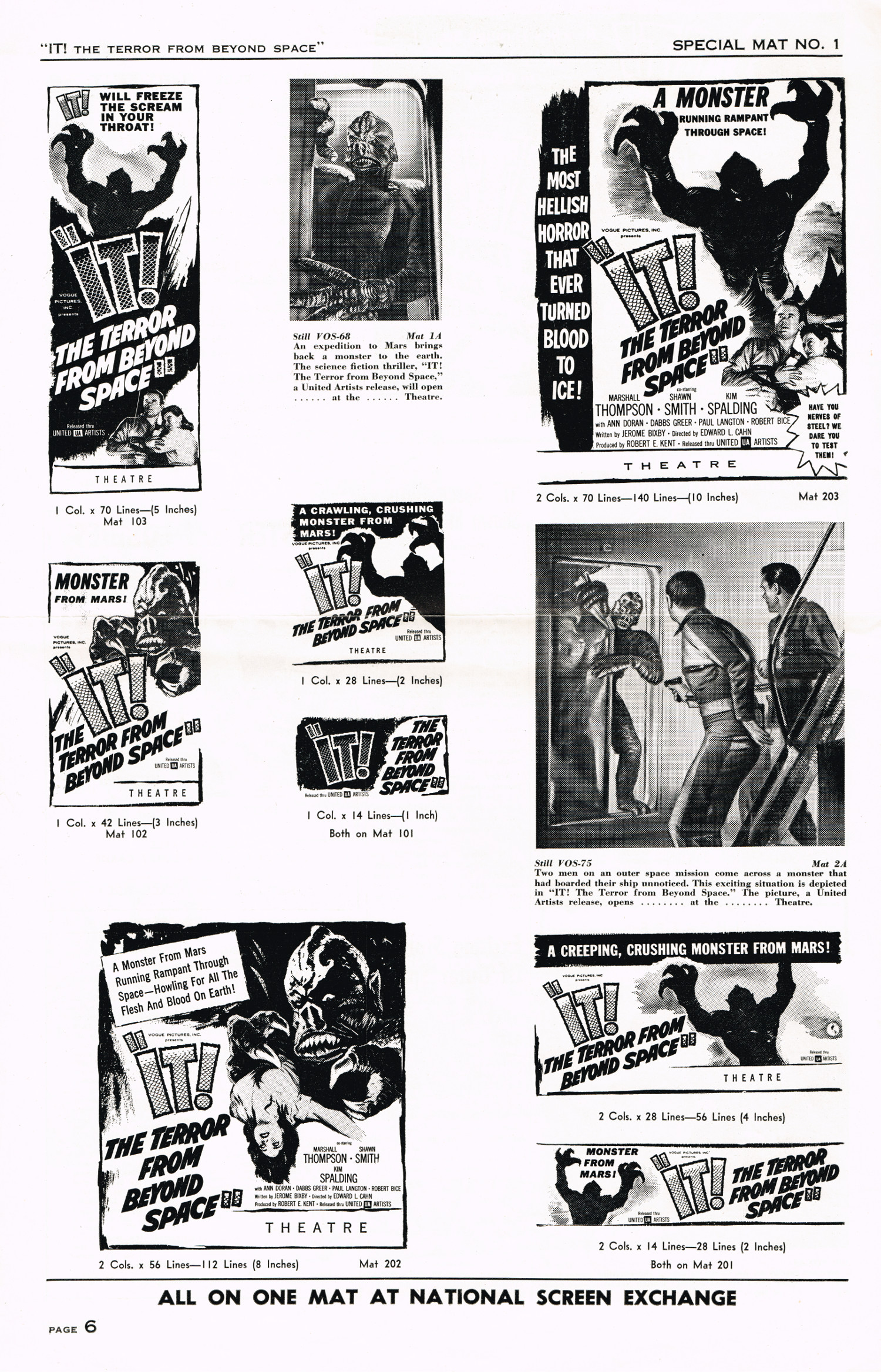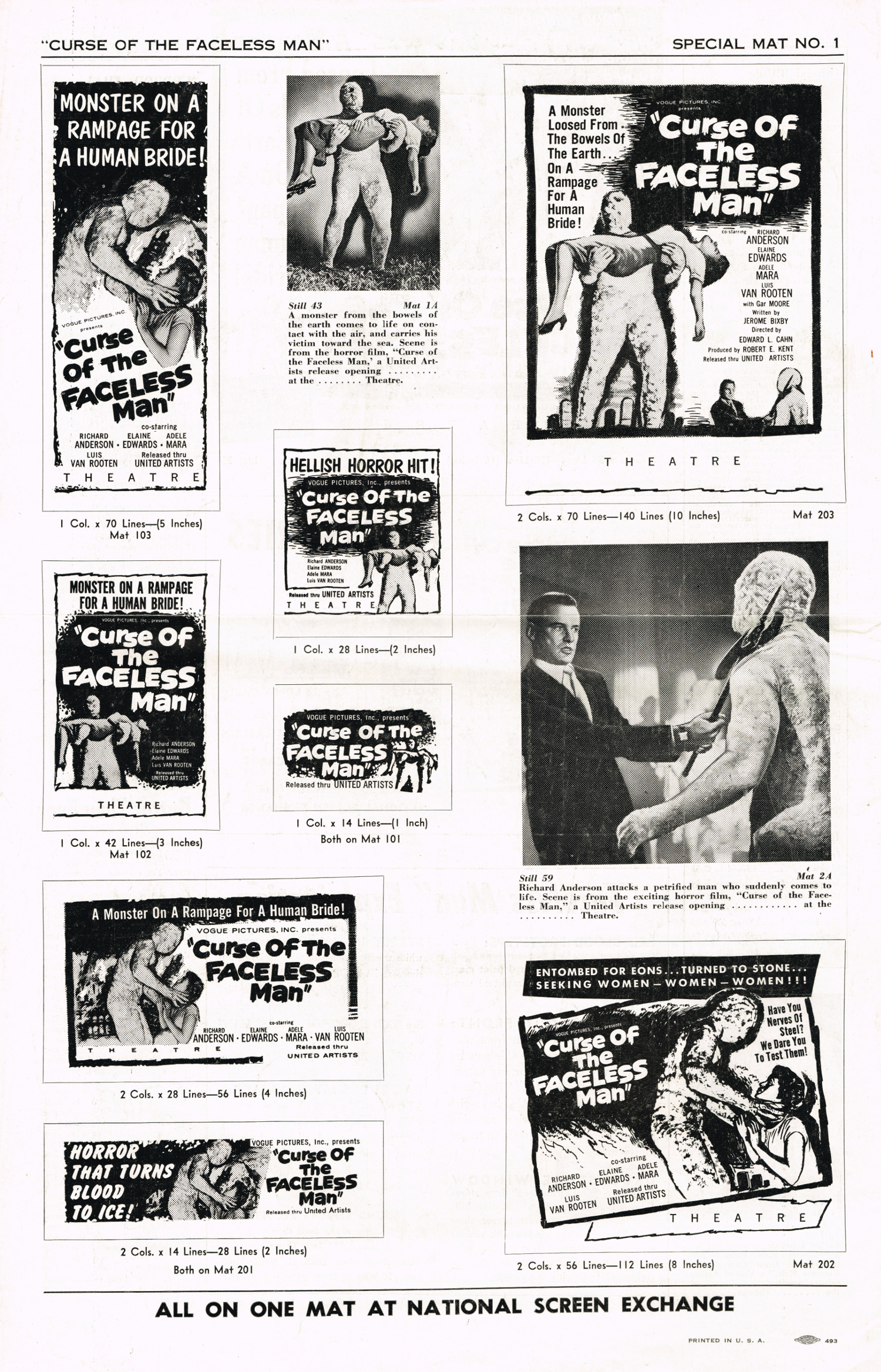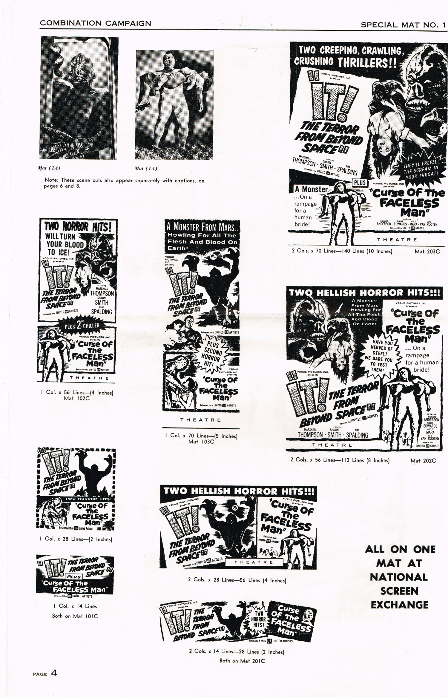 Double Bill Pressbook: IT! The Terror From Beyond Space and Curse of the Faceless Man Leave a Comment / Pressbooks (Horror, Sci Fi, Fantasy) / By JM Cozzoli Two of my favorite horror movies with all the 1950s matinee flair you could muster. I would love to see this on a midnight double bill with a Three Stooges short.Like this:Like Loading... Share this post Facebook Twitter Pinterest Linkedin