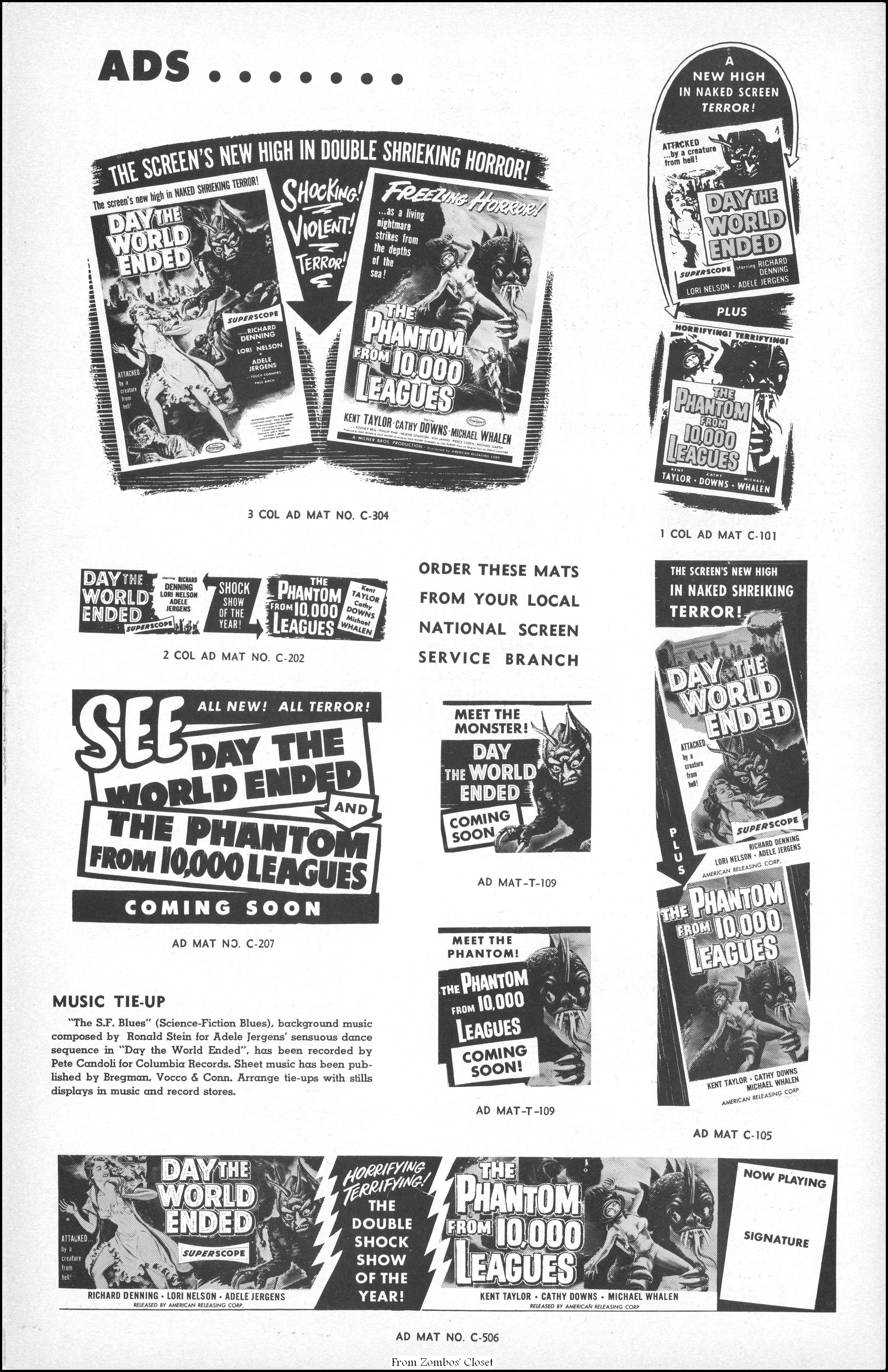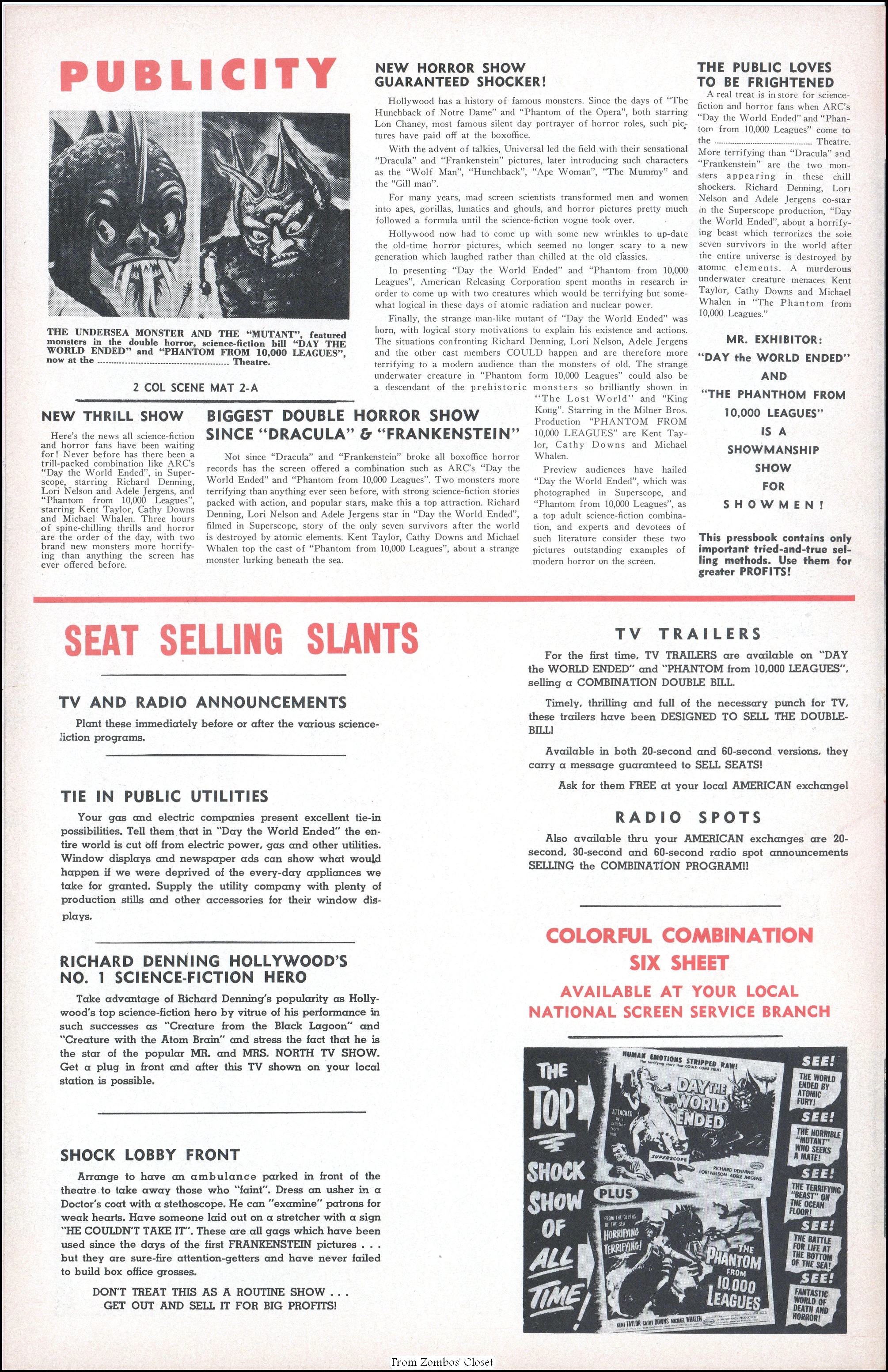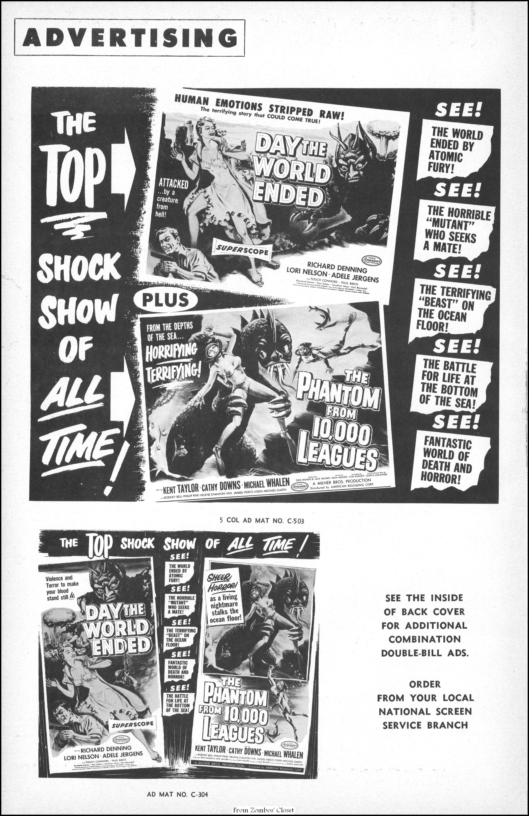 I posted the Anglo Amalgamated pressbook back in 2019. Here’s the American Releasing Corporation’s campaign manual for Day the World Ended and The Phantom from 10,000 Leagues. Day the World Ended cost around $96,000 to produce, but raked in a nifty $400,000 at the box office. The highlight of the movie is the mutated monster (lovingly known as Marty) created by Paul Blaisdell. Due to the foam rubber construction, getting it wet caused near drowning for Paul, who liked to play what he created in spite of the challenges. While the movie is a cheapie done in 10 days, it is now a classic B terror because of its cold war fear, good and simple story, the necessarily tight scene framing on a budget (using the Bronson Caverns and the Sportsman’s Lodge restaurant’s pond at Ventura Boulevard in San Fernando Valley), and monster Marty, looking somewhat goofy if you’re an adult, but very terrifying if you’re not. Corman and his crew had to end shooting at the pond by the time the restaurant opened for dinner.