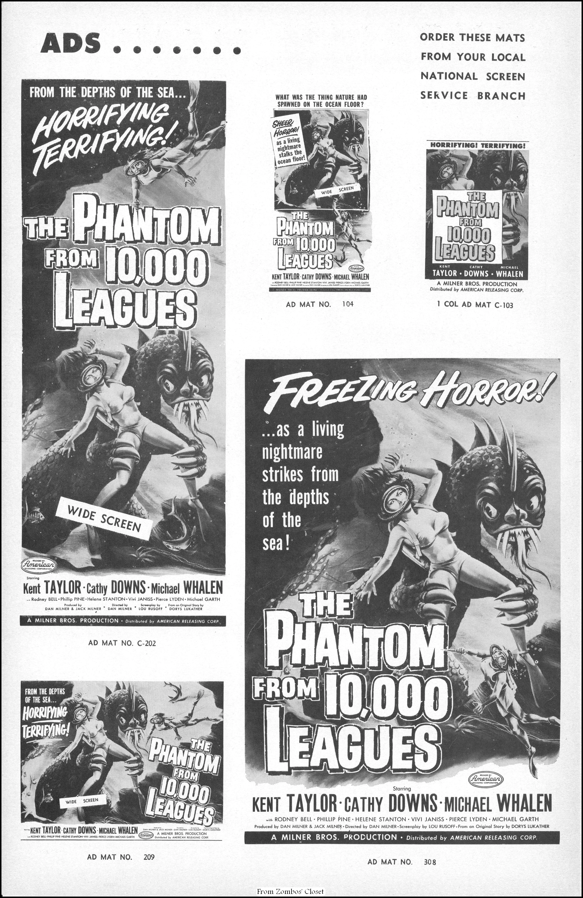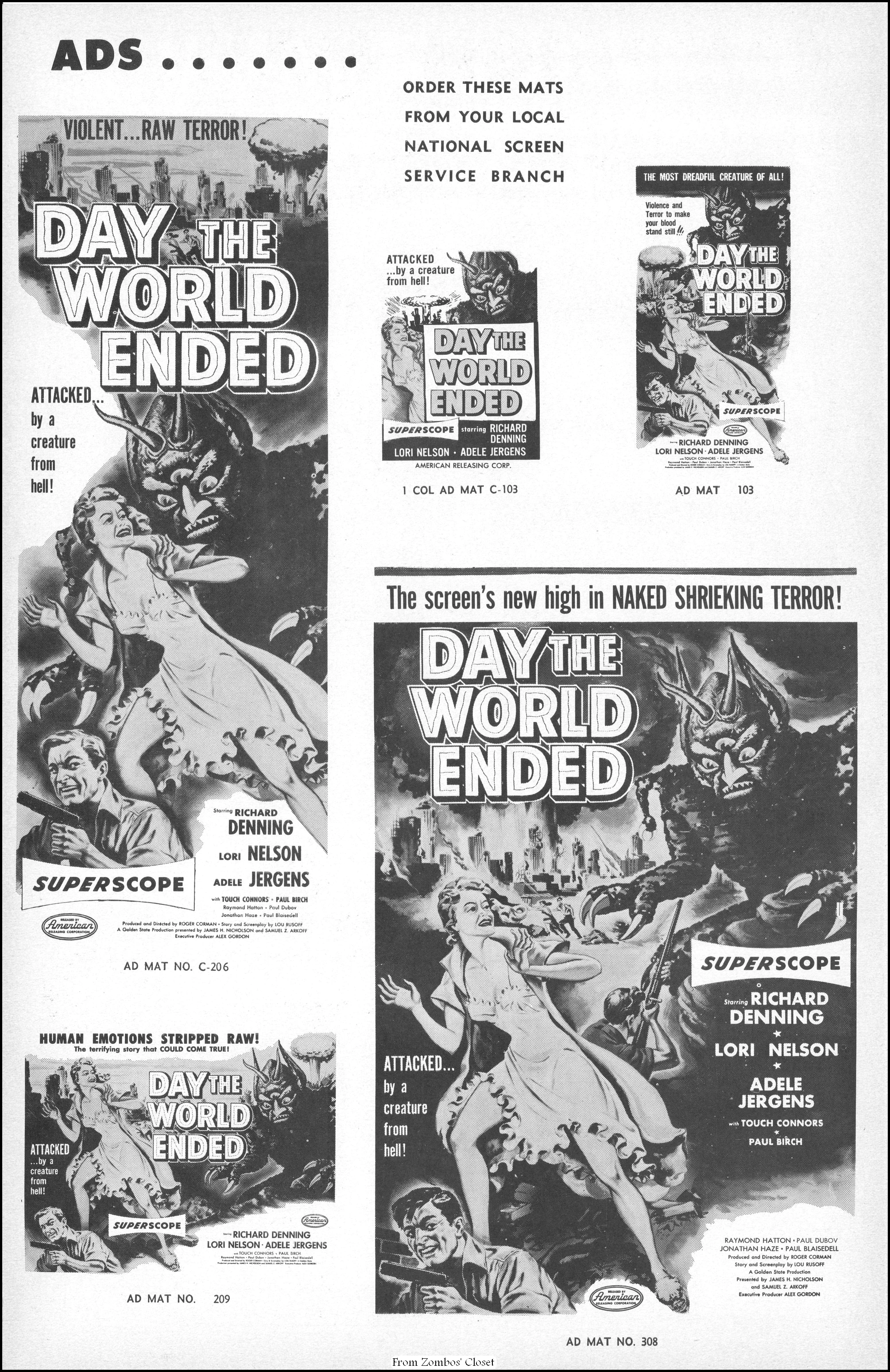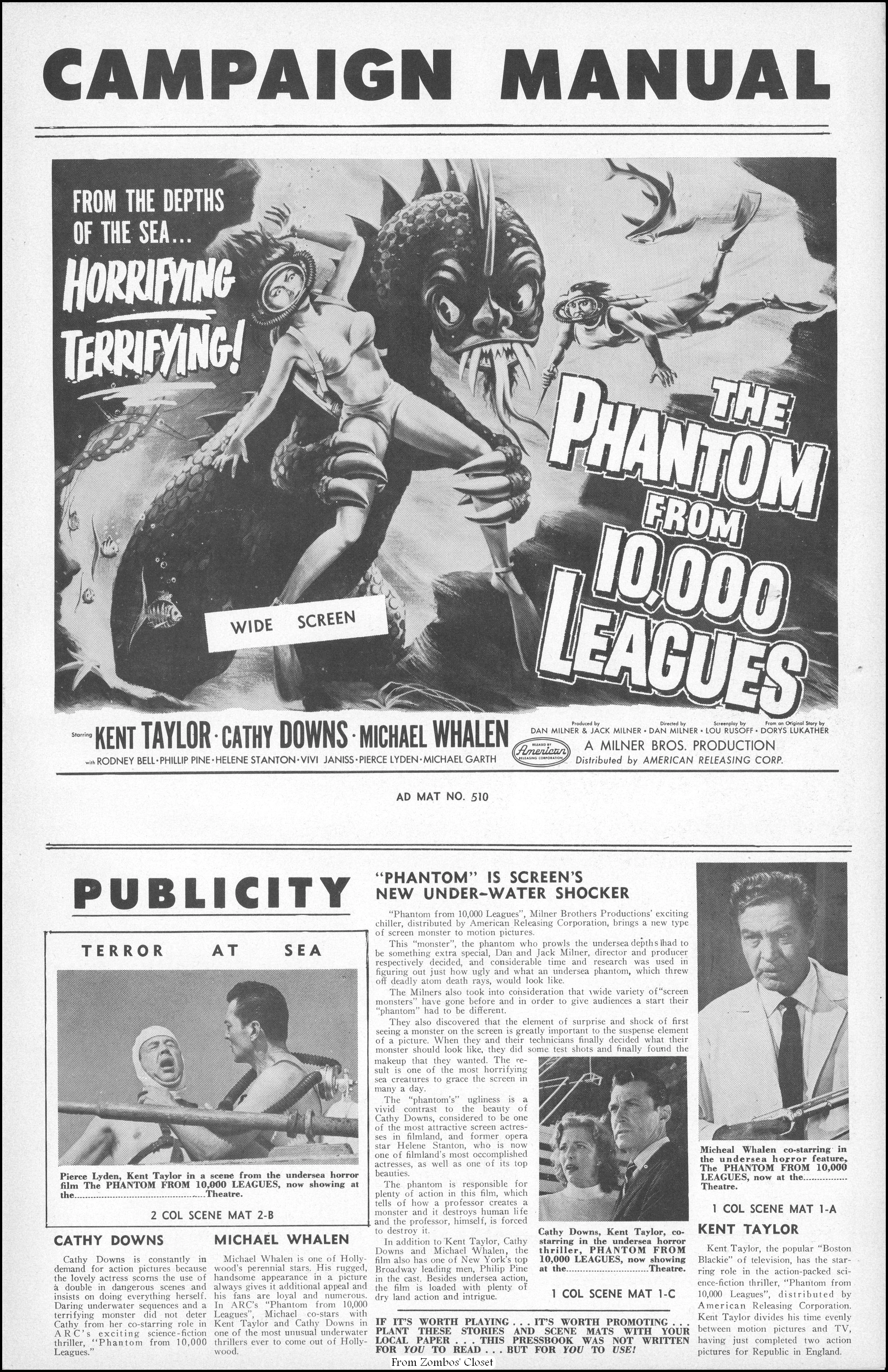 I posted the Anglo Amalgamated pressbook back in 2019. Here’s the American Releasing Corporation’s campaign manual for Day the World Ended and The Phantom from 10,000 Leagues. Day the World Ended cost around $96,000 to produce, but raked in a nifty $400,000 at the box office. The highlight of the movie is the mutated monster (lovingly known as Marty) created by Paul Blaisdell. Due to the foam rubber construction, getting it wet caused near drowning for Paul, who liked to play what he created in spite of the challenges. While the movie is a cheapie done in 10 days, it is now a classic B terror because of its cold war fear, good and simple story, the necessarily tight scene framing on a budget (using the Bronson Caverns and the Sportsman’s Lodge restaurant’s pond at Ventura Boulevard in San Fernando Valley), and monster Marty, looking somewhat goofy if you’re an adult, but very terrifying if you’re not. Corman and his crew had to end shooting at the pond by the time the restaurant opened for dinner.