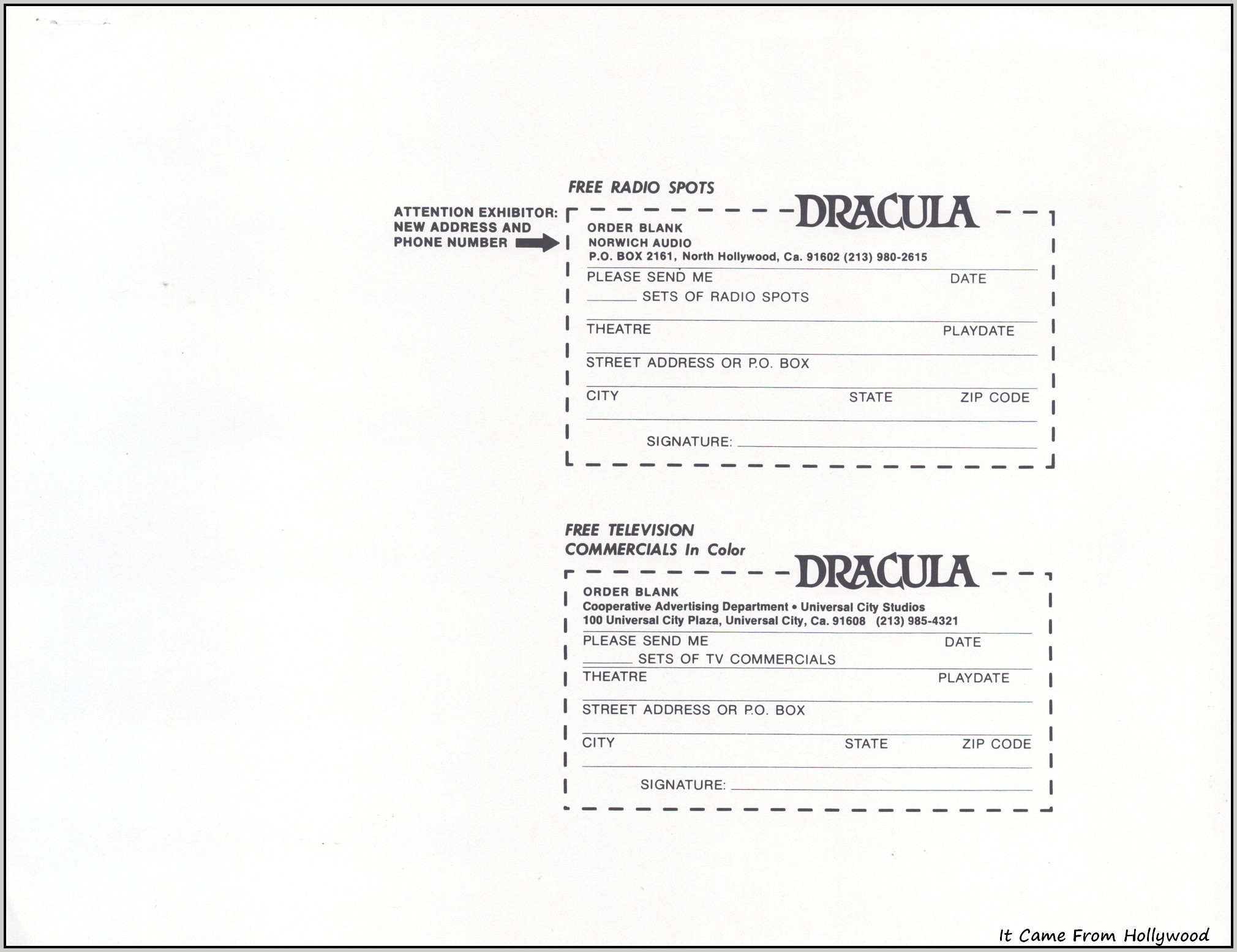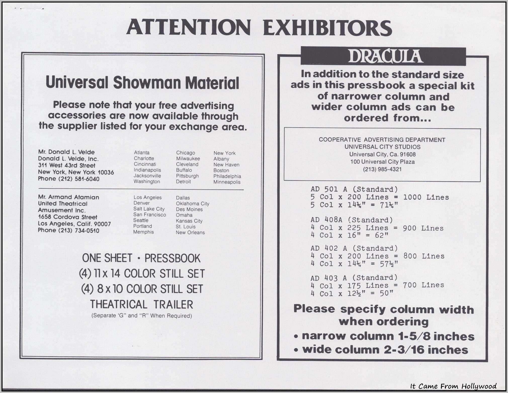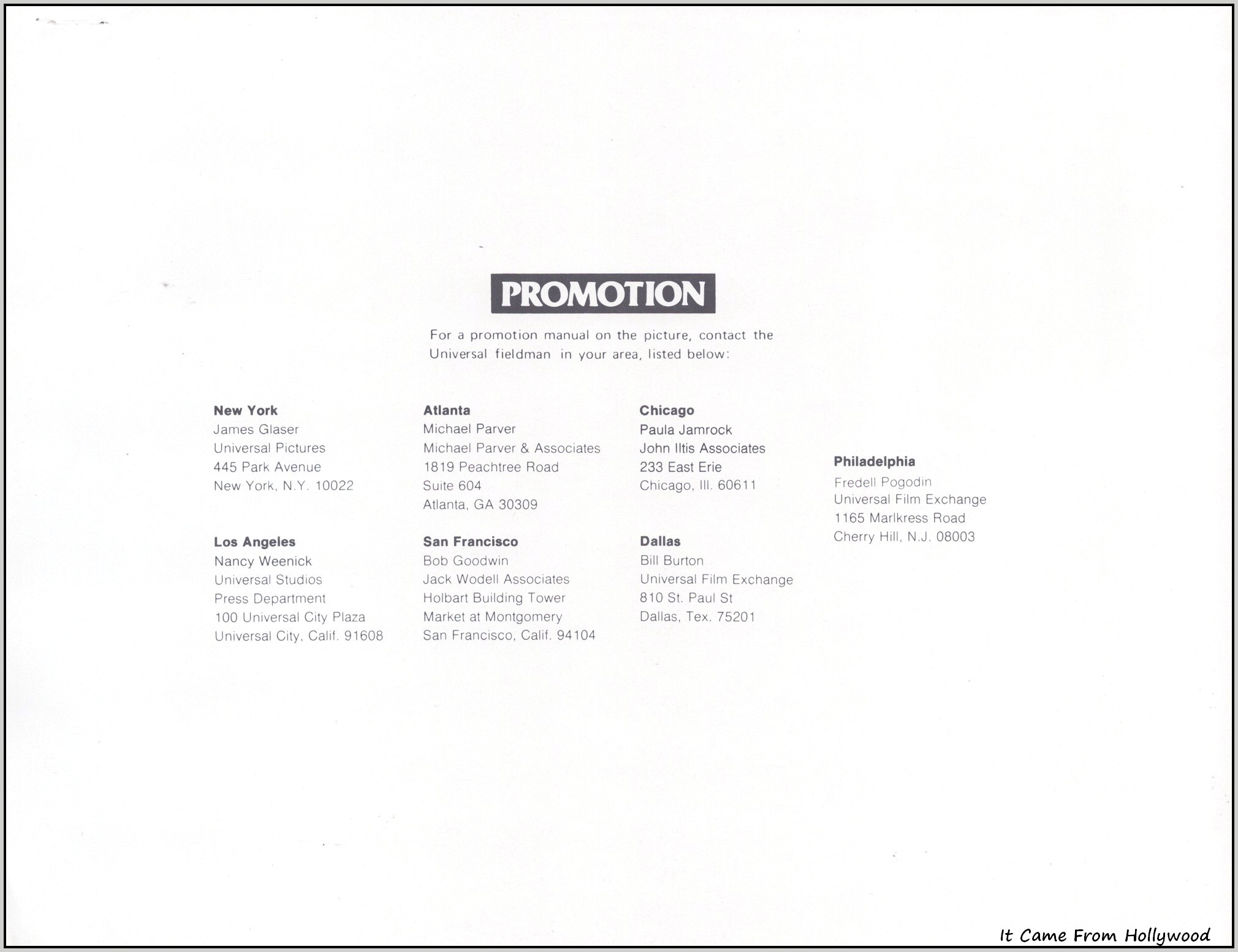 This pressbook, courtesy of It Came From Hollywood, is even less formal. By the late 70s, the art of the pressbook had lessened, providing a minimum of promotional information. One cool item here, though, are the cut-out forms to order radio and television spots for the movie. With a minimum of newspaper ads to order, and the Promotion page that directs to “the Universal fieldman in your local area” to request the Promotion Manual, one can see the shift away from the ballyhoo and exploitation that was previously more theater-focused as given in the pressbook. Now radio, and television especially, were the stronger mediums through which movie promotion could be conducted on a larger scale.
