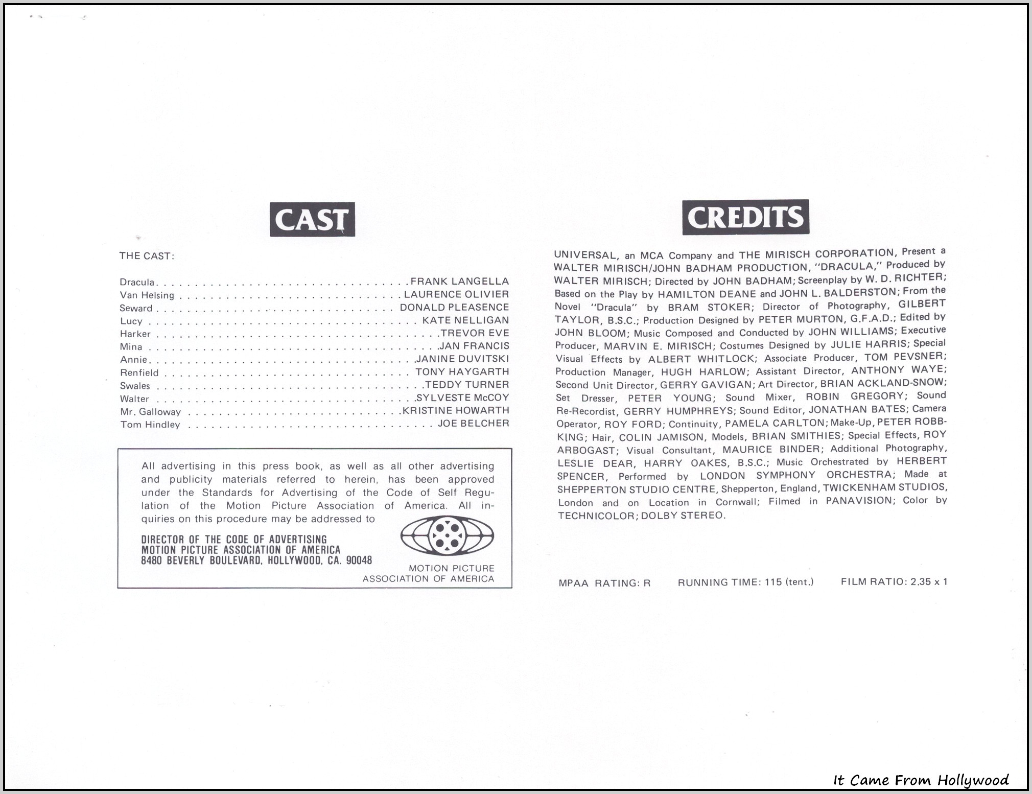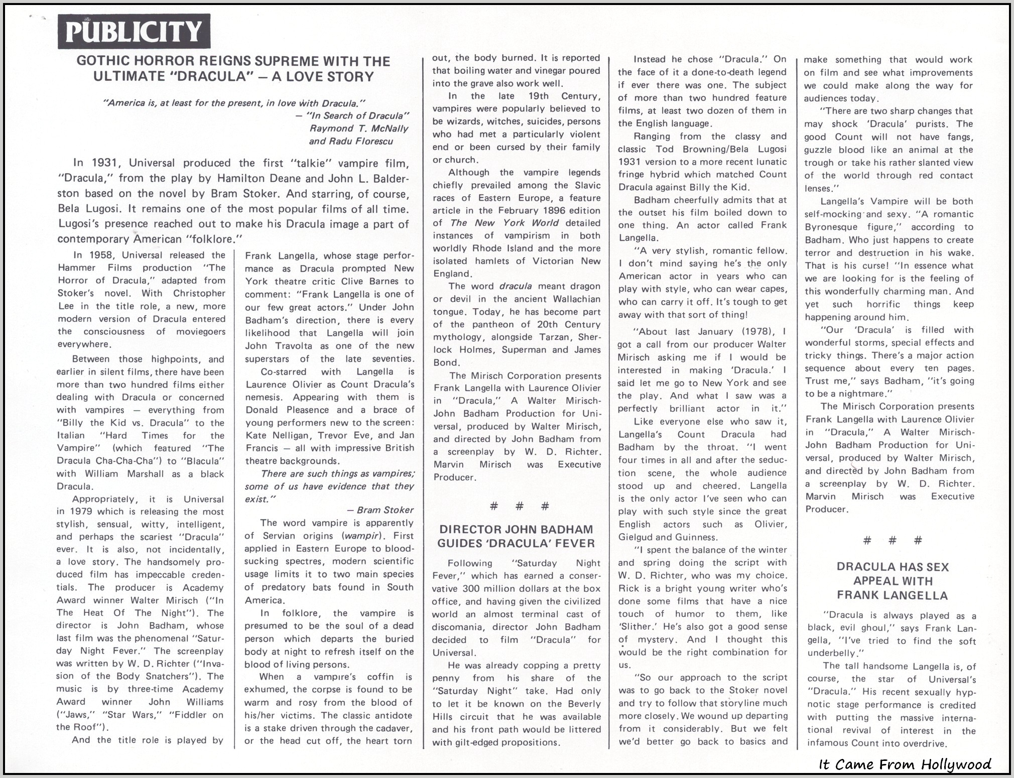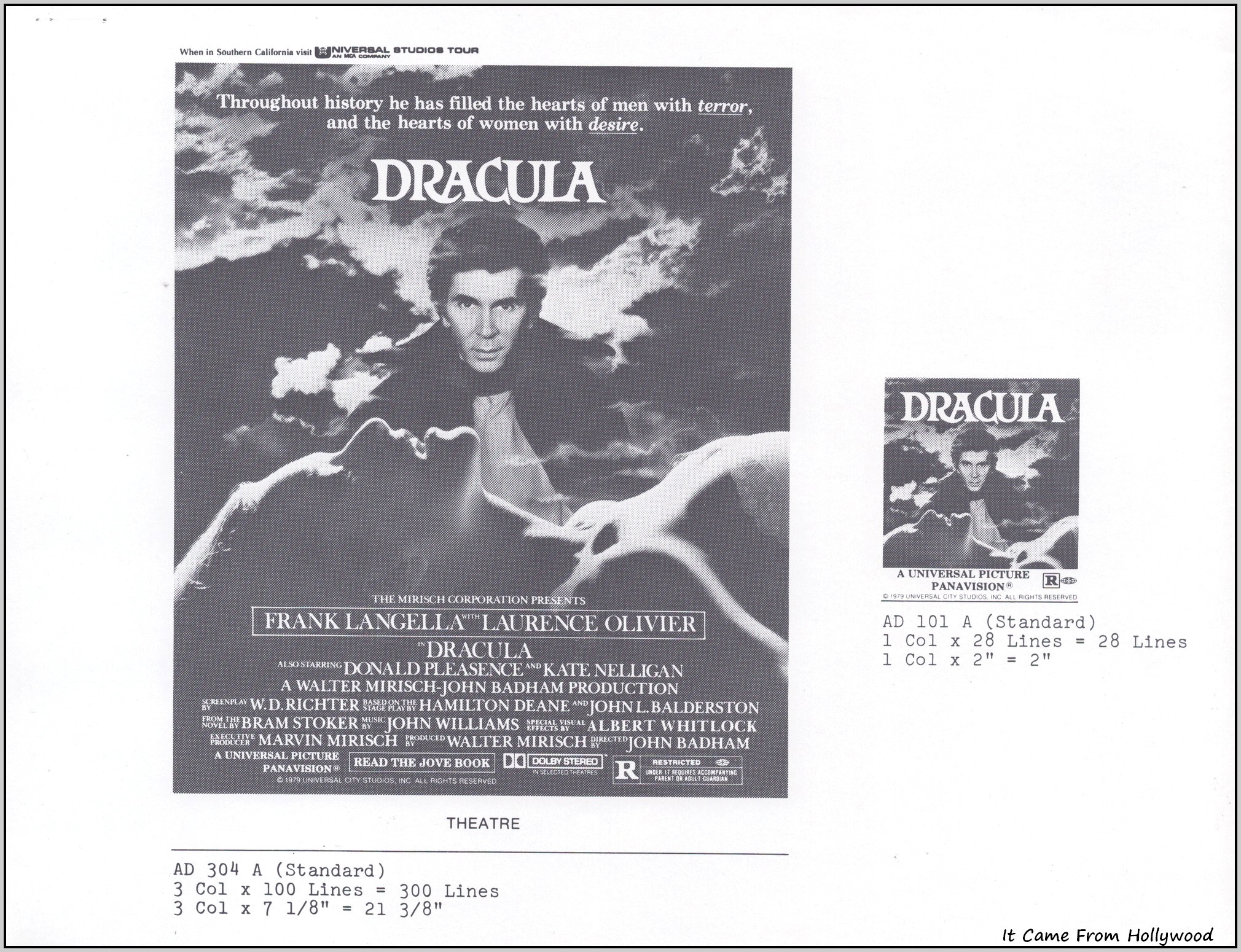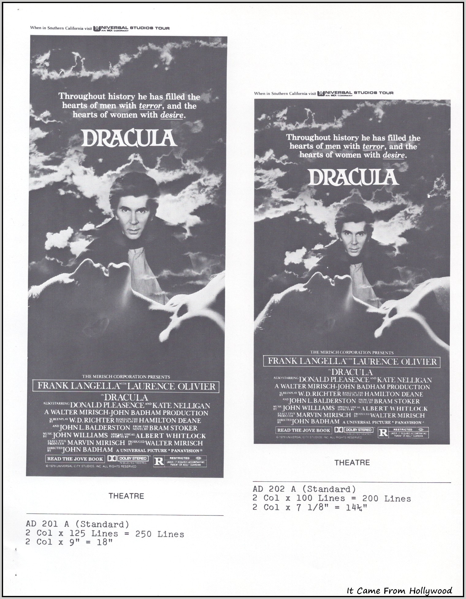 This pressbook, courtesy of It Came From Hollywood, is even less formal. By the late 70s, the art of the pressbook had lessened, providing a minimum of promotional information. One cool item here, though, are the cut-out forms to order radio and television spots for the movie. With a minimum of newspaper ads to order, and the Promotion page that directs to “the Universal fieldman in your local area” to request the Promotion Manual, one can see the shift away from the ballyhoo and exploitation that was previously more theater-focused as given in the pressbook. Now radio, and television especially, were the stronger mediums through which movie promotion could be conducted on a larger scale.