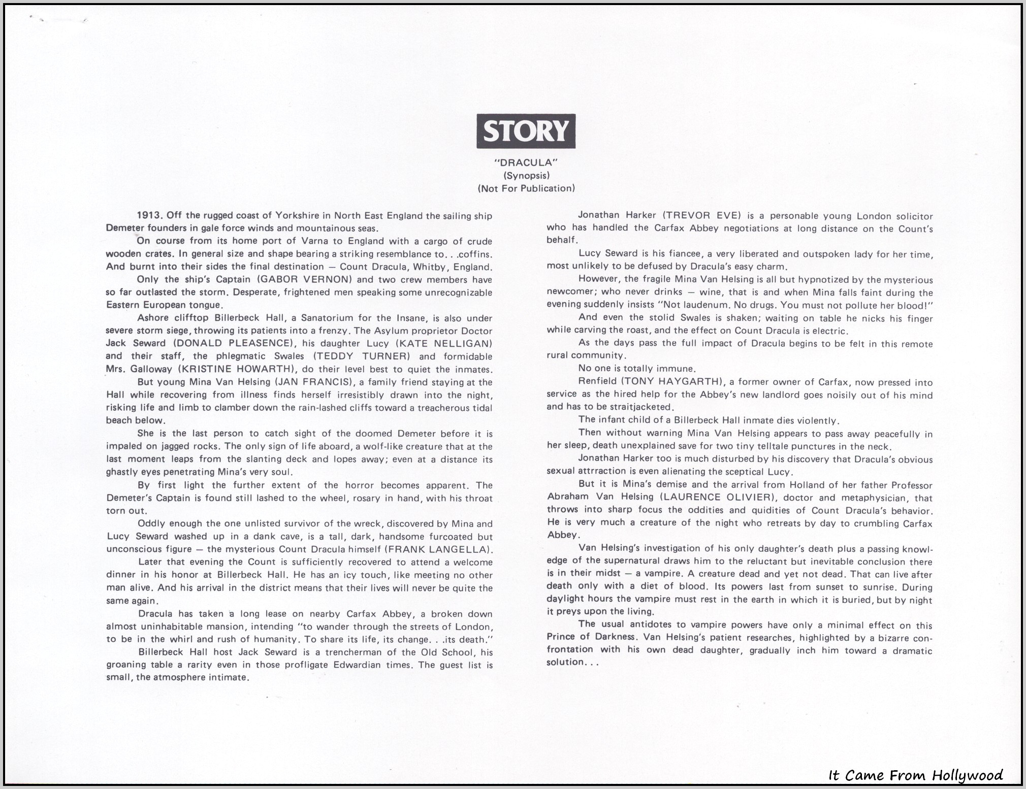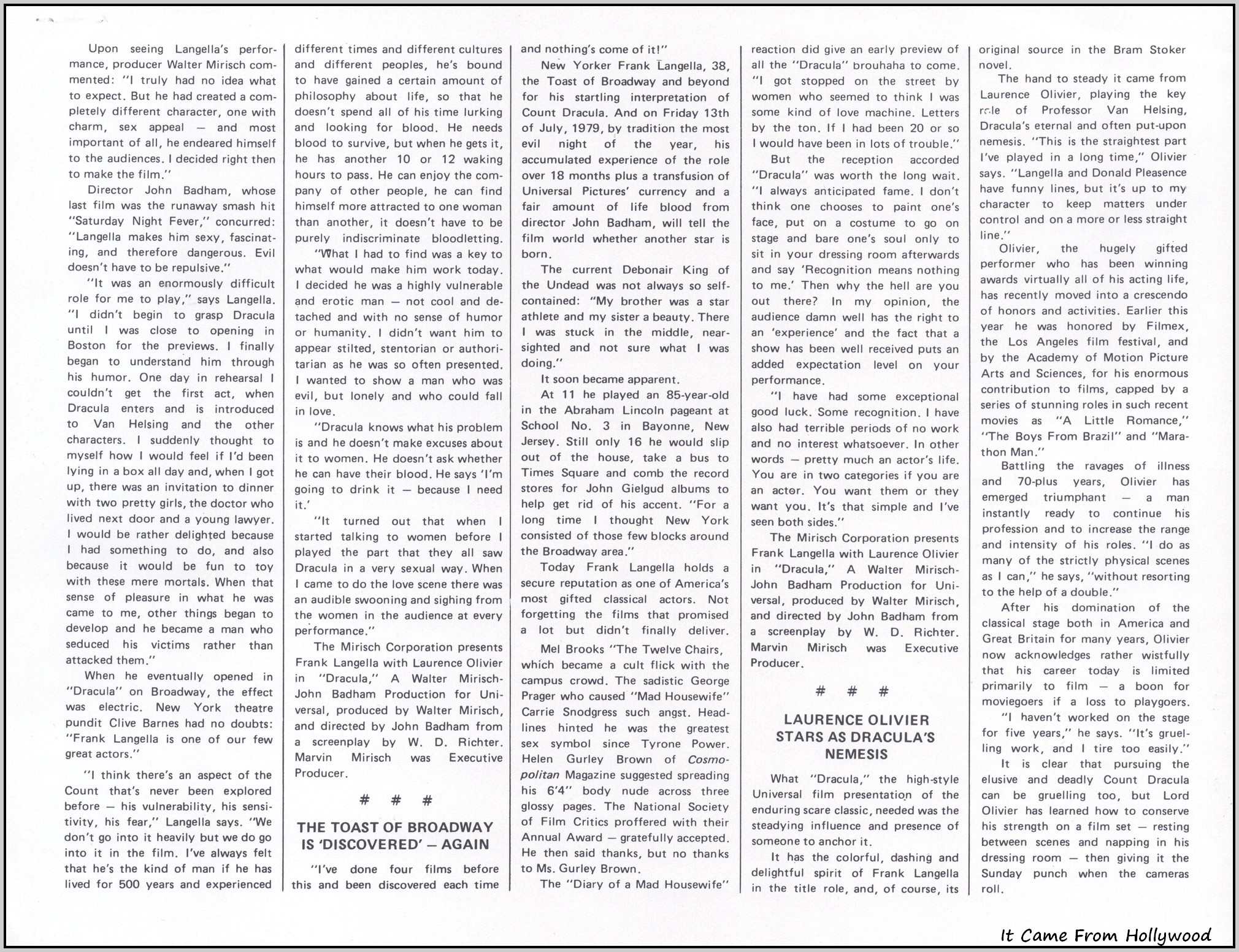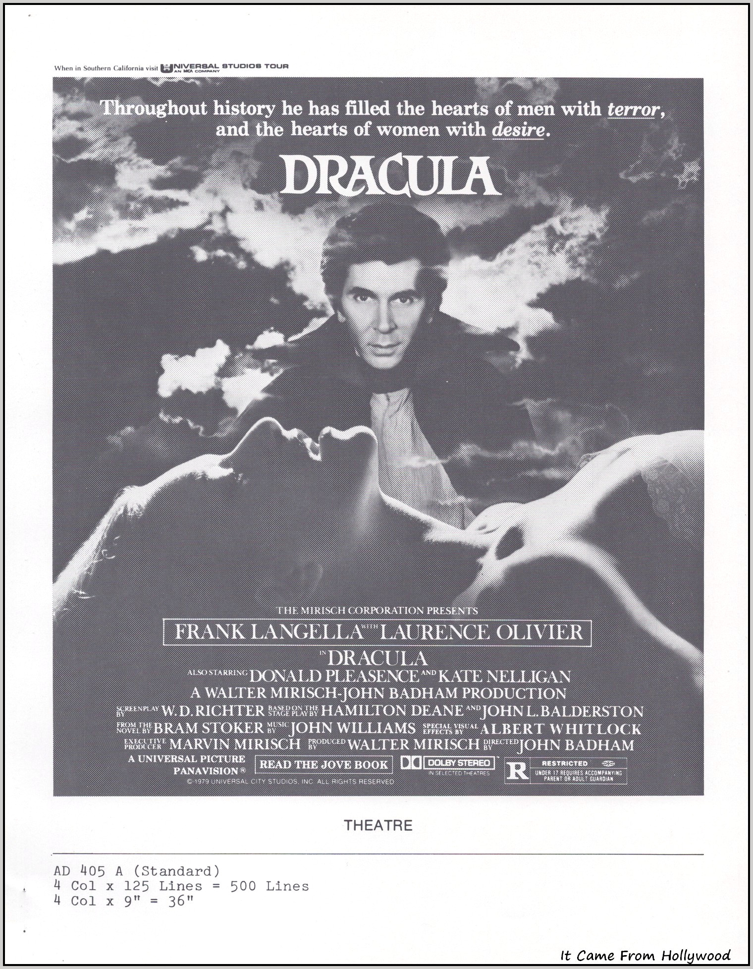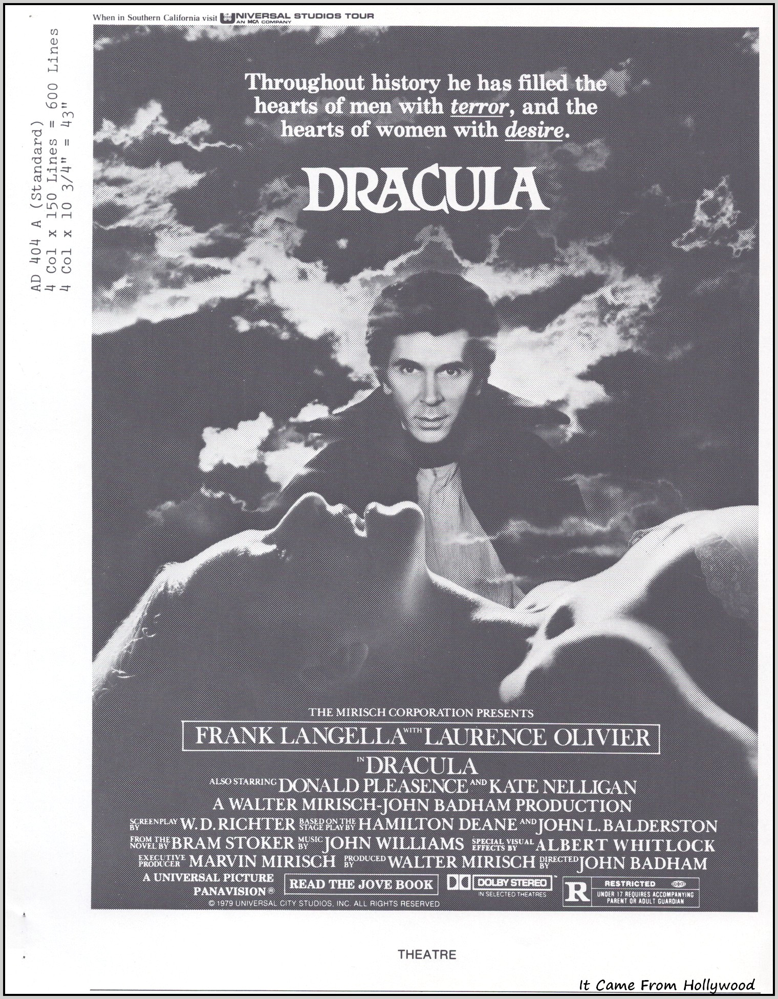 Moving away from the lustful, unrepentantly malevolent vampire of Bela Lugosi and Christopher Lee, Frank Langella’s Dracula is more romantic, more sensual, and more contemporary in artifice, sporting an opened shirt, less formal aristocratic dress that mixes perfectly into the pretty-look sensibilities of the late 1970s into the 1980s. With Laurence Olivier and Donald Pleasance, John Badham’s approach is classy and more gothic teen heart-throb in tone and mood, like Twilight before Twilight, and without werewolves.