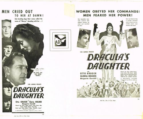 Not sure if I've got all the pages in this Xeroxed copy of the large-sized Dracula's Daughter pressbook, but the fold-out Showmanship pages are exquisitely dense with promotion ideas. I had to split them into sections in order to scan them at a readable resolution, but I provided the complete page-spread to show you how it looks (top and bottom). Possibly the most unusual movie in Universal's horror cycle, even the promotion stresses the "weird feeling" she will give you.