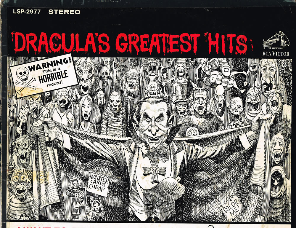 Professor Kinema had this sanguine vinyl bat flapping around his archive shelves, so I thought large scans of the great Jack Davis artwork and monster trading cards would be something you could sink your teeth into. Click graphics to open them, then use your browser’s back button to return to the post. A groovy hit to watusi is included.